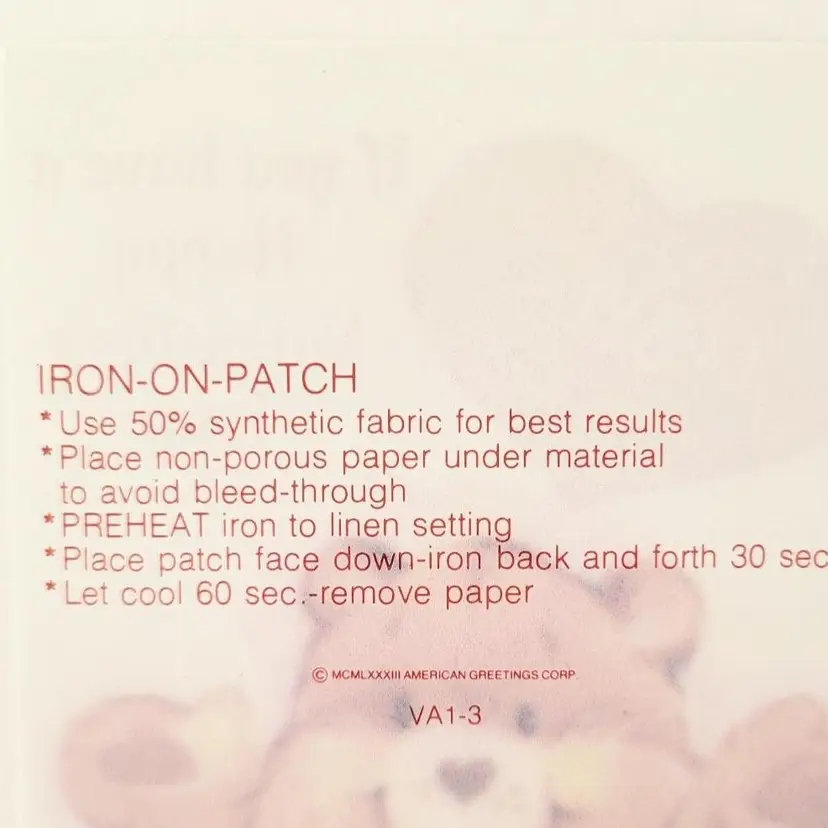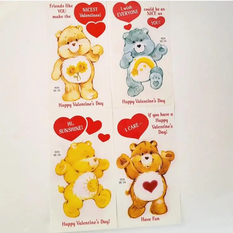 Set of four 1984 American Greetings Iron On Valentine Transfers. Tender Heart Bear, Fun Shine Bear, Wish Bear, Friend Bear. Directions are on the back of each transfer. Each measures 3.75 in x 7 in.