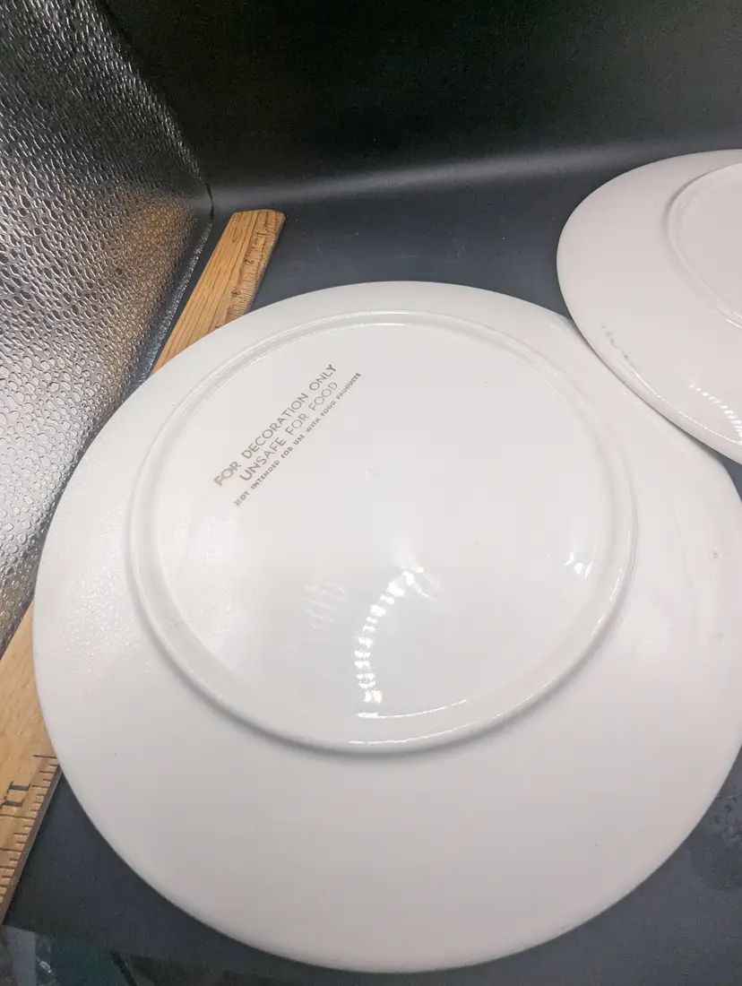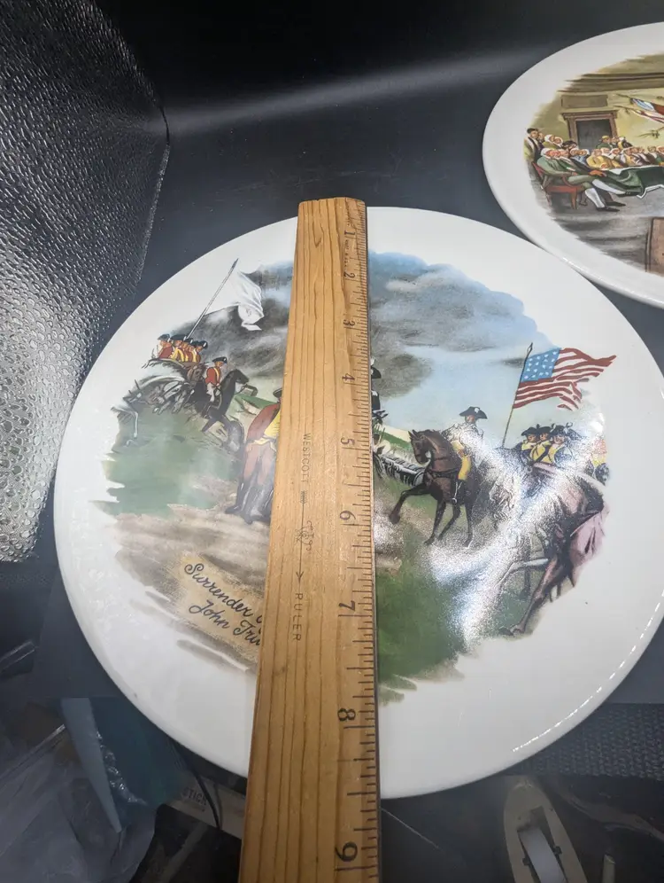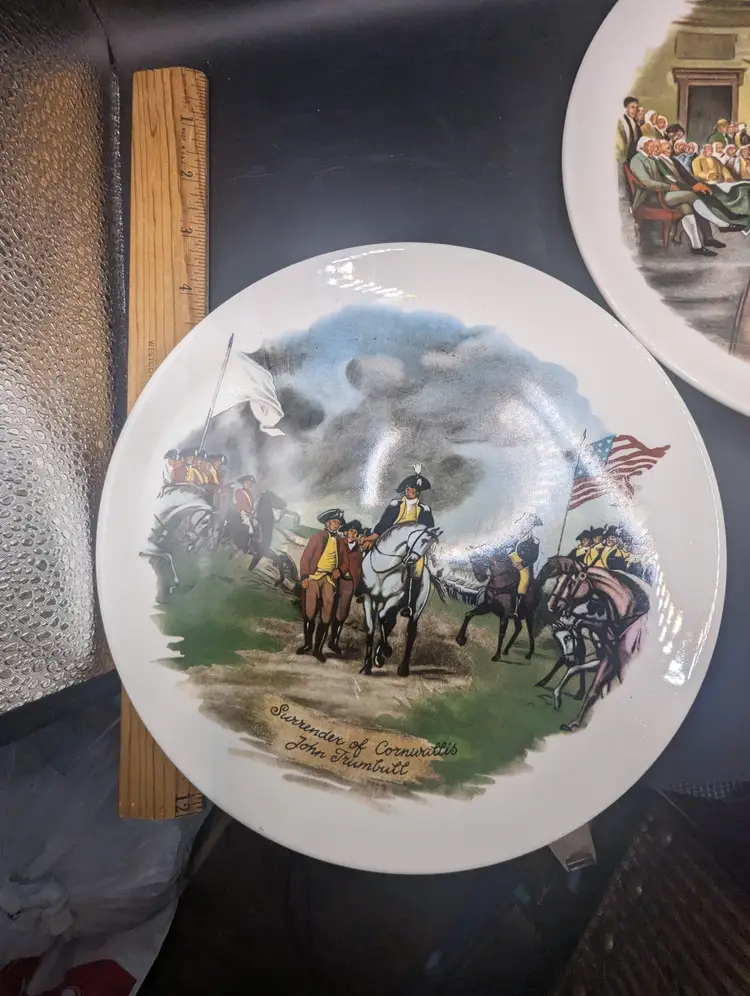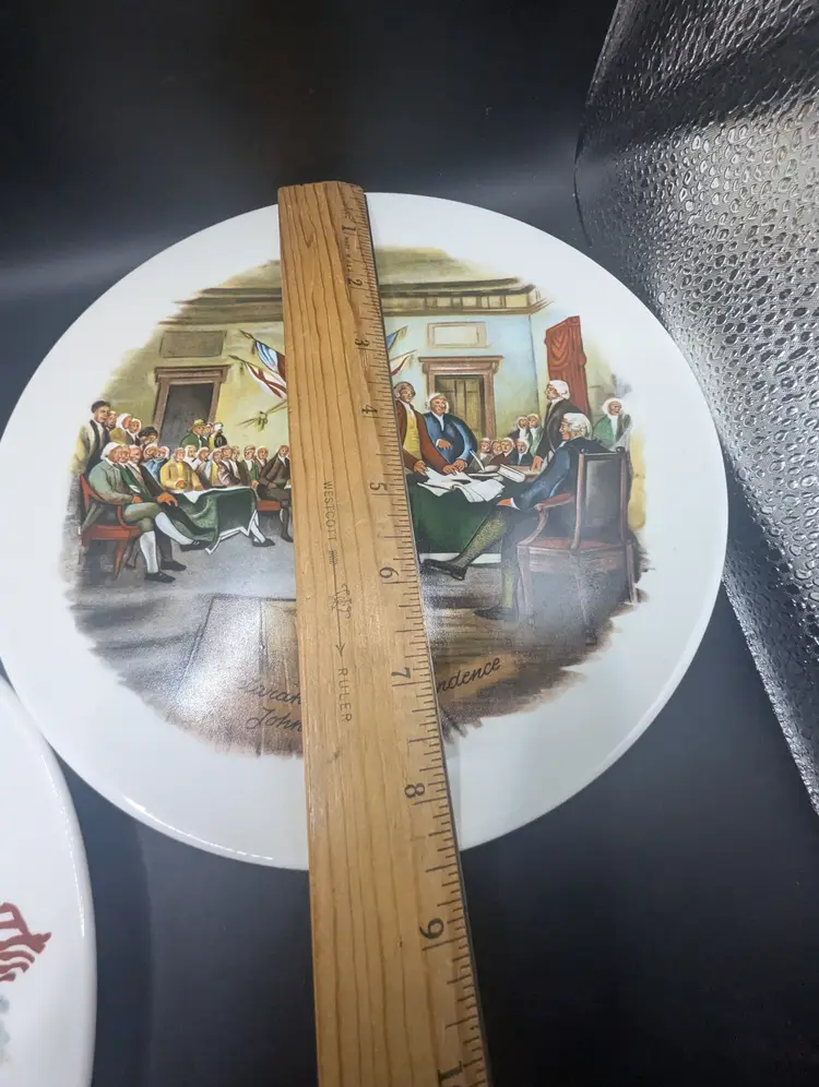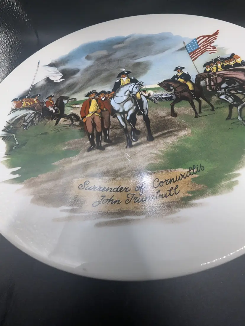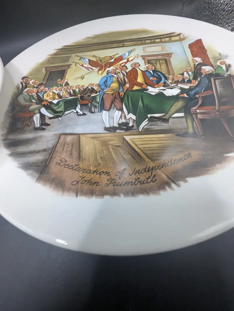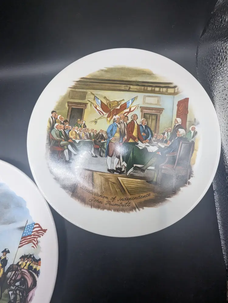 This is a fantastic Vintage American History Collectors Plates By John Trumbull Set Of 2. They depict The Surrender of Cornwallis and the Signing of the Declaration of Independence. They each measure about 8.5 inches in diameter. No chips or cracks. Please see all pictures for condition and measurements. Colors remain vibrant like new.