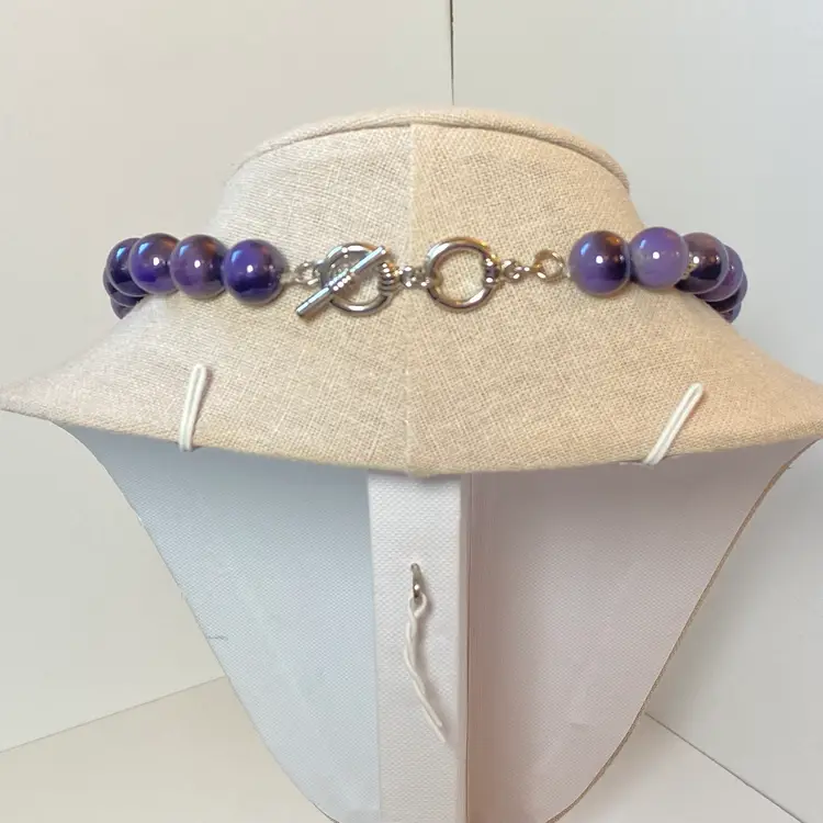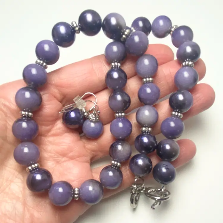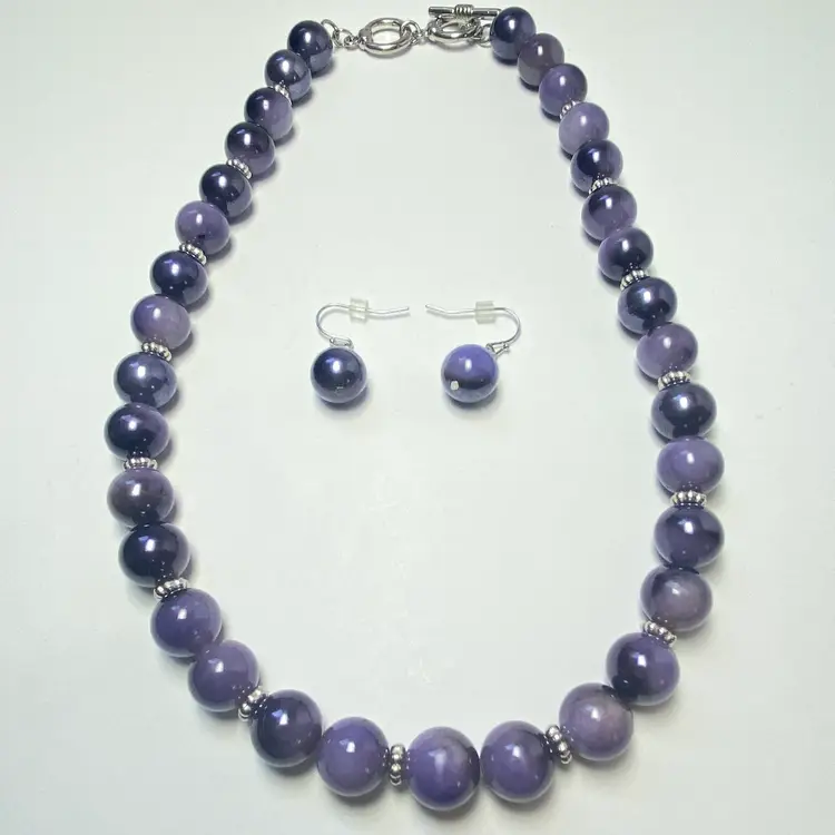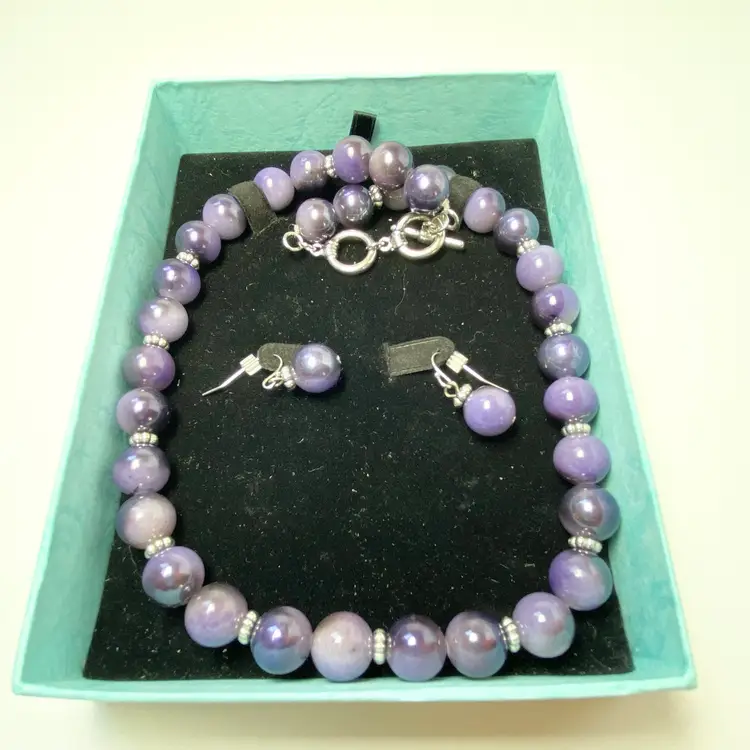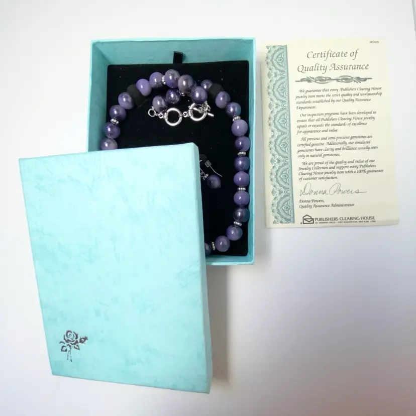 This vintage jewelry set of a necklace and earrings from Publishers Clearing House features a beautiful combination of round amethyst beads and silver tone spacers. The necklace has an adjustable double ring toggle closure. The set comes in its original box and is perfect for any woman who loves handcrafted and artisan jewelry. This jewelry set is a must-have for any collector or fashion-forward individual who appreciates the beauty of vintage pieces.
