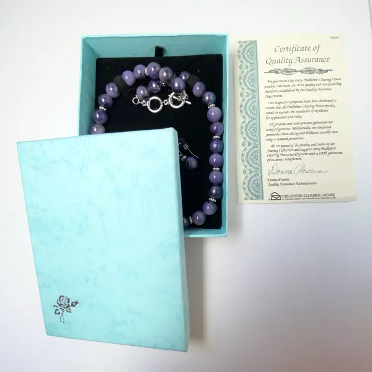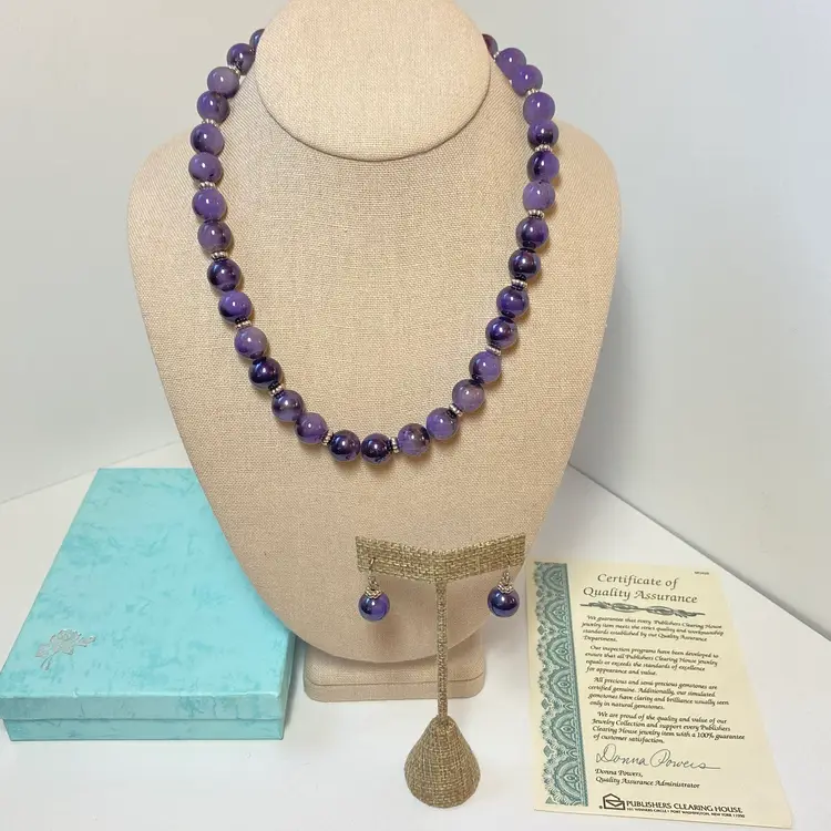 Vintage Amethyst Bead Publisher Clearing House Necklace Earring Set Original Box. Very good vintage condition. Please see pictures for details. SMOKE FREE/PET FREE HOME Approximate measurements: Necklace length- 19" Earring length- 1"