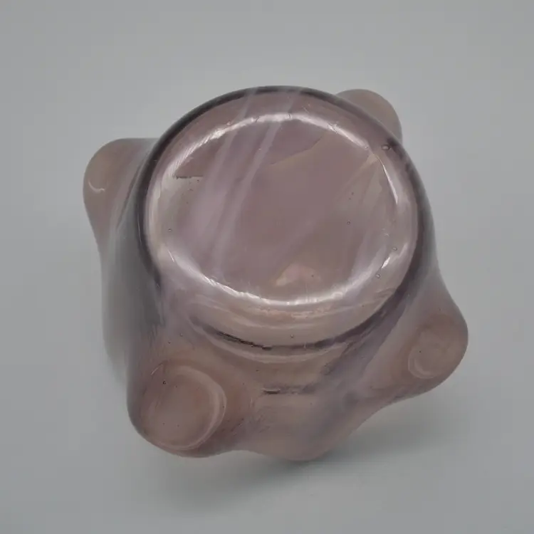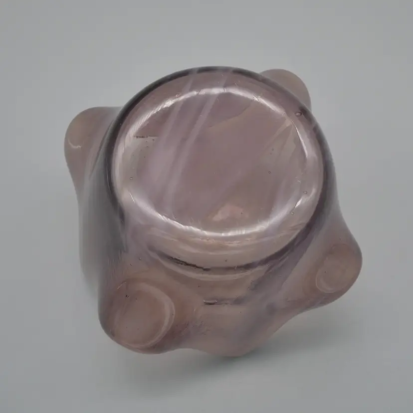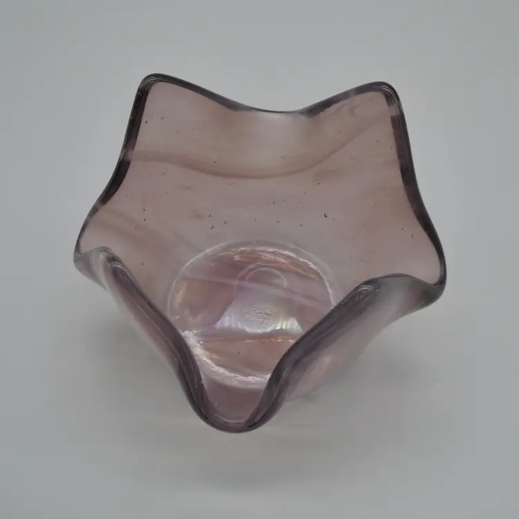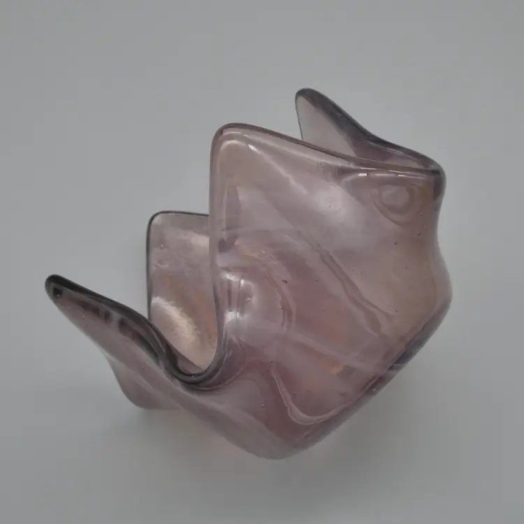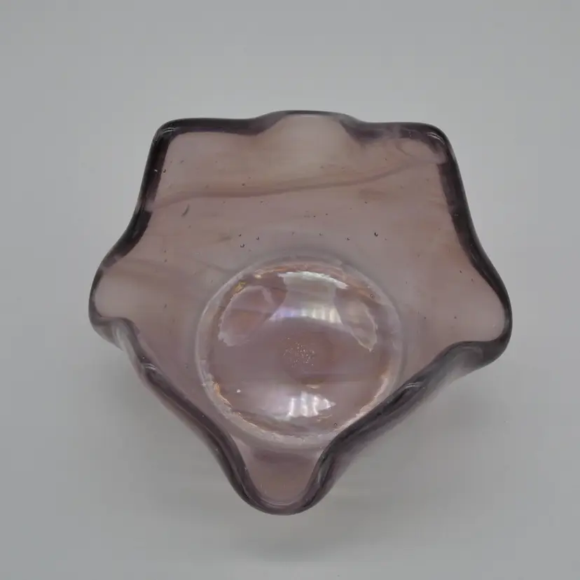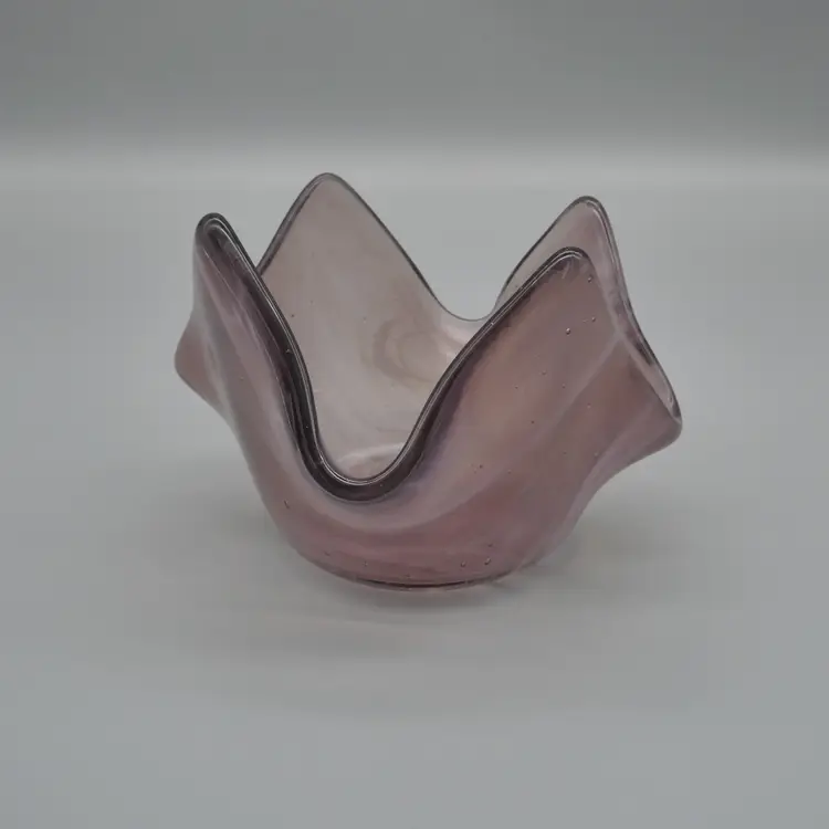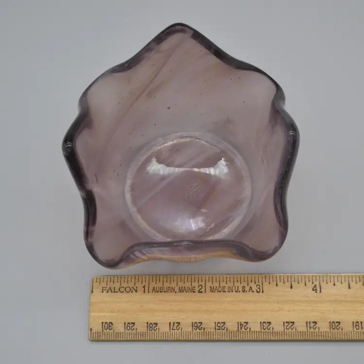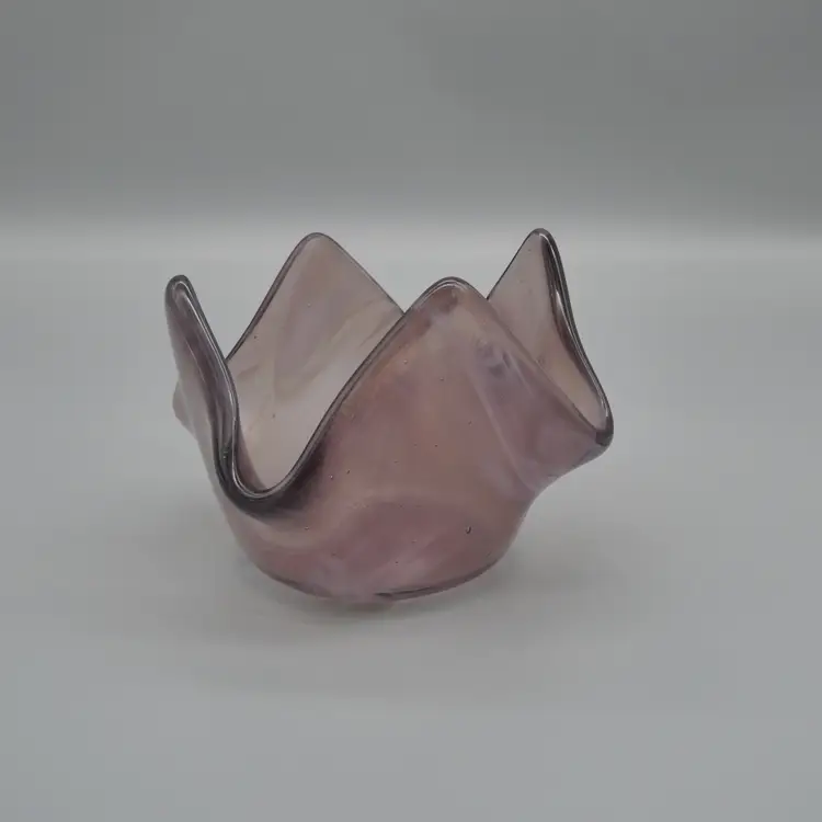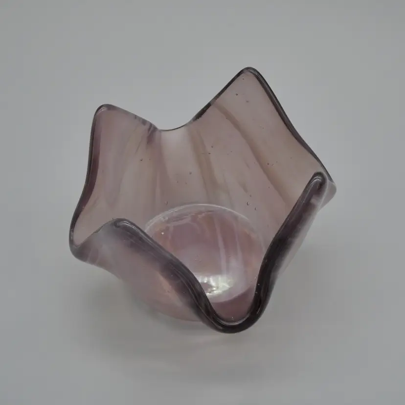 Featuring an amethyst purple handkerchief-shaped glass dish Hand-formed translucent slag glass with milky swirls Perfect for tealight candles, small votives or as a trinket dish Measures overall about 4-3/8" across x 3" tall at its tallest point with a 2-1/2" base Weighs about 8.5 ounces before being packaged to ship