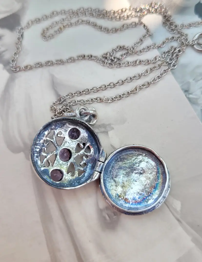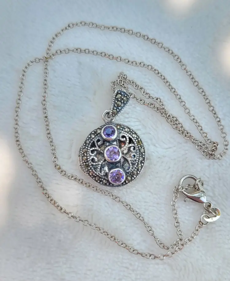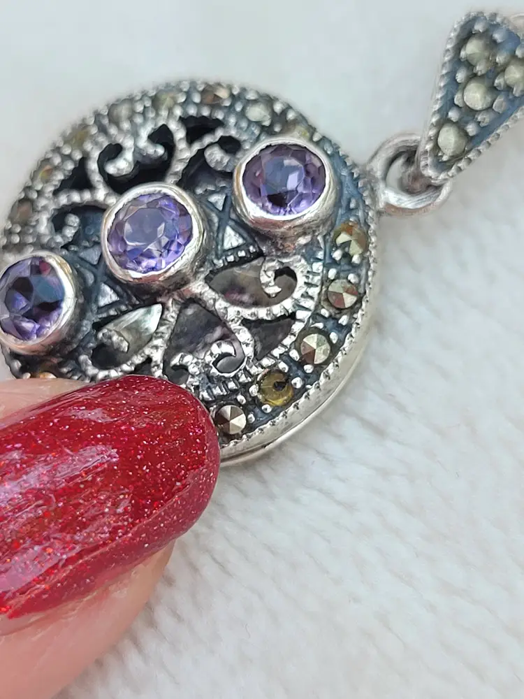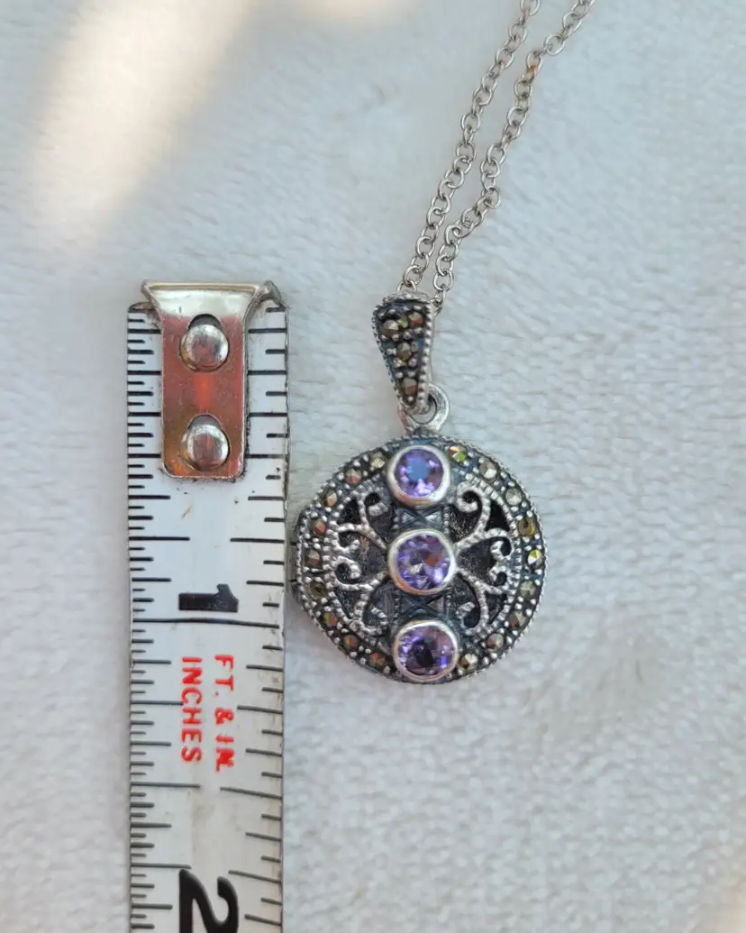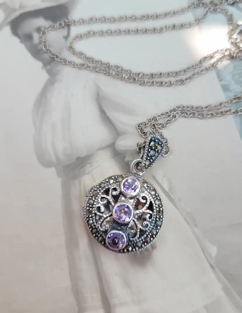 Beautiful sterling pendant locket with a trio of genuine amethysts and marcasite accents, on a 19" chain. This is from an estate and circa 1990s, in good condition with the exception of a couple missing marcasite stones that I've pointed out in pictures. Please see pictures for details and measurements.