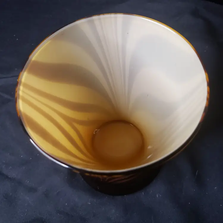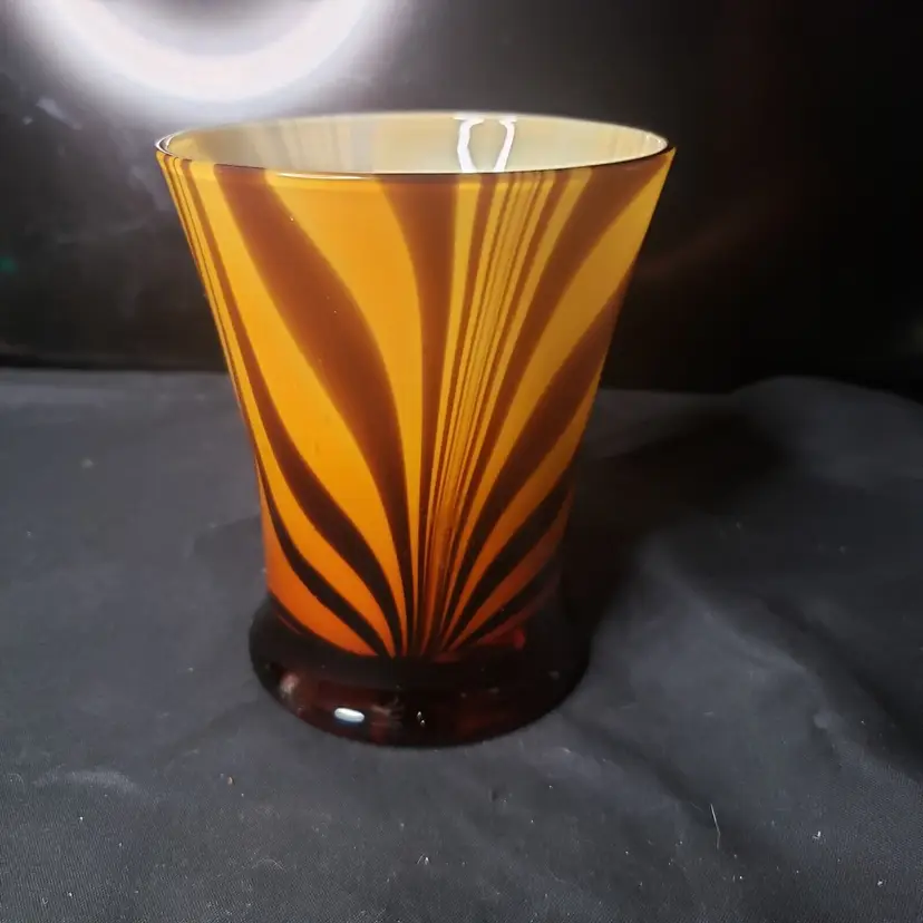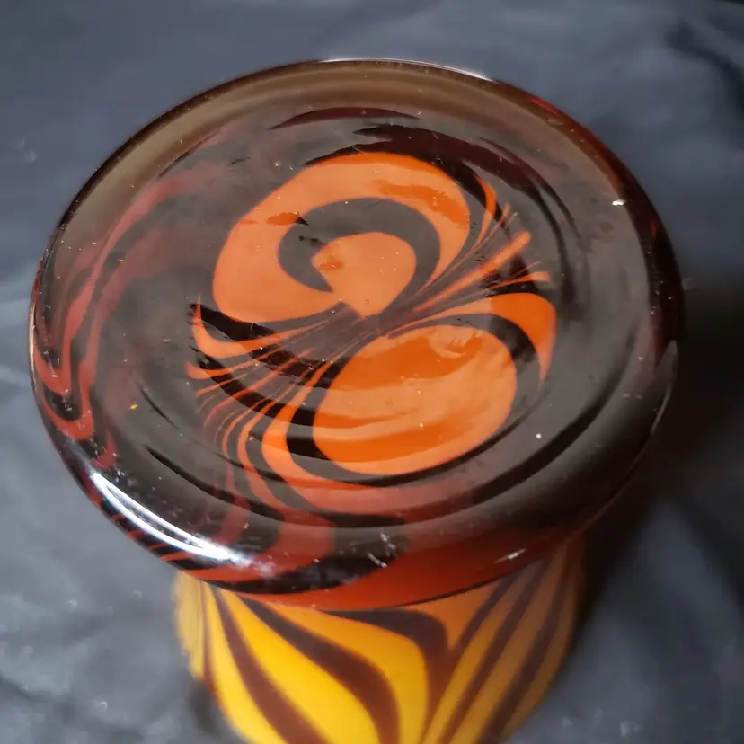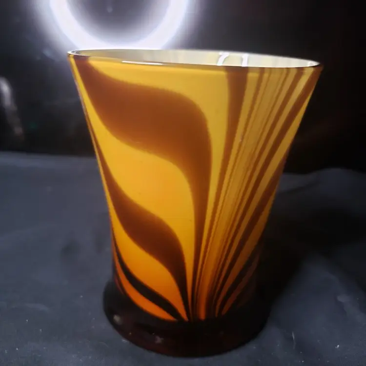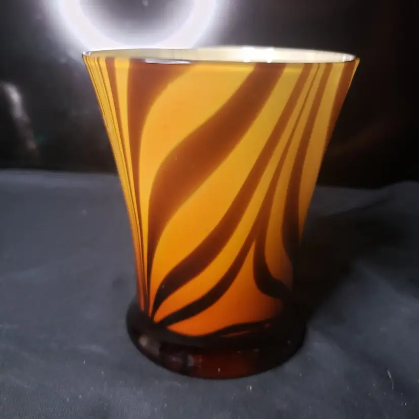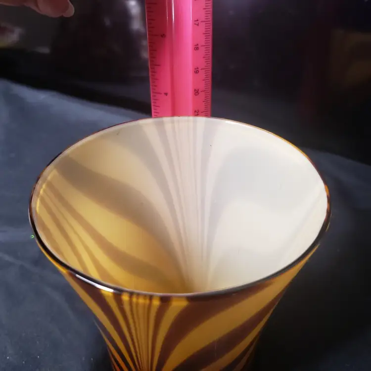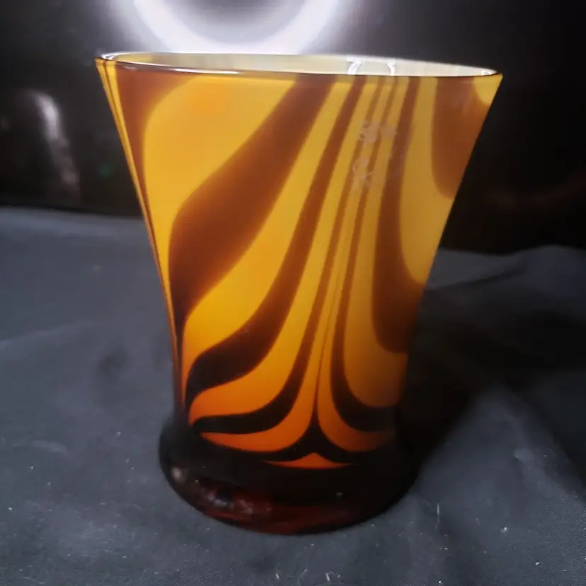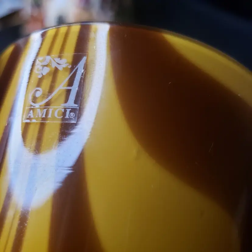 Brand: Amici Pattern: Swirl Type: Vase Color: Amber Style: Mid-Century Modern Material: Glass Production Style: Art Glass Production Technique: Art Glass Subject: Abstract Art
