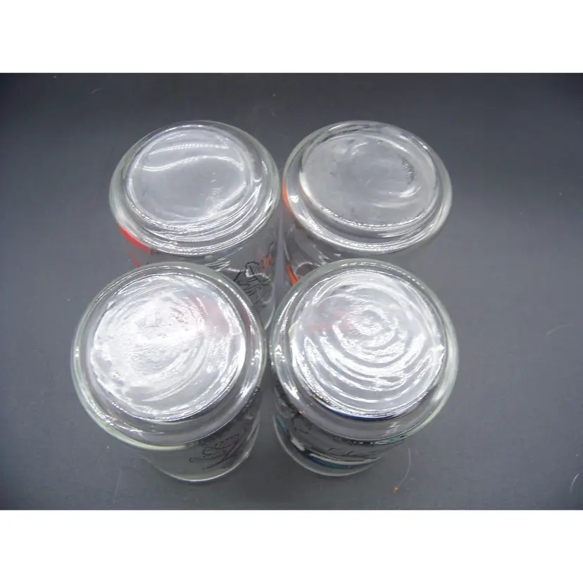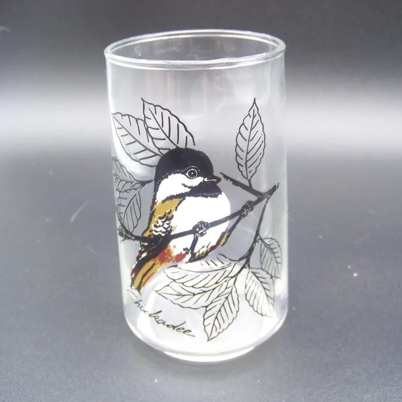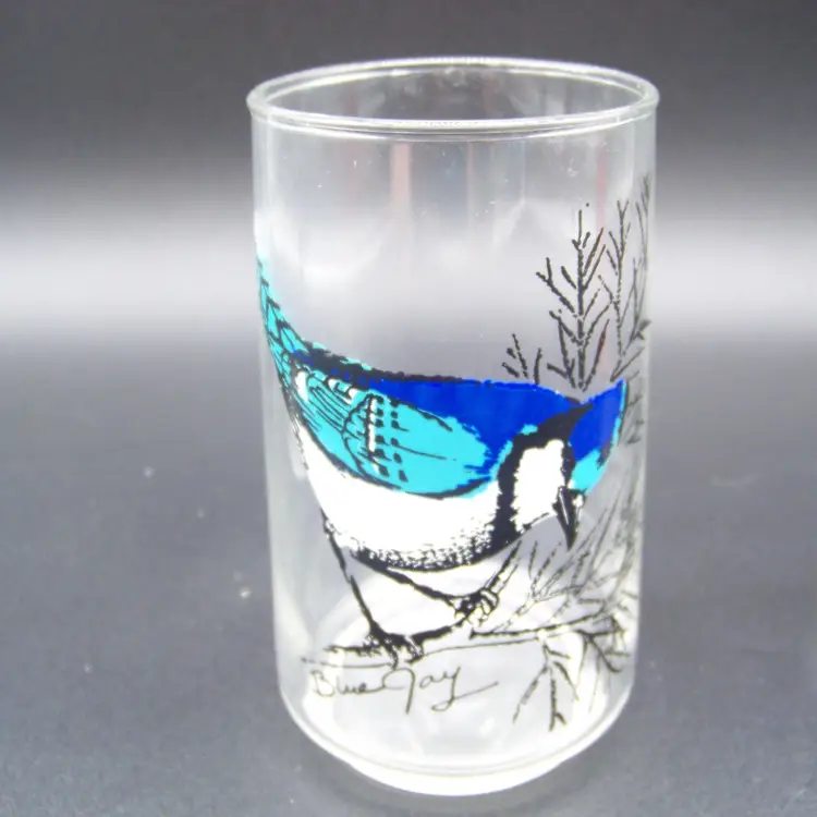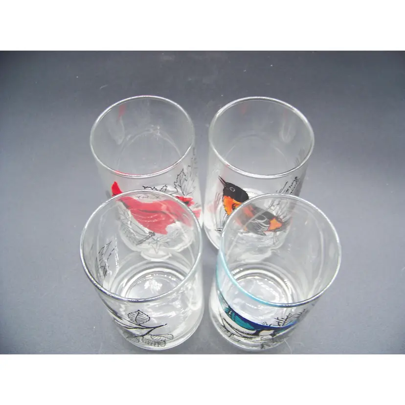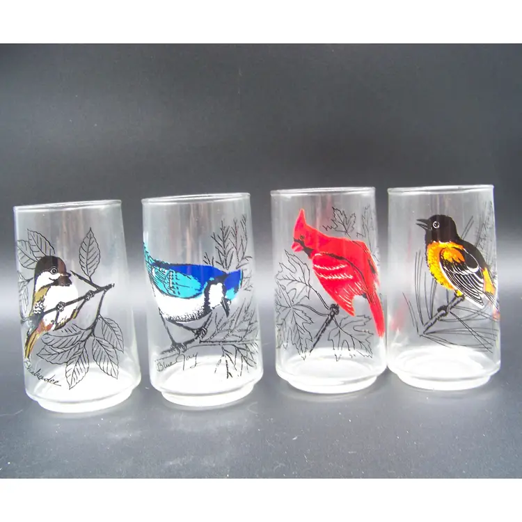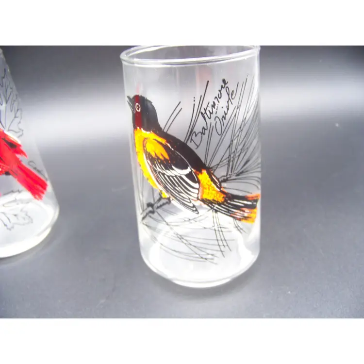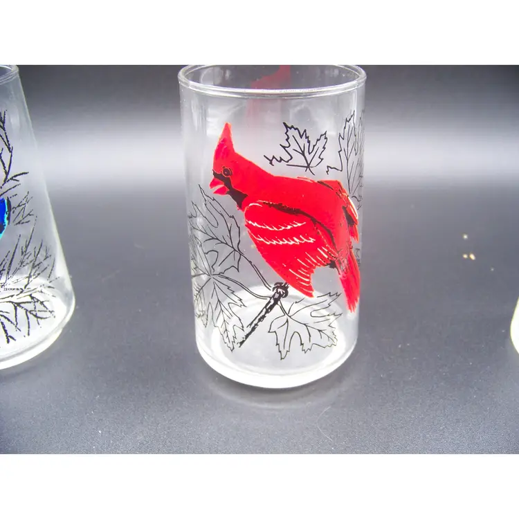 Vintage set of anchor hocking bird glasses with blue jay, cardinal, oriole, and chickadee. They are 5" tall and 2.5" diameter at the top rim. No chips or cracks.