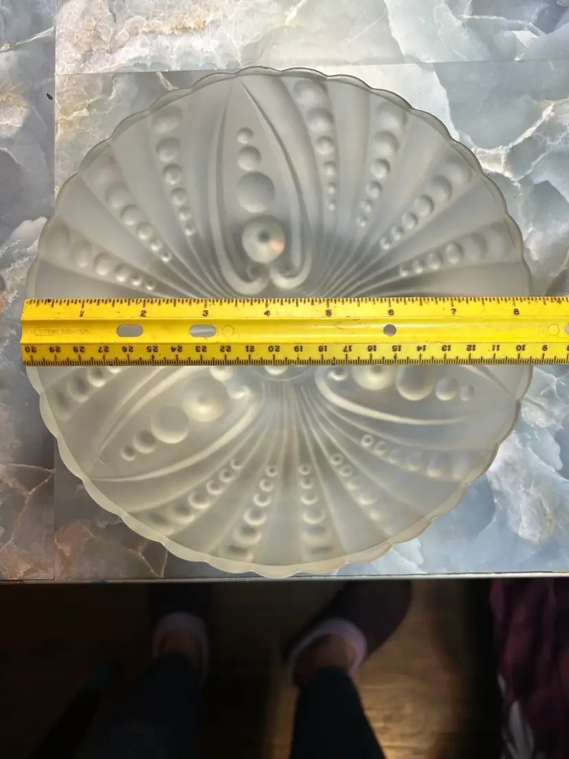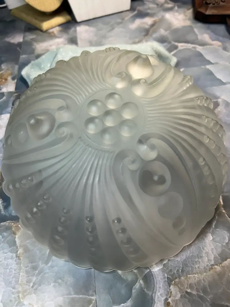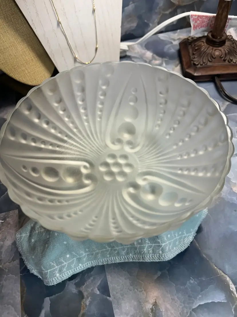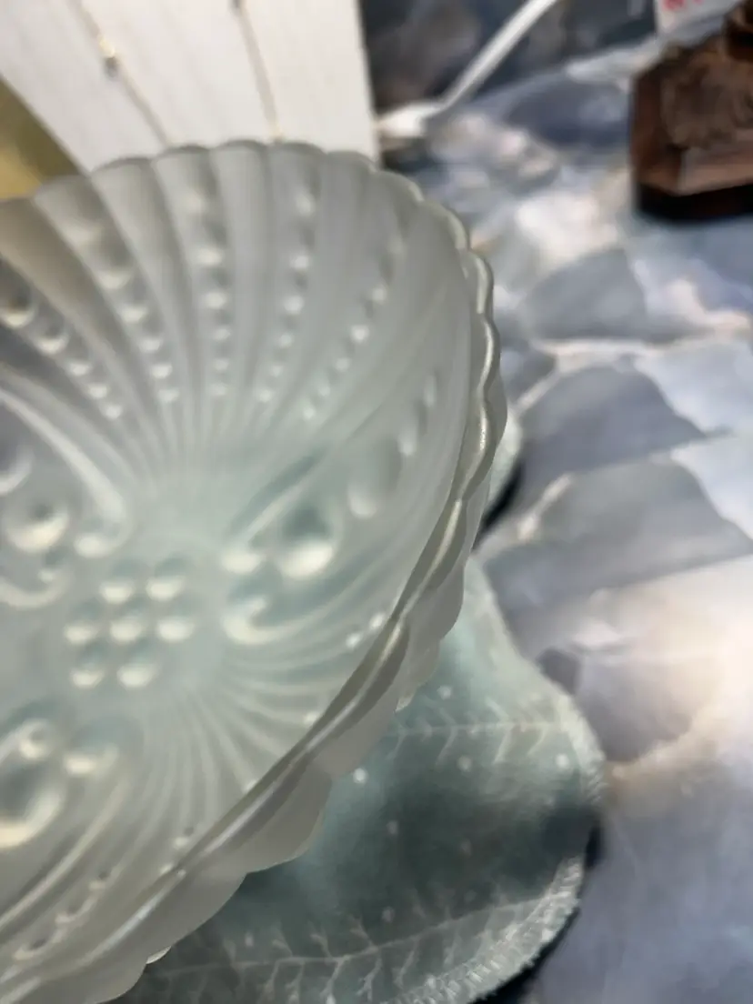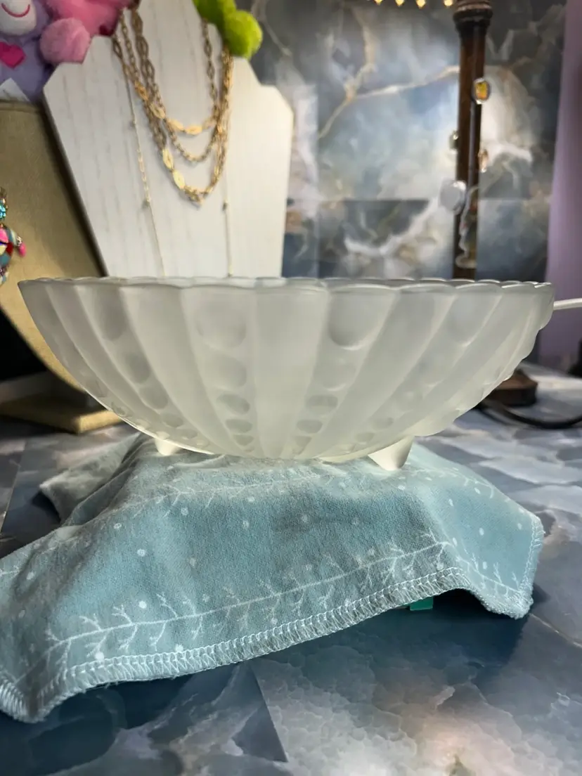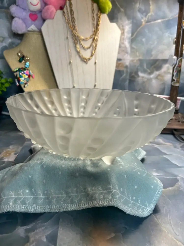 This is a vintage 1960s Anchor Hocking Oyster Pearl Burple Bubble clear frosted glass footed bowl.