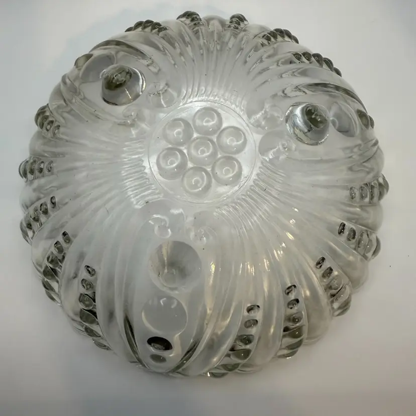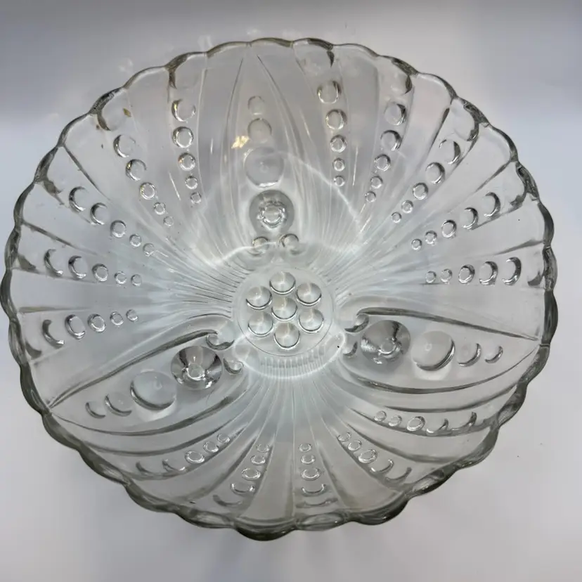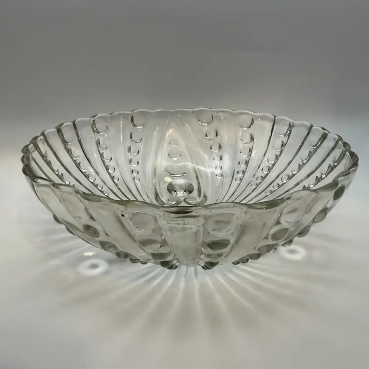 It is a clear pressed glass bowl with a unique raised bubble design, also known as the "Burple" pattern. The pattern dates from the 1930s to 1950s and is part of the "Inspiration" line by Anchor Hocking. The bowl features a ribbed and bubble design on the exterior, with the largest bubbles forming three small feet. It is suitable for serving desserts, berries, salads, or as a decorative item