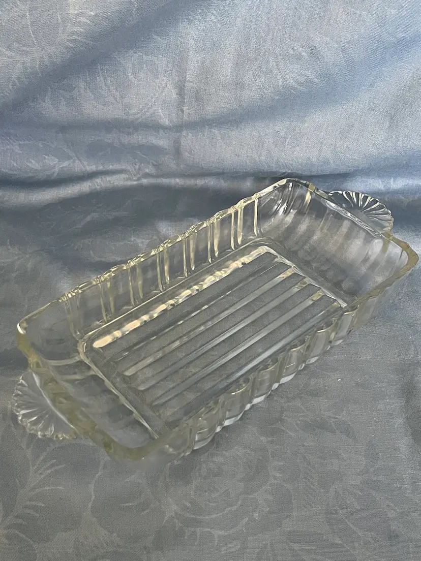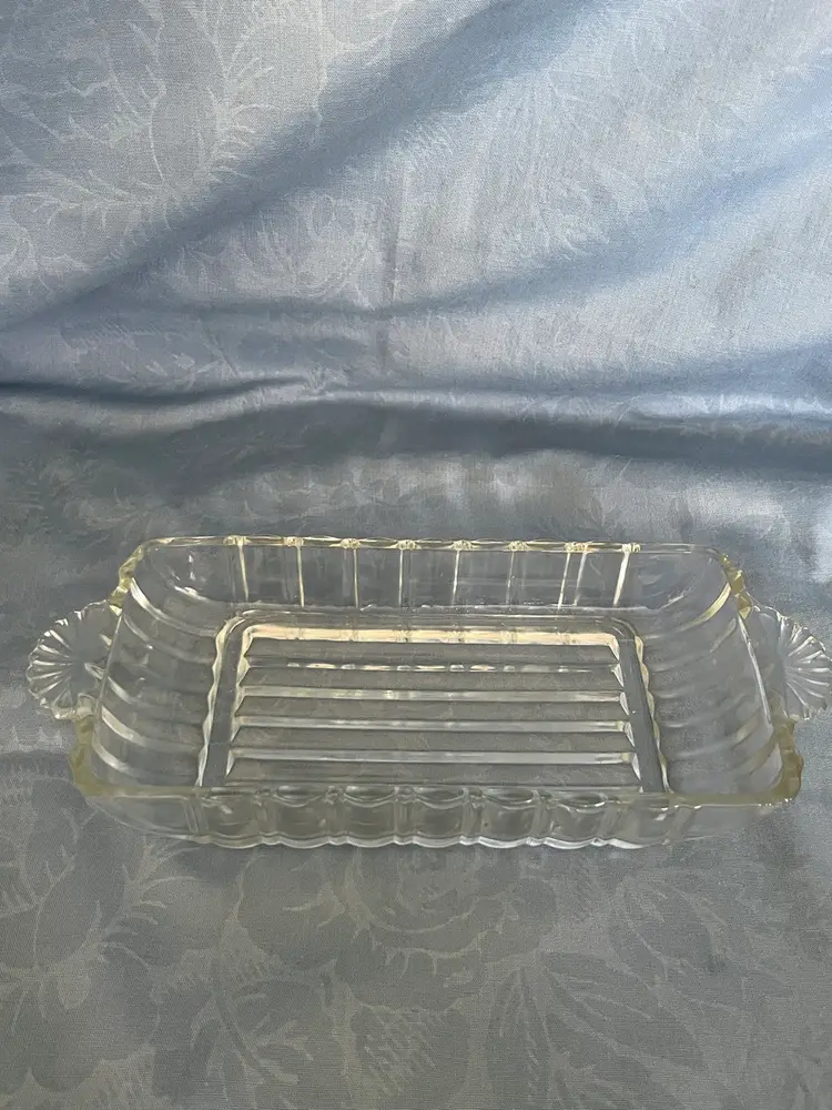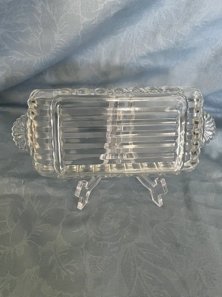 Vintage Pressed or Cut Anchor Hocking relish dish. It has a rectangular shape and is perfect as a serving dish for candy or nuts as well as relishes. This lovely dish is in excellent condition and is approx. 8 1/2 inches long and 3 3/4 inches wide.