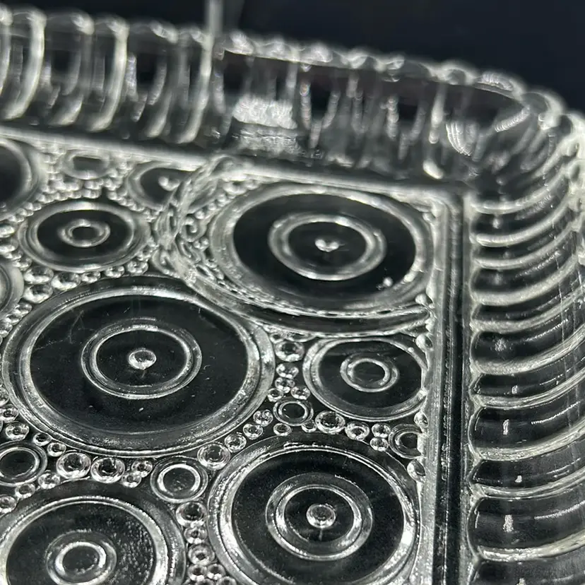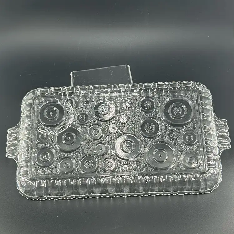 These are vintage anchor, hocking, colonial lady clear glass snack plates from around the 1950s. It features the bubble design. I have four of these in stock. They are all in excellent condition. No chips no cracks. They are 11 inches wide and almost 6 inches across