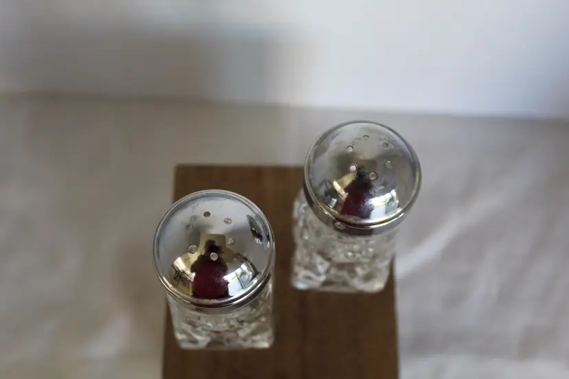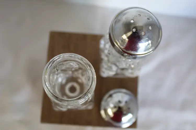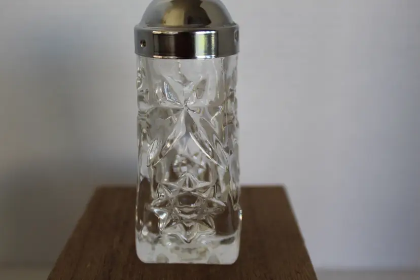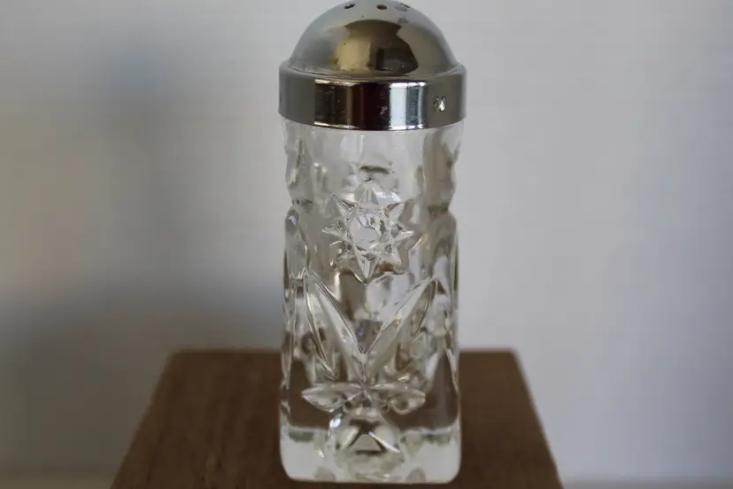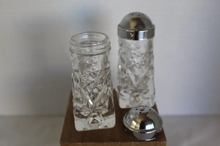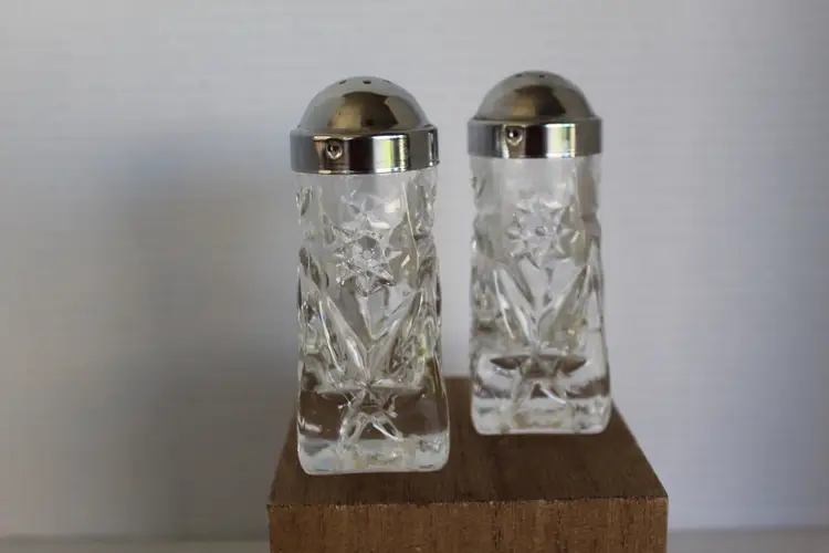 This Vintage Anchor Hocking Cut Glass Salt & Pepper Shaker Set features a Star of David pattern on square-shaped shakers made of clear glass. Manufactured in the 1960s, these Mid-Century Modern pieces are part of the Early American Prescut/EAPC product line. With a glossy finish and pressed glass production style, these decorative shakers add a touch of elegance to any table setting. Made in the United States, this set of 2 shakers stands at 4.25" in height, showcasing the craftsmanship and design of the era.