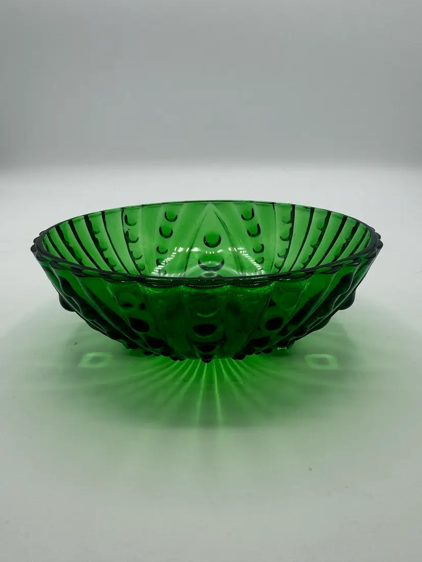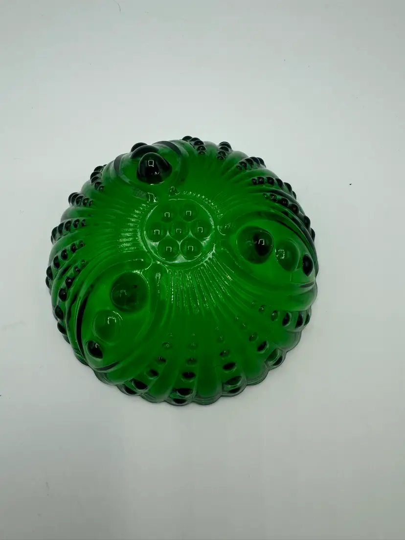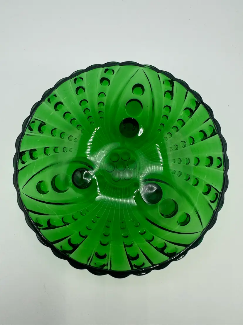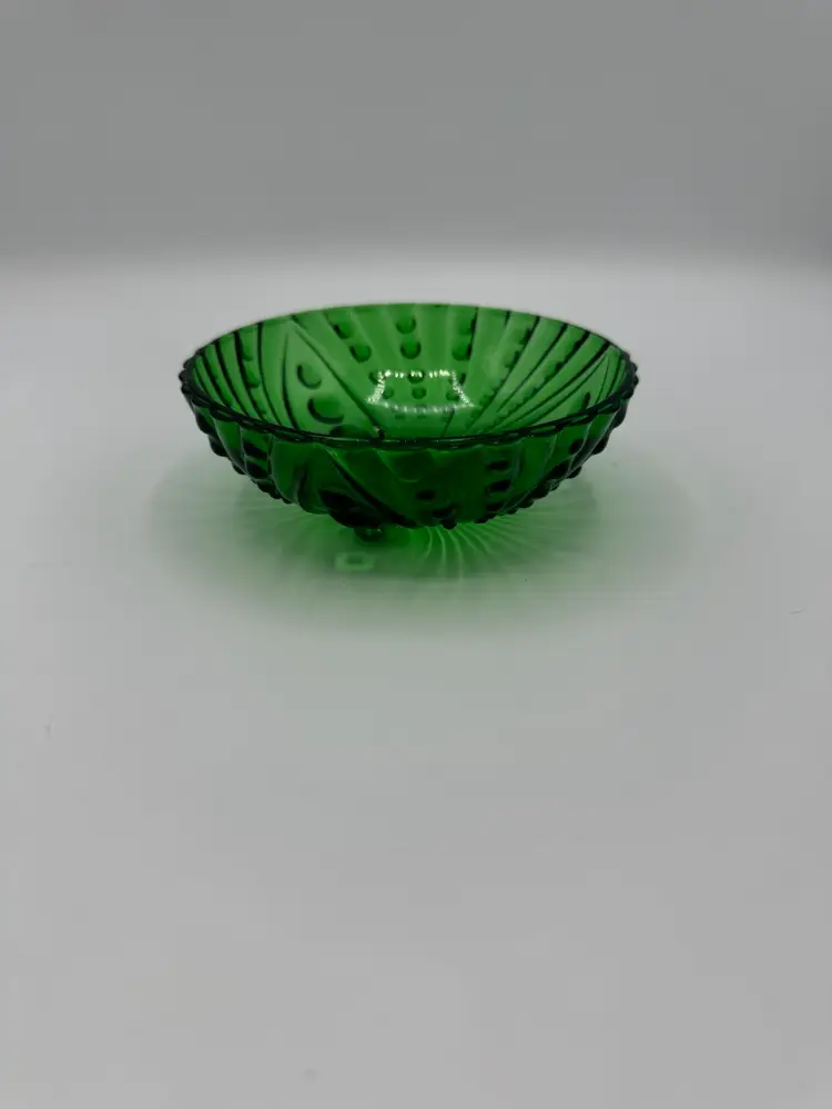 Add a touch of vintage charm to your home decor with this beautiful emerald green footed glass trinket dish/bowl from Anchor Hocking. The pressed glass production style adds unique texture and durability to this original piece. Use it for all occasions, from serving trinkets to holding small decorative items. The round shape and green color make it a perfect addition to any table setting or display. Made in the United States with high-quality glass material, this vintage piece is a must-have for any collector or lover of unique decor. Excellent condition no chips or cracks. Measures 4 3/4" X 1 3/4"