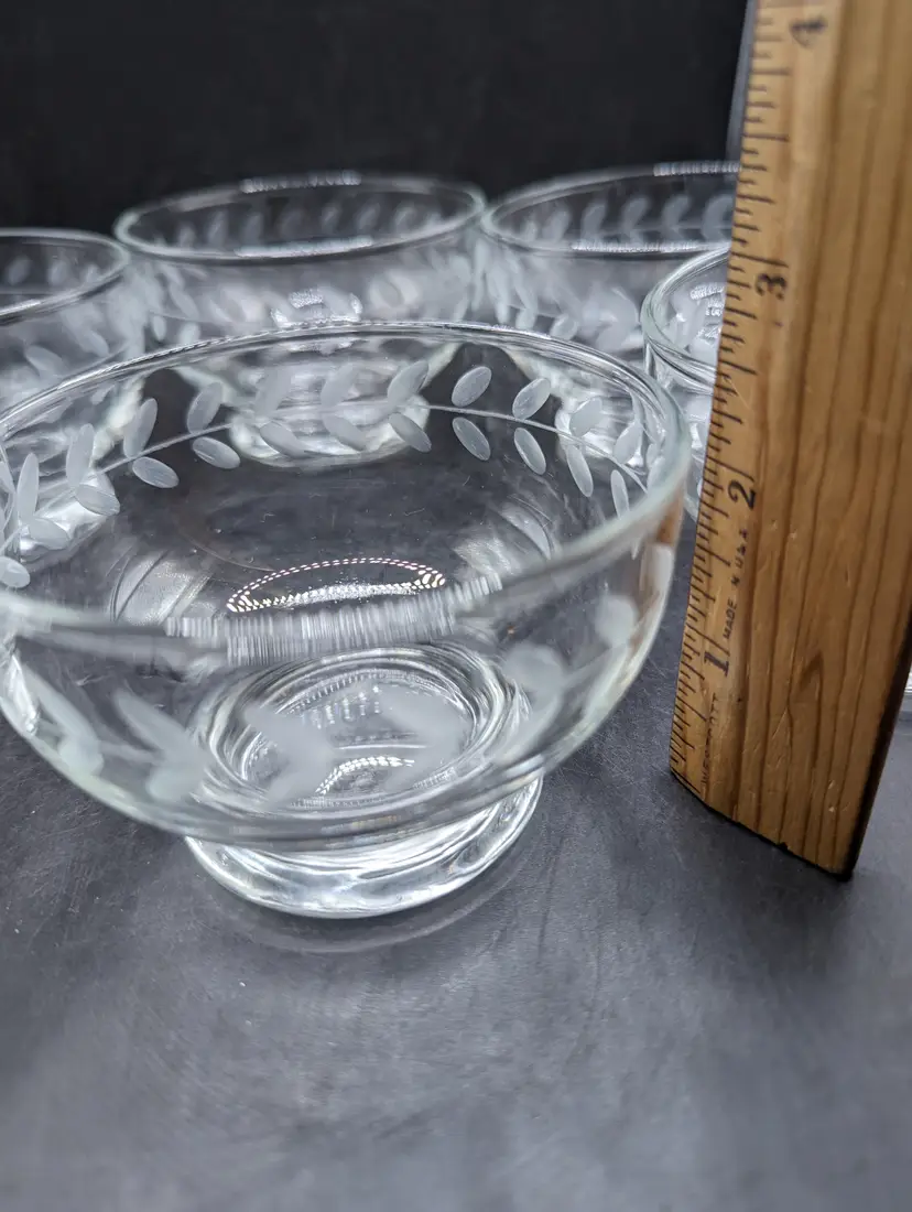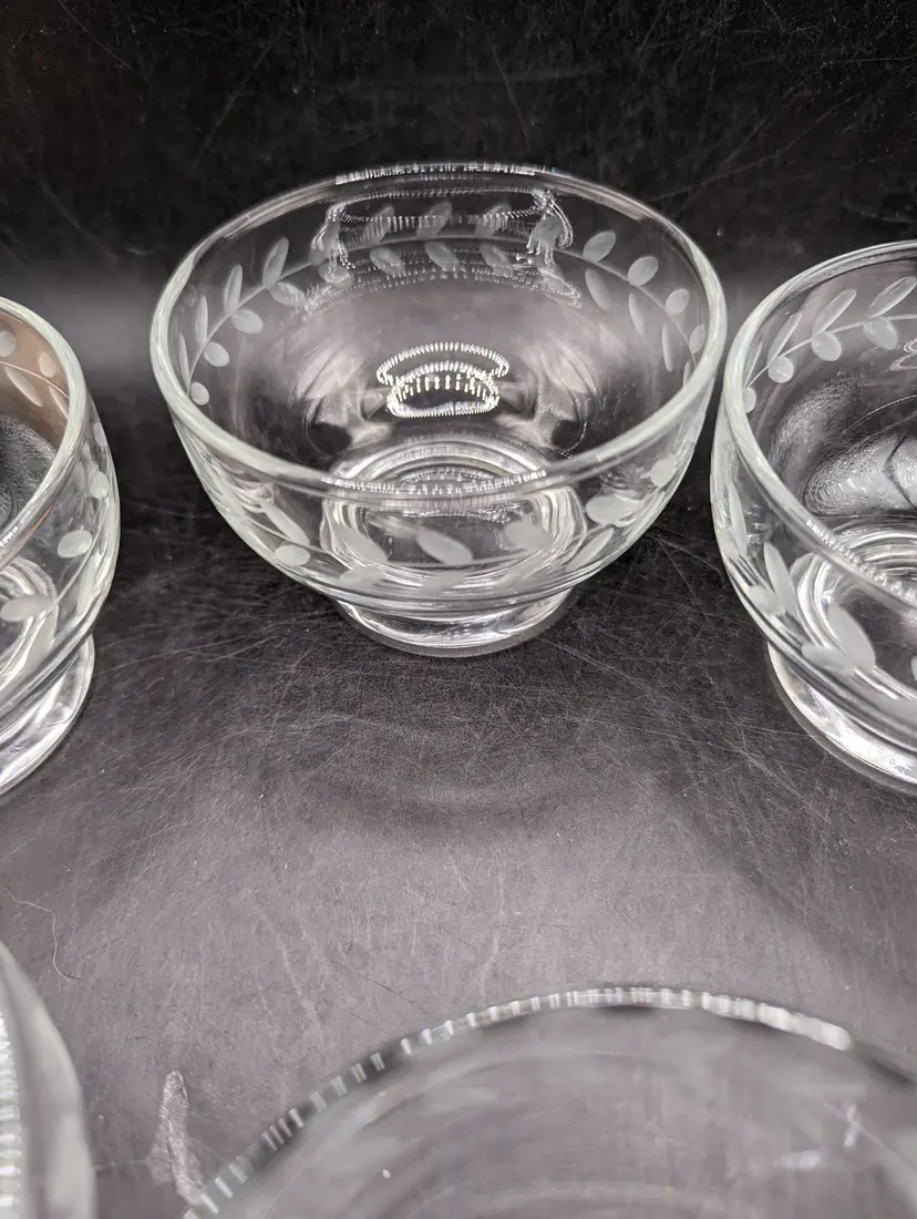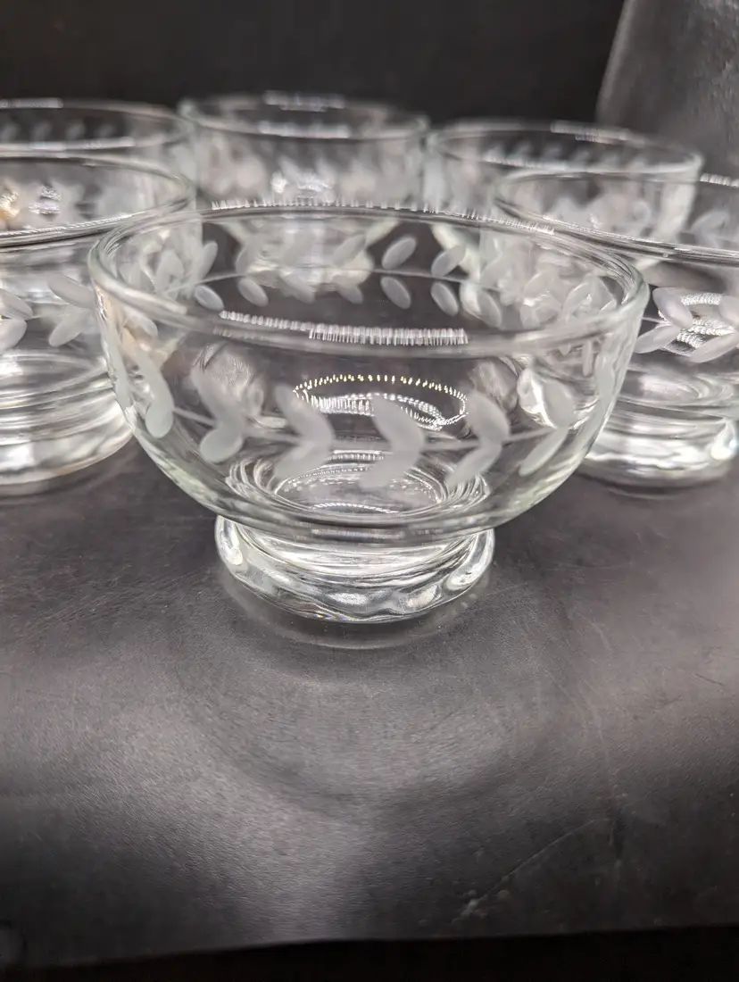 This is a lovely Vintage Anchor Hocking Etched Laurel Leaf Footed Dessert Bowls 3-1/2". Set of 6. No chips or cracks. Please see all pictures for condition and measurements.