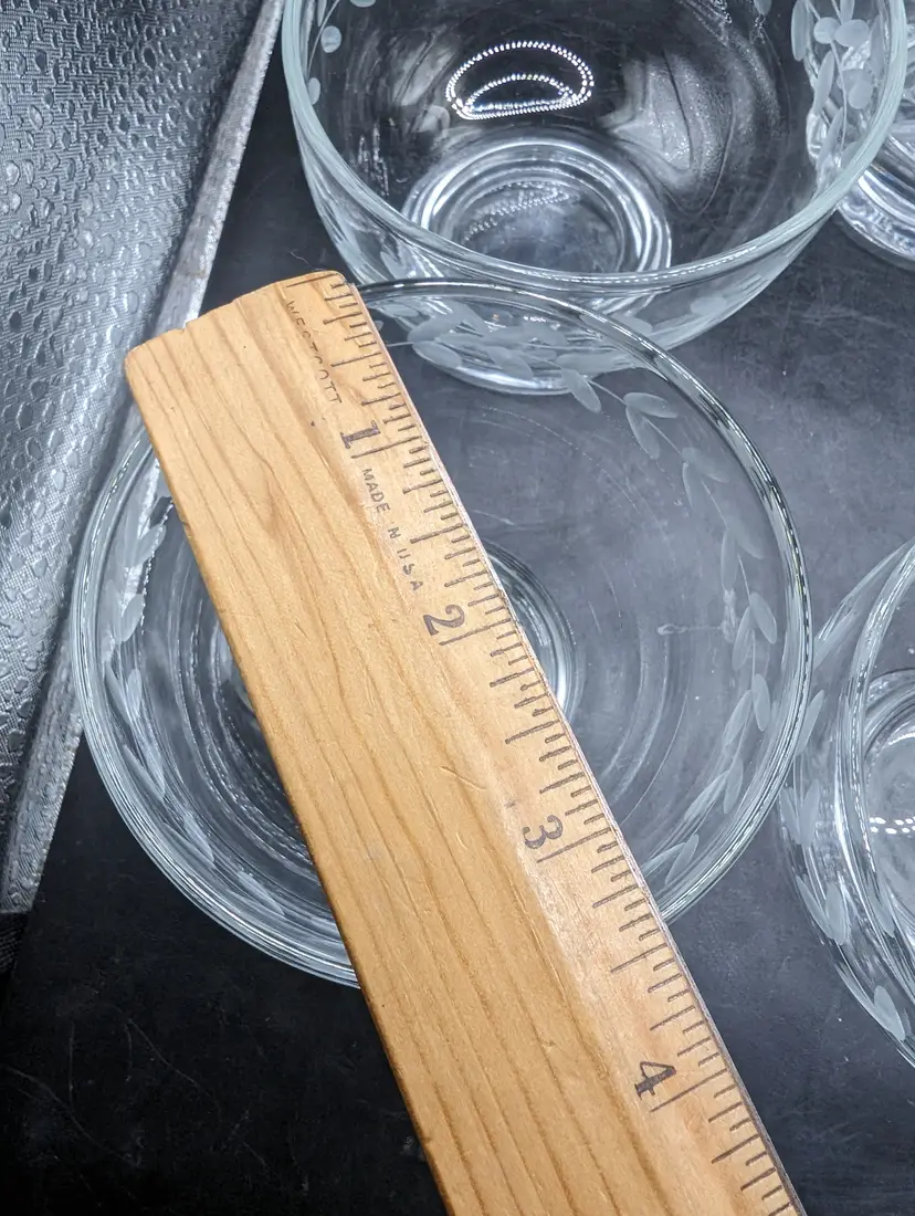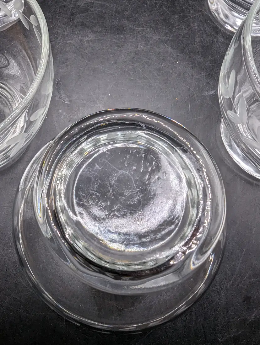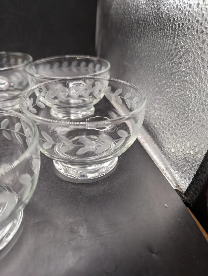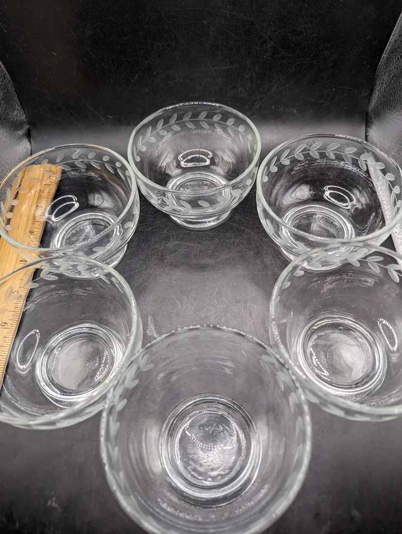 This is a lovely Vintage Anchor Hocking Etched Laurel Leaf Footed Dessert Bowls 3-1/2". Set of 6. No chips or cracks. Please see all pictures for condition and measurements.