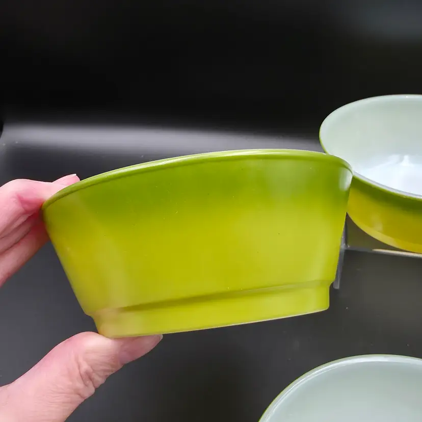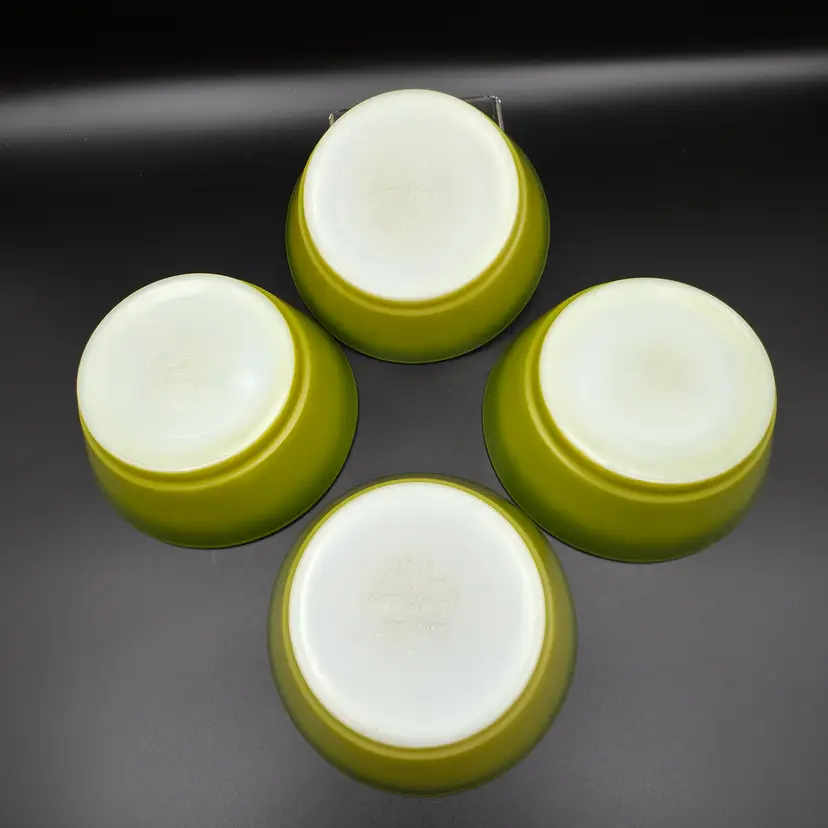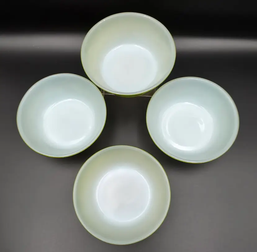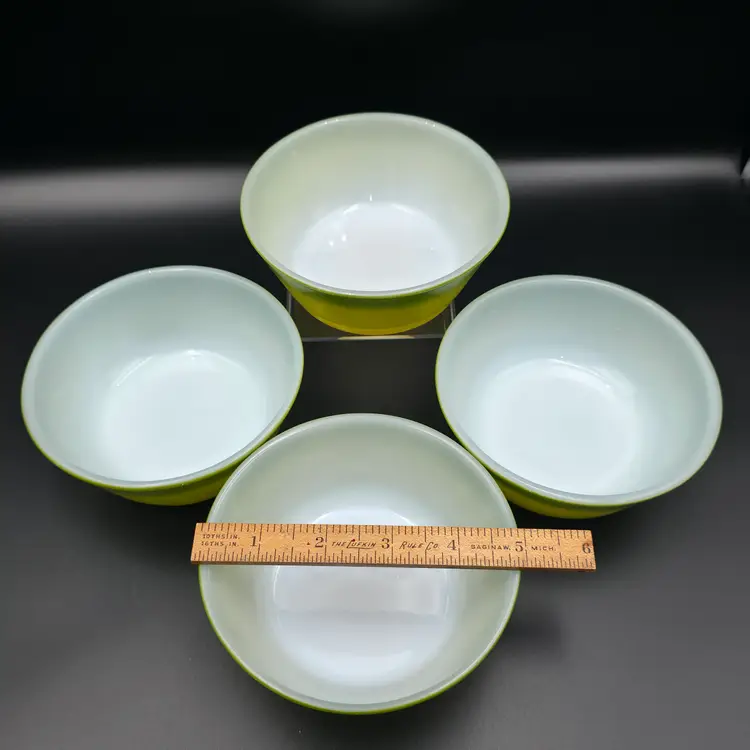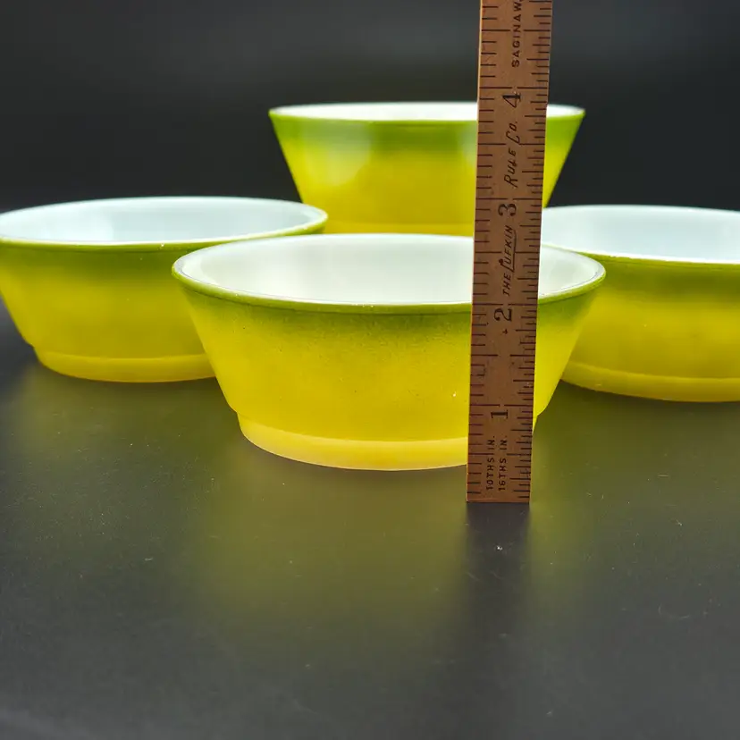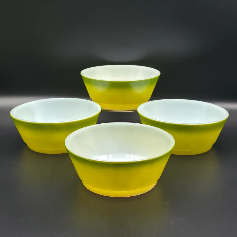 Set of 4 cereal bowls/ramekins. They are in good used condition No chips or cracks. There are a few small specks of paint loss on each one but no major paint loss. Measures 5 inches in diameter and 2 inches tall. Thank you for looking and have a great day!