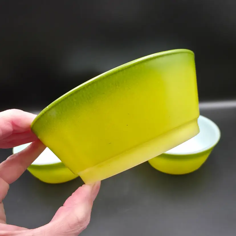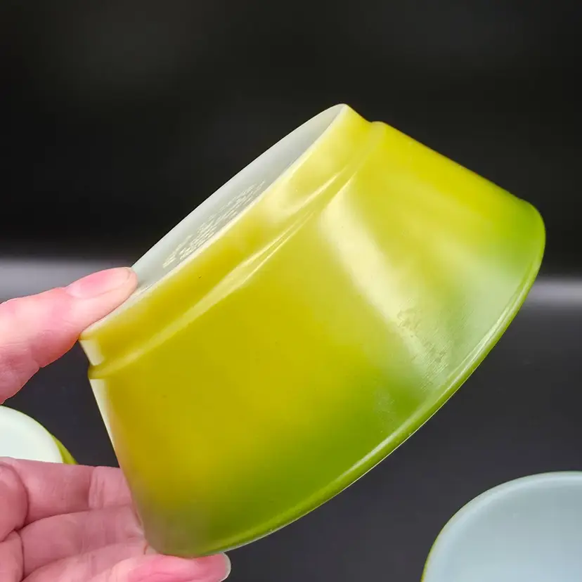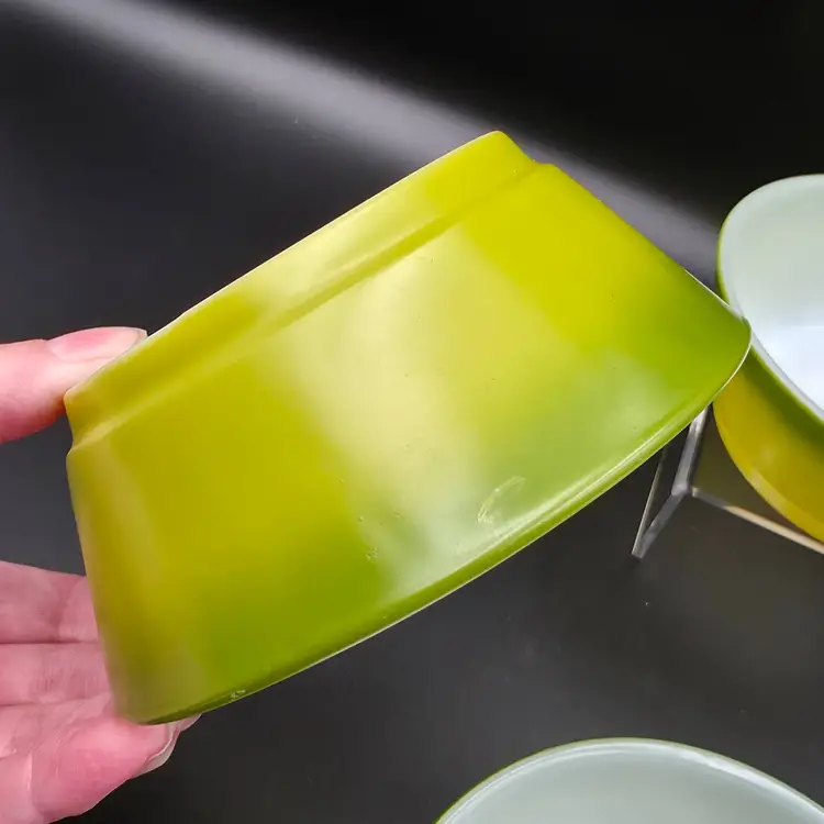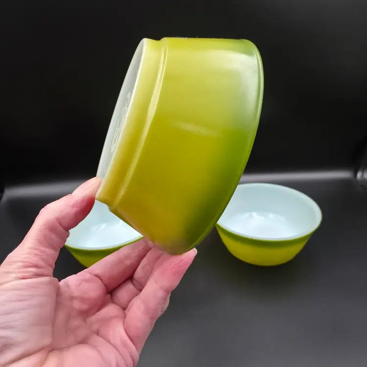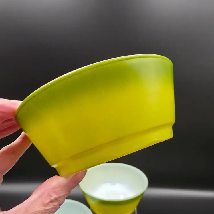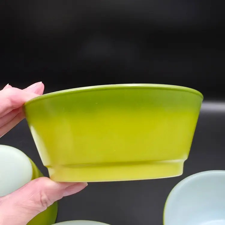 Set of 4 cereal bowls/ramekins. They are in good used condition No chips or cracks. There are a few small specks of paint loss on each one but no major paint loss. Measures 5 inches in diameter and 2 inches tall. Thank you for looking and have a great day!