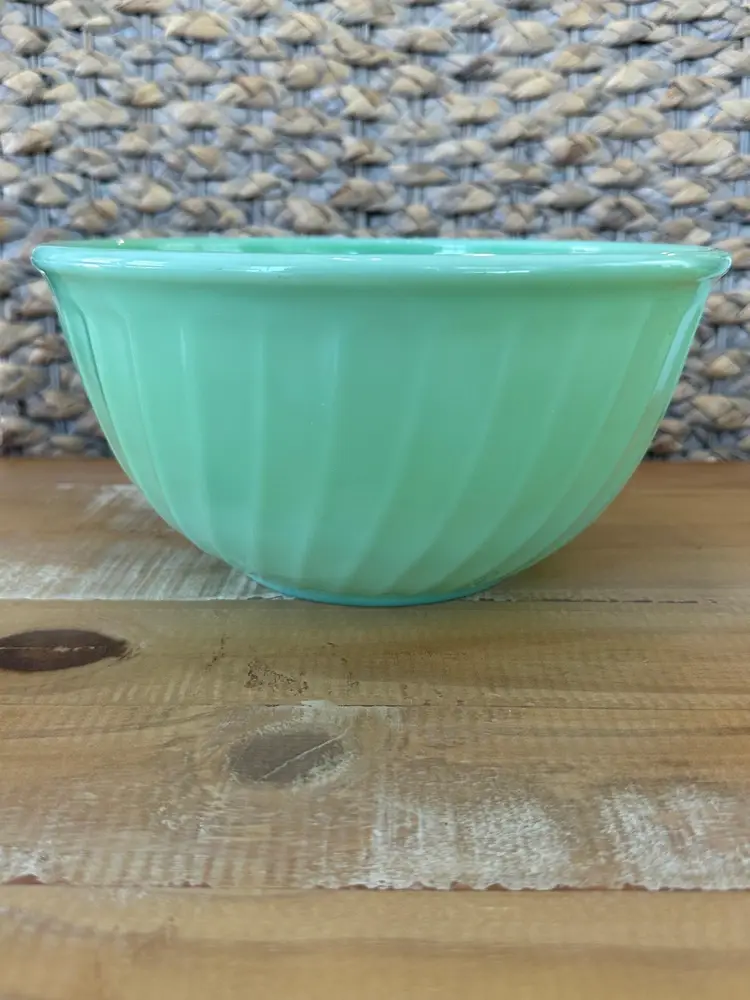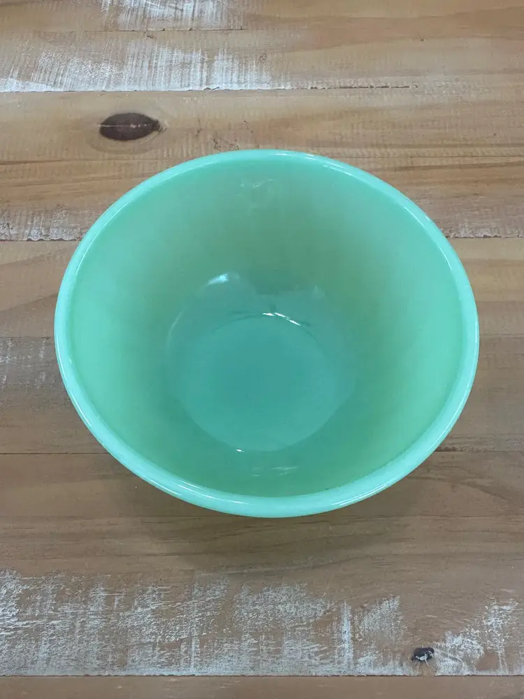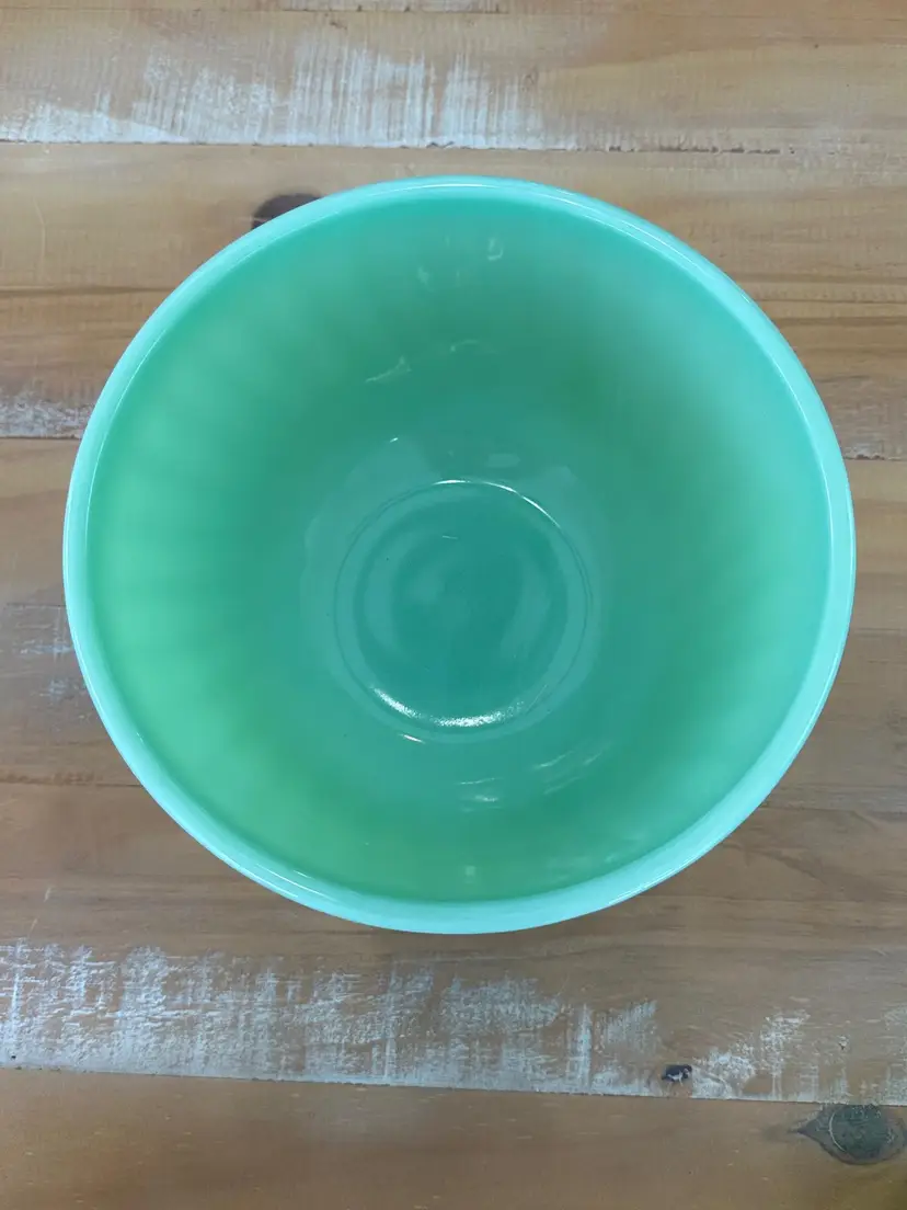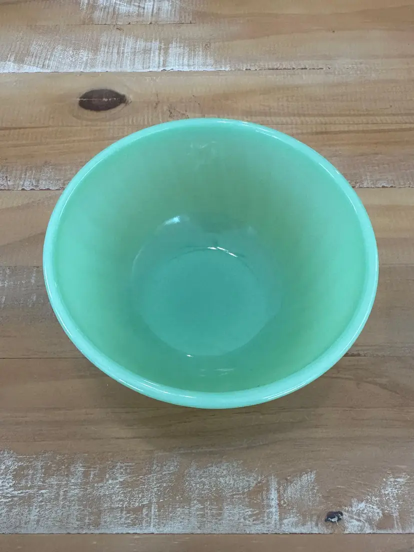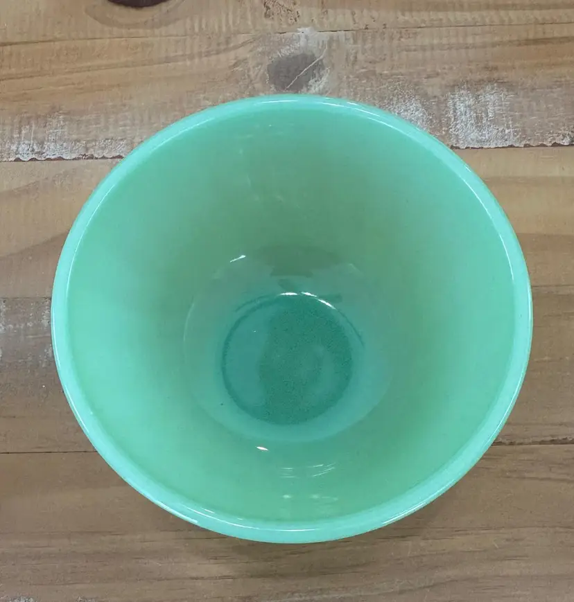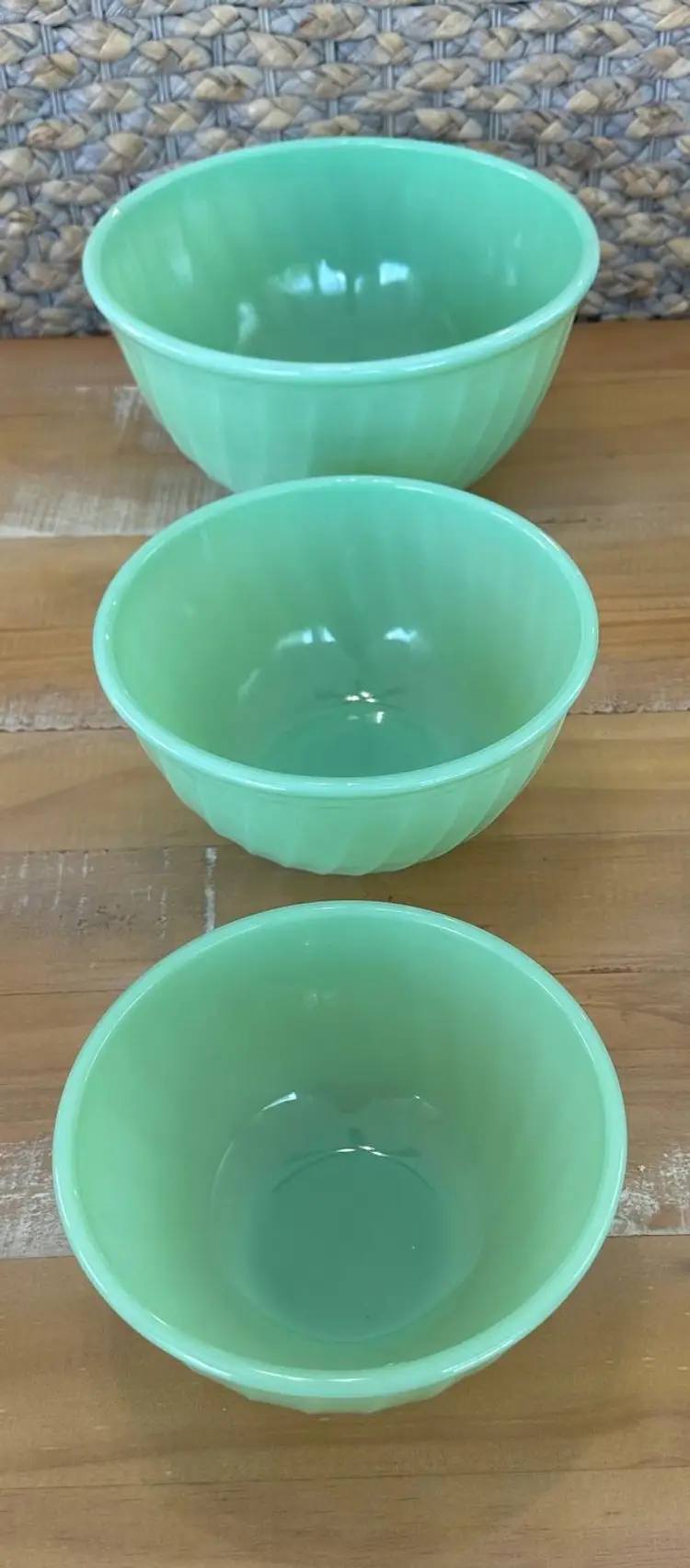 Add a touch of vintage charm to your kitchen with this set of 3 jadeite mixing bowls. Perfect for baking, serving, or display, these bowls are both functional and stylish. Sizes range from small to large, making them versatile for all your culinary needs. Large W: 9" H: 4.5" Medium W: 7" H: 3.5" Small W: 6" H: 3"