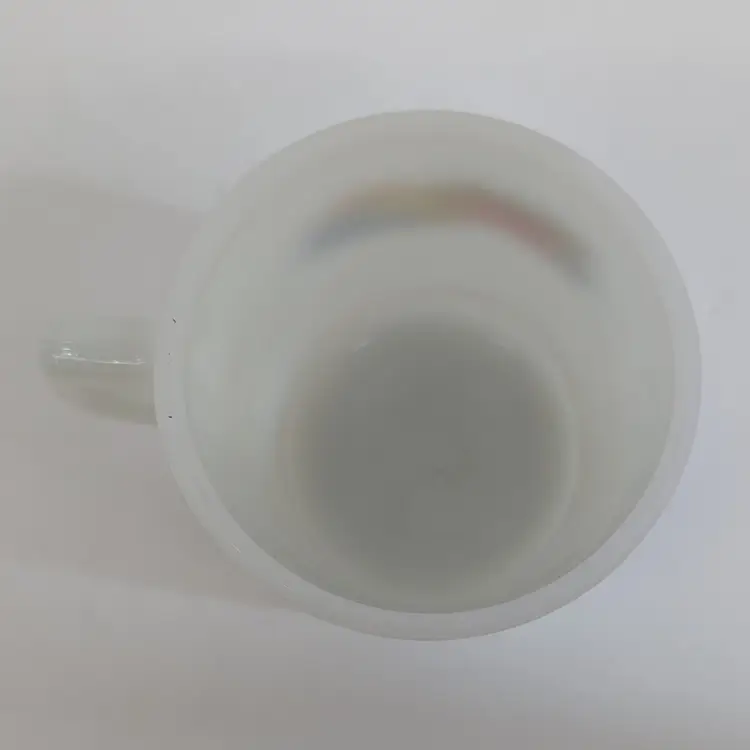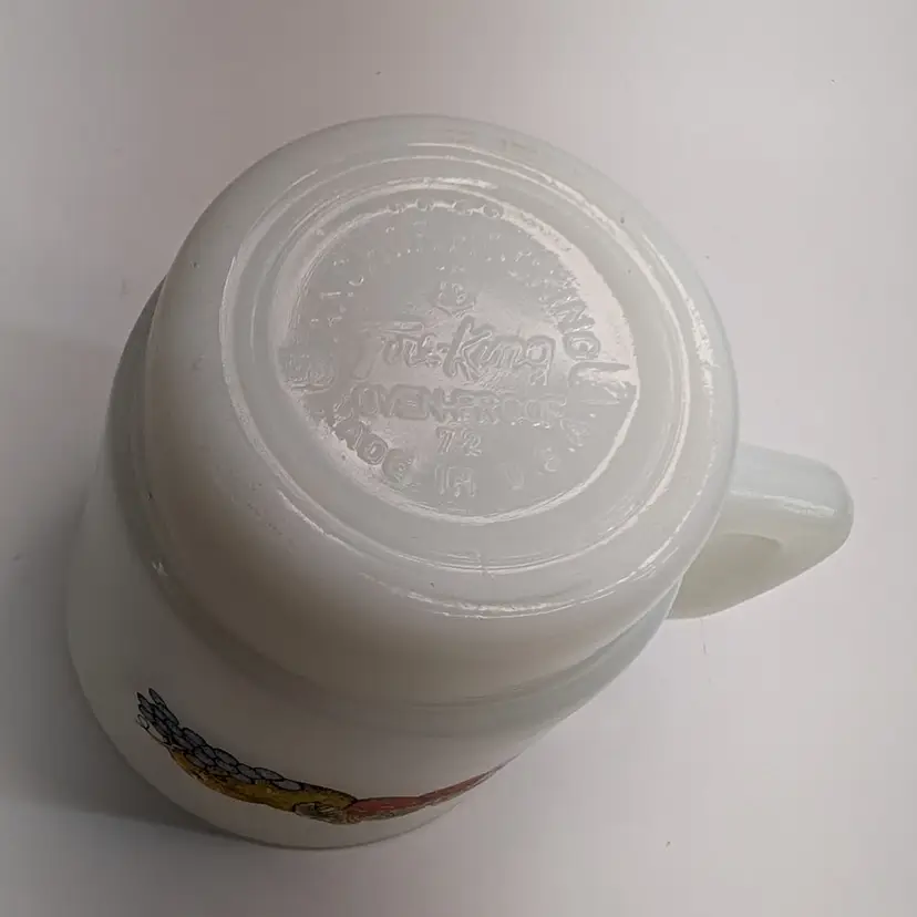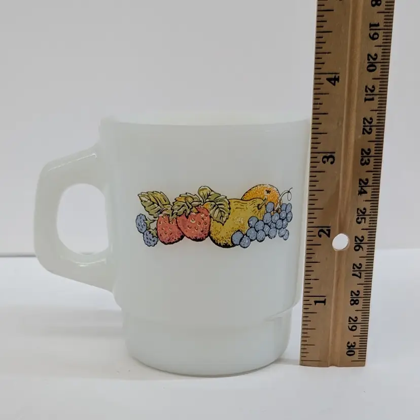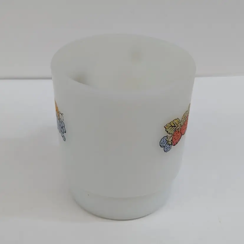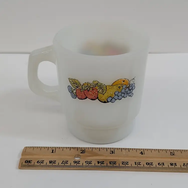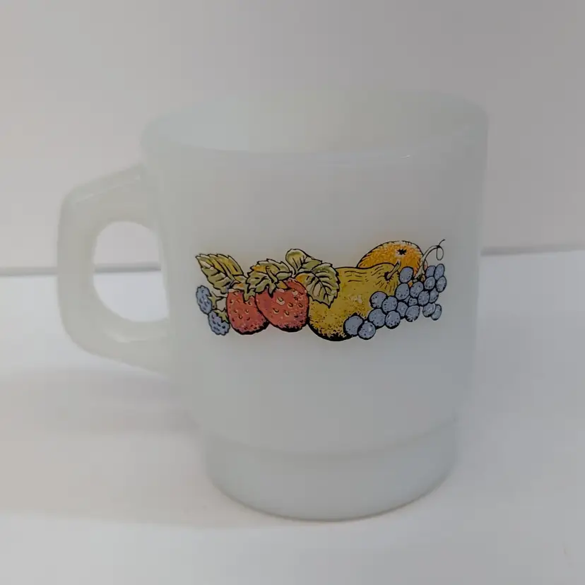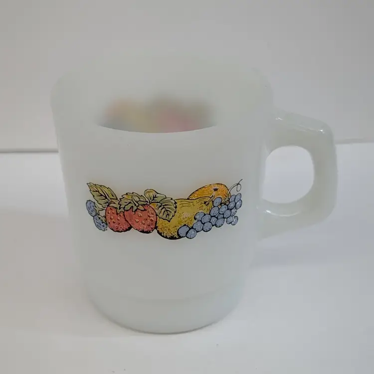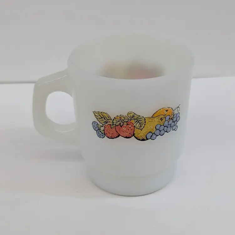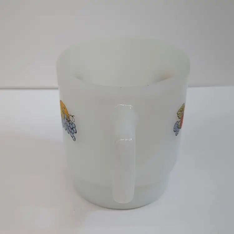 Milk glass mug with a fruit design on each side. In nice, used condition with a few minor marks on the glass that may come off with a magic eraser. Measurements ~ 5 x 3.5" 8oz