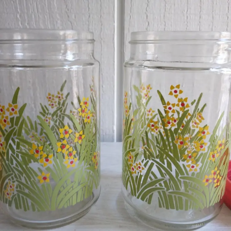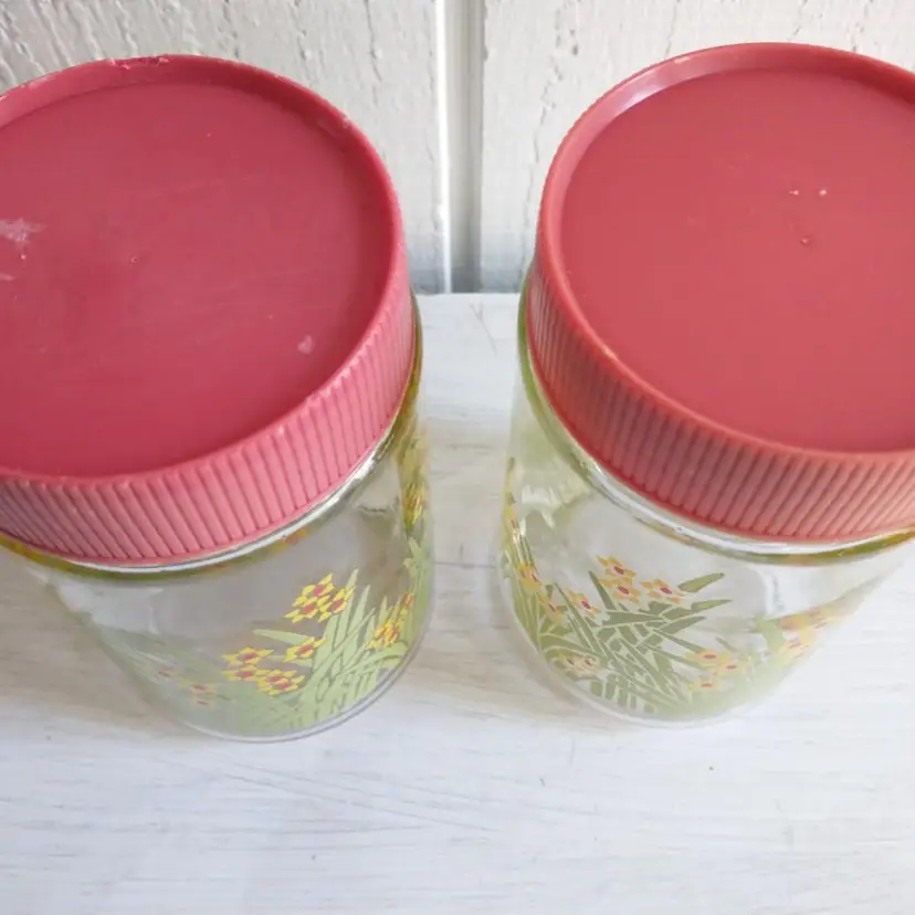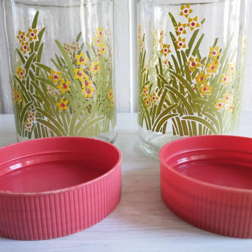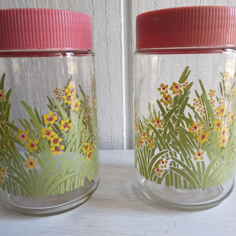 Vintage Anchor Hocking glass jars Spring Daffodil Flowers motif with red lids No chips or cracks/Wear on the lids*see pictures Vintage condition Approx Measurement 6"x 3" x 3 1/2" across lid