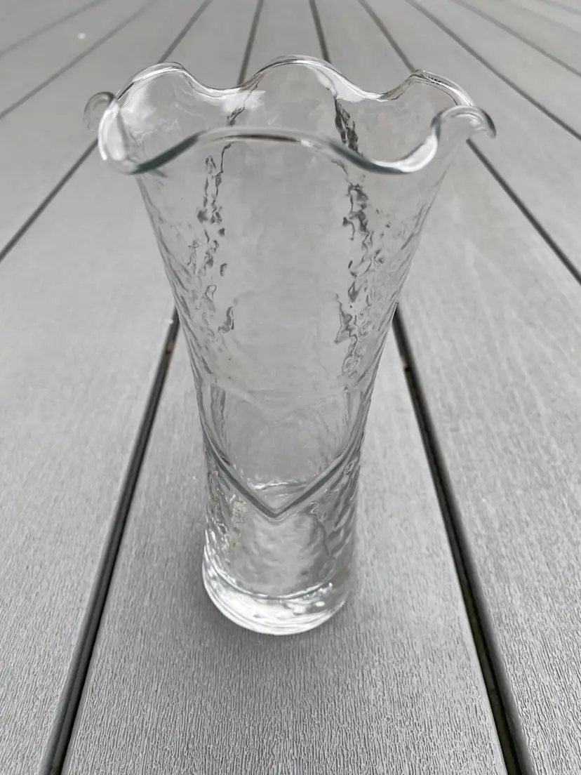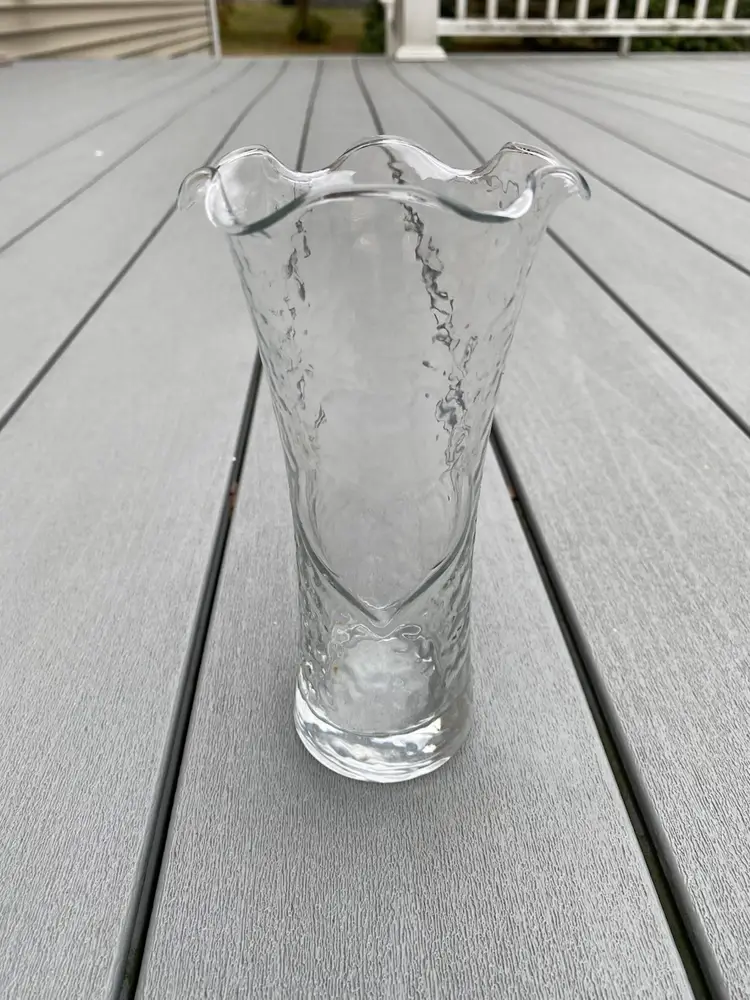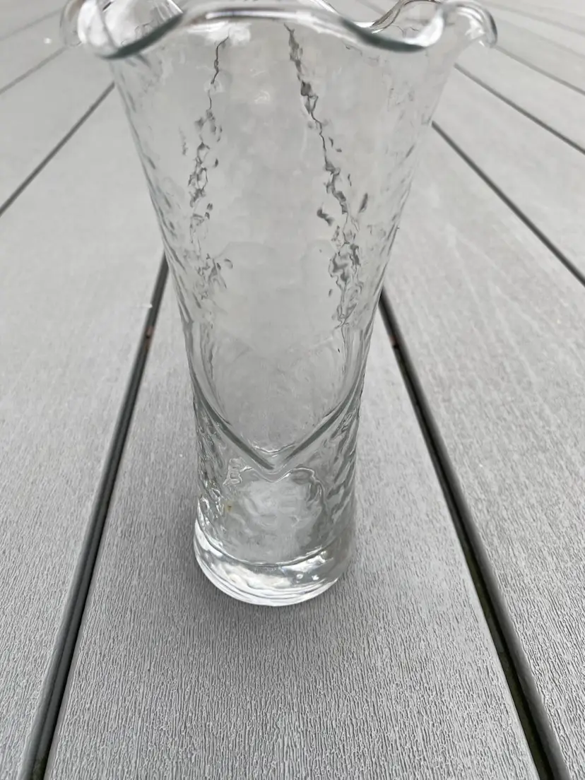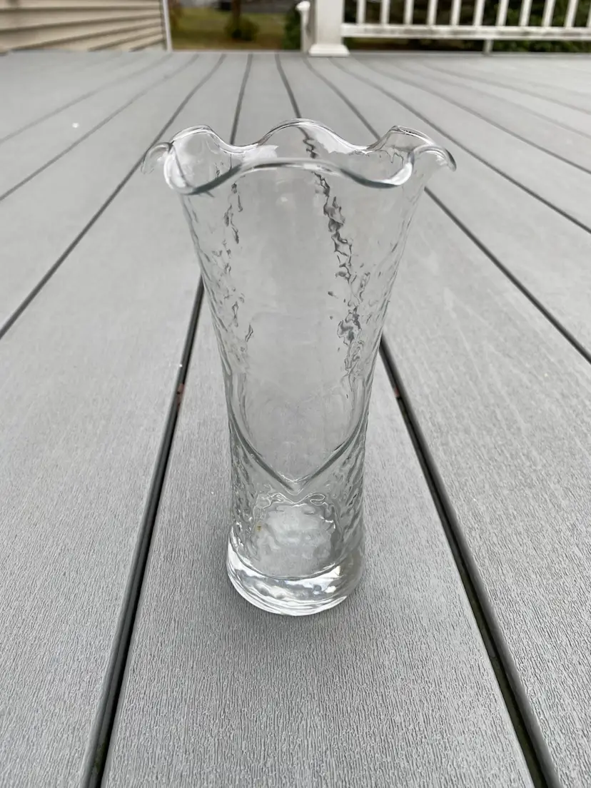 This is a pretty vintage ANCHOR HOCKING clear glass vase with a dimpled texture, ruffled top, and an embossed heart design. Would be a lovely gift!