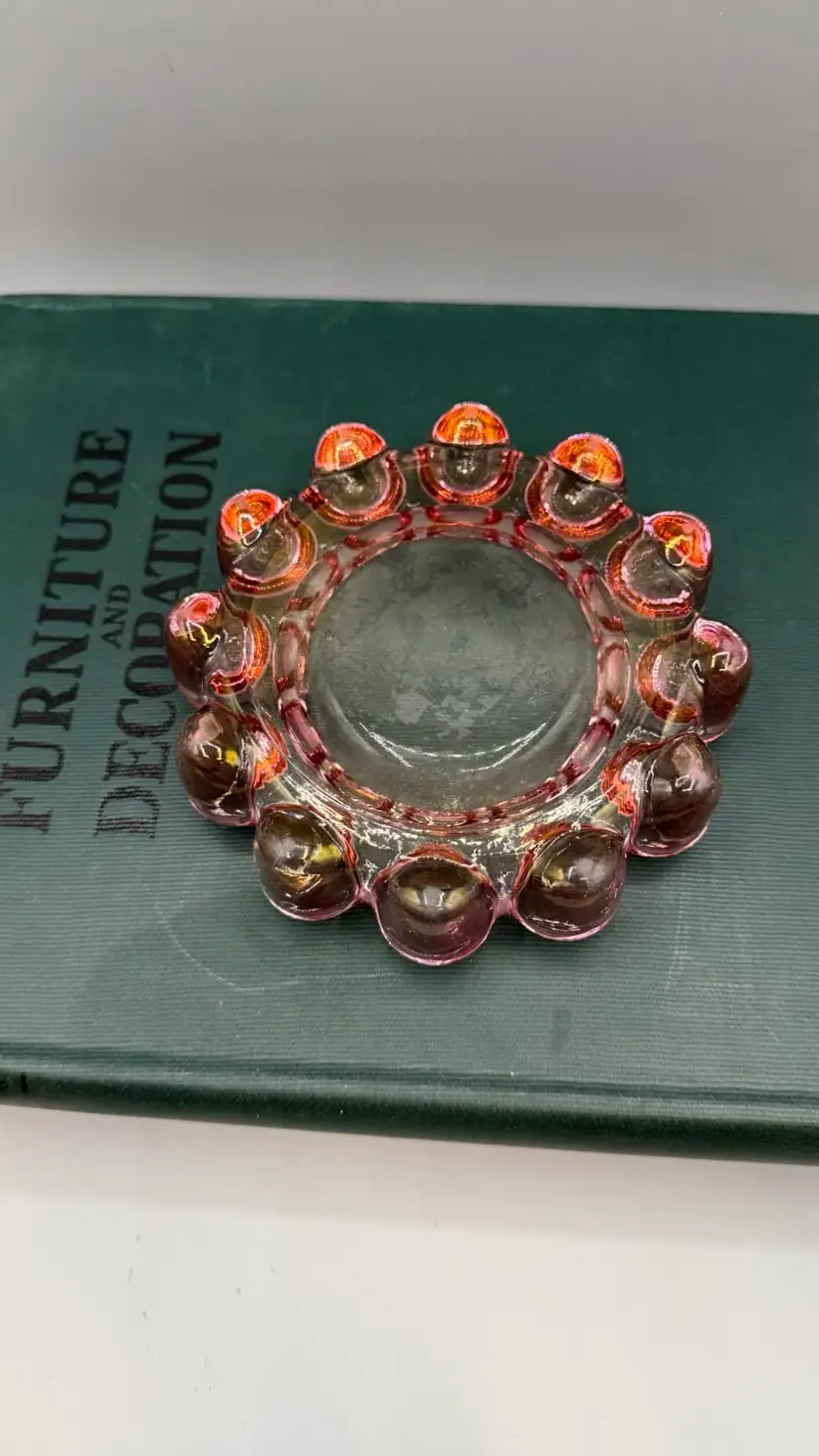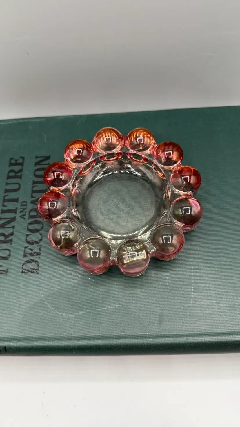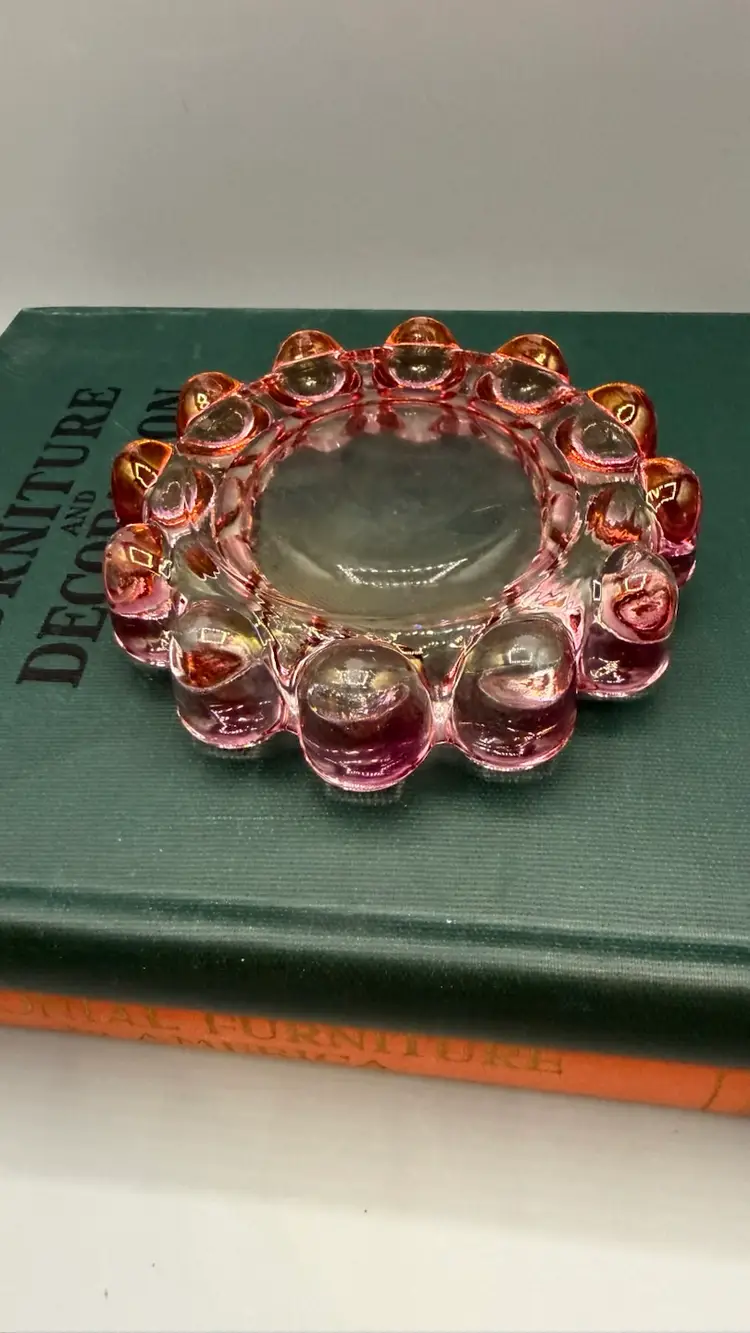 Known for its iconic beaded or "bubble" rim, this vintage piece (circa 1940s-1970s) features a beautiful rosy-pink finish with a subtle iridescent glow that catches the light from every angle. Trinket tray, unique coaster, candle holder, trinket or candy/nut dish. Excellent condition no chips or cracks