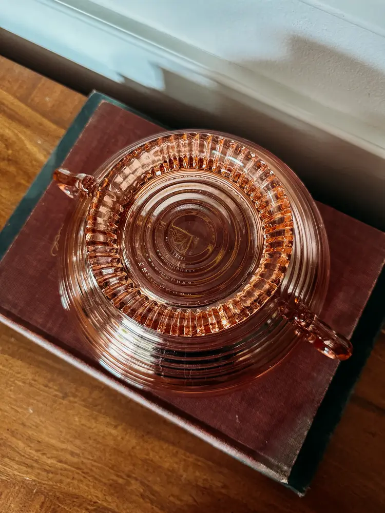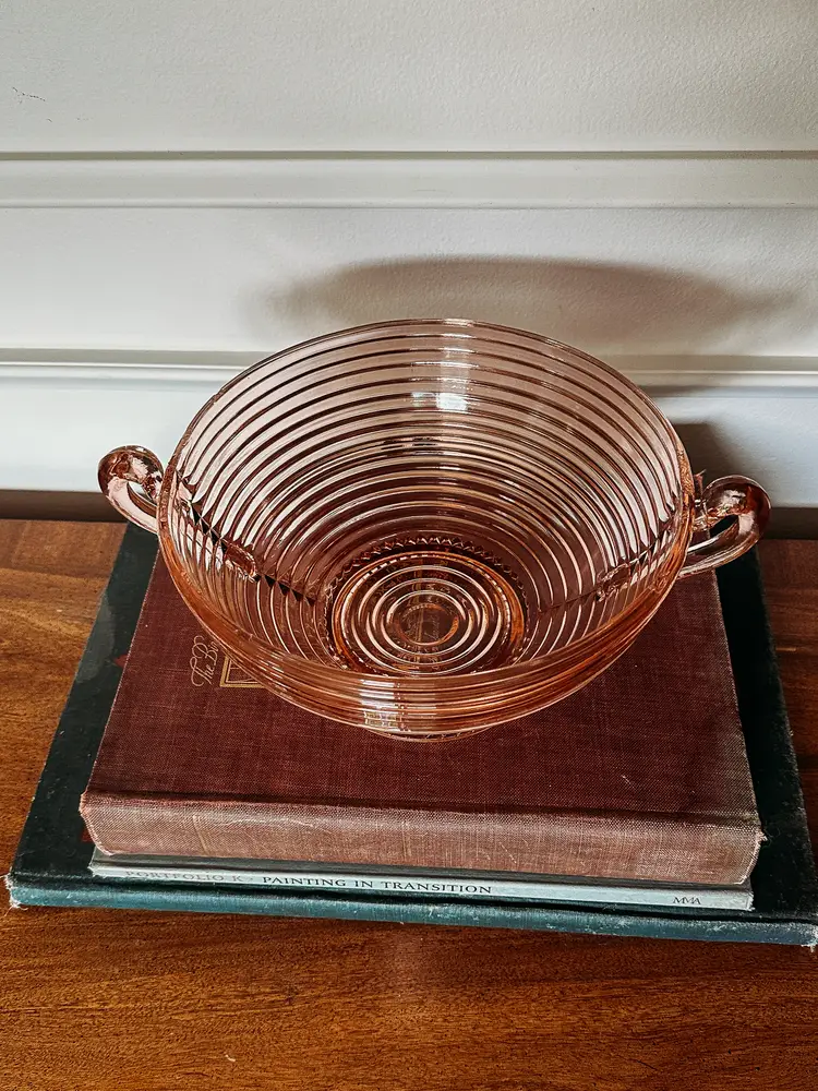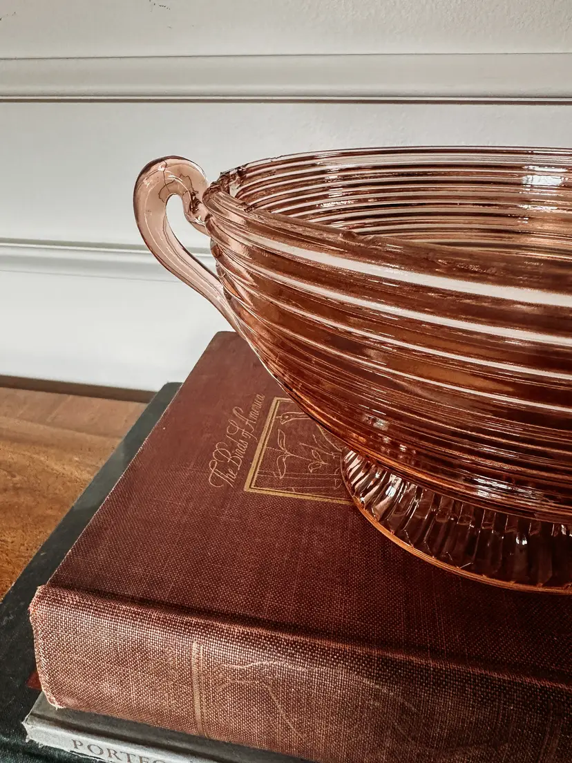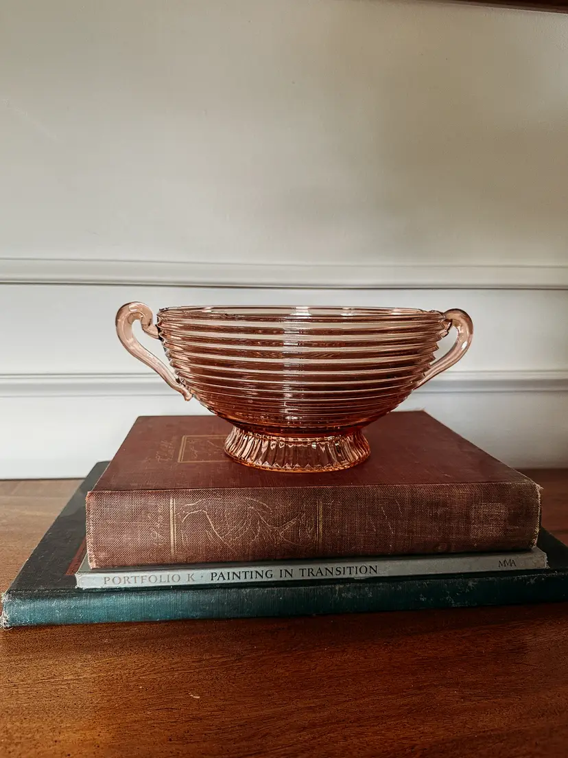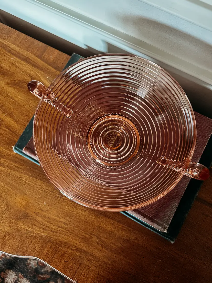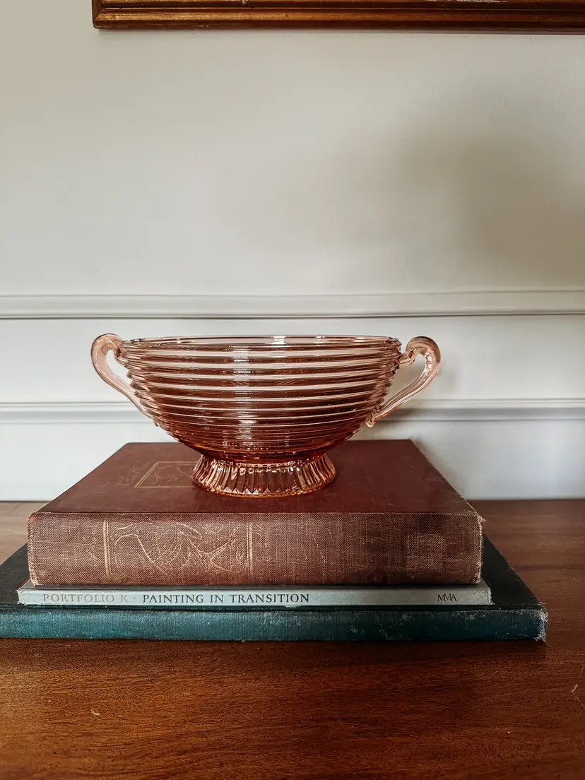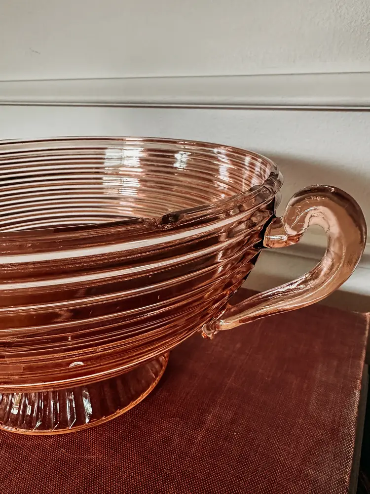 This gorgeous pink glass bowl from the 1930's is in the Manhattan pattern, featuring a ribbed design. This Pink Depression Glass beauty was manufactured by Anchor Hocking during the Great Depression. Use as Serving bowl for fruit, candy, or other treats. approximately 10X9x5"