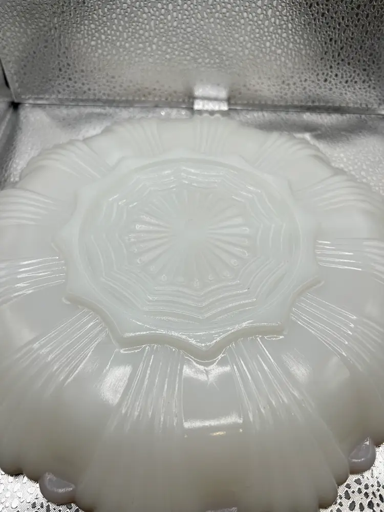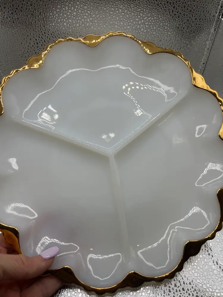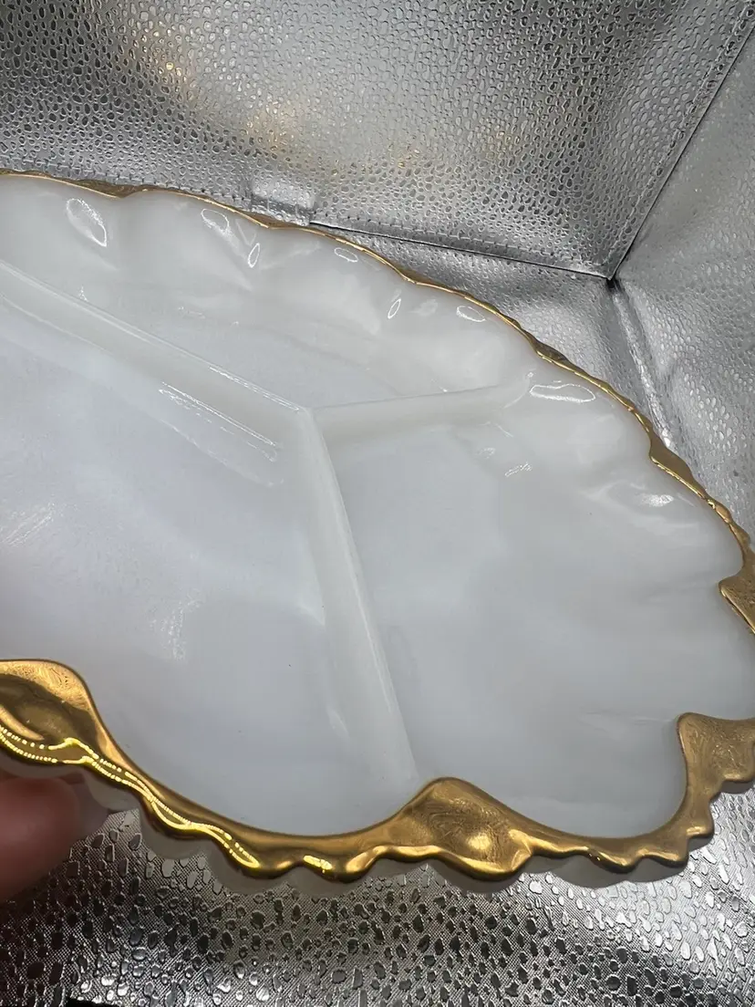I have 4 vintage Anchor Hocking 3-part relish dishes, specifically the Golden Shell Lustre. They’re made of white milk glass & are divided into three sections.