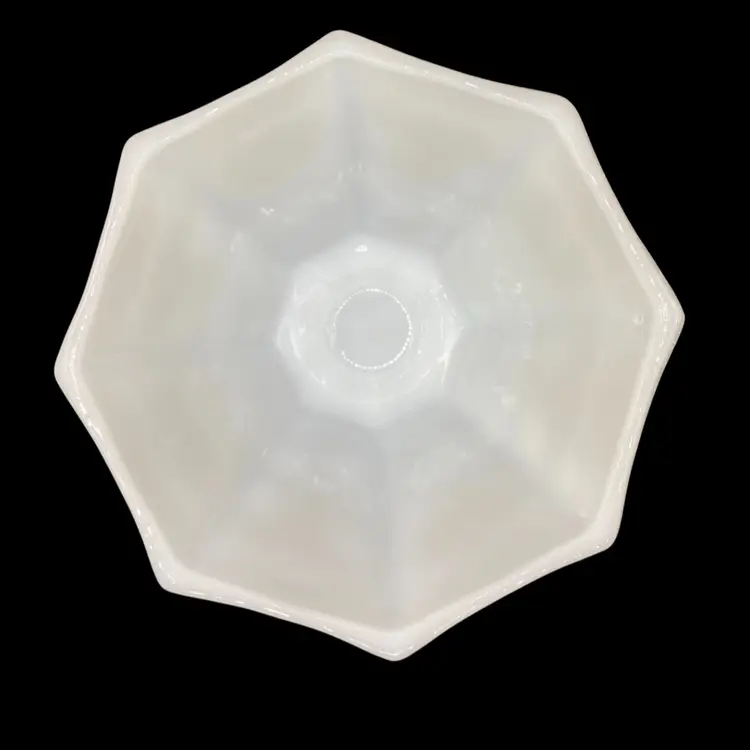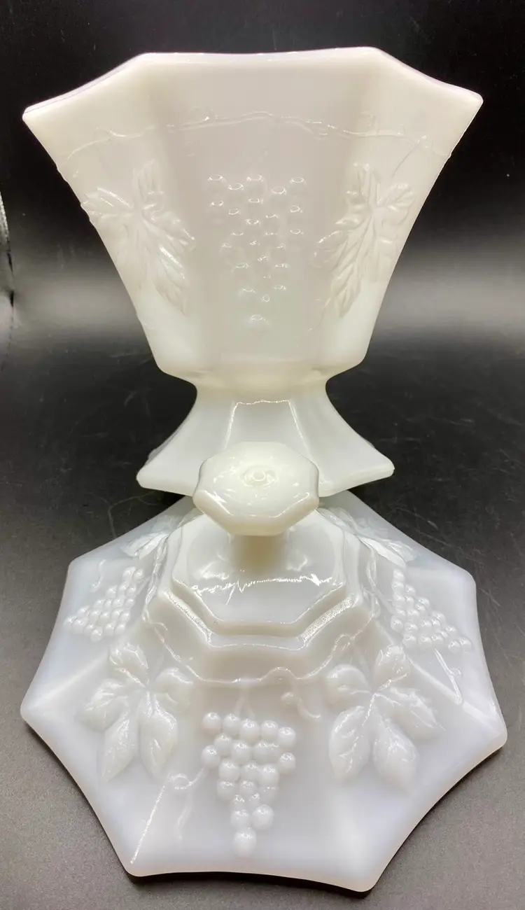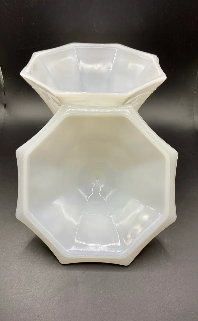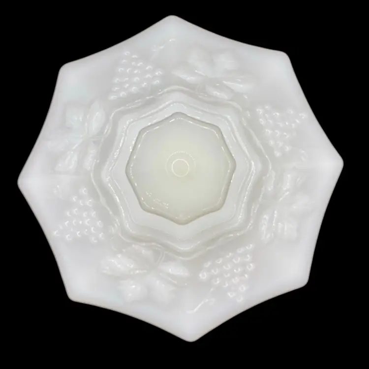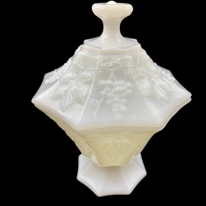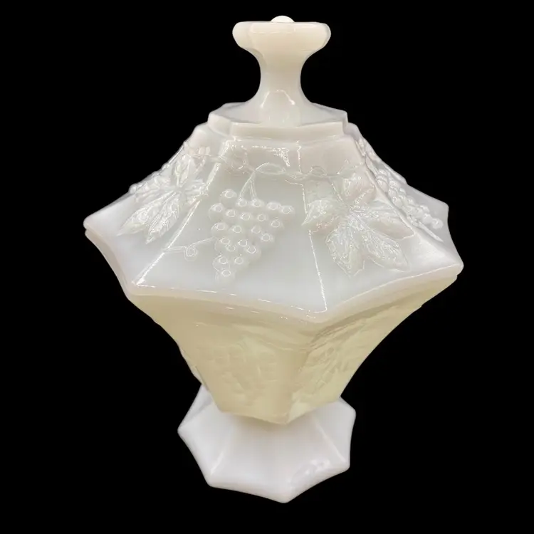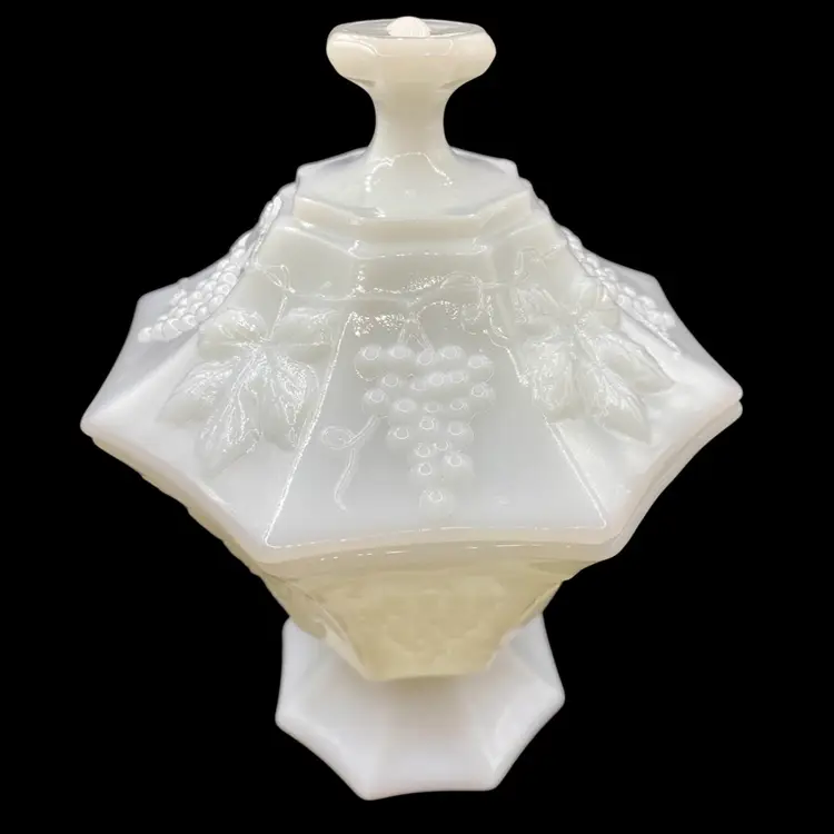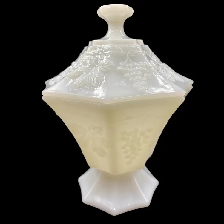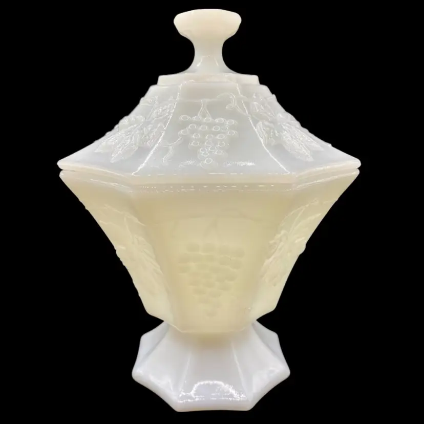 This vintage Anchor Hocking milk glass candy dish is an excellent addition to any collection. The octagonal shape and beautiful grapes and vines pattern give it a unique and elegant look. Made in Ohio in the 1960s, this piece is true Mid-Century Modern style.Crafted from high-quality opaque glass, this candy dish is both sturdy and lightweight. It measures 8 inches in height and 6 inches in width and comes with a lid to keep your treats fresh. Whether you're a collector or simply looking for a beautiful vintage piece to display, this Anchor Hocking candy dish is sure to impress.