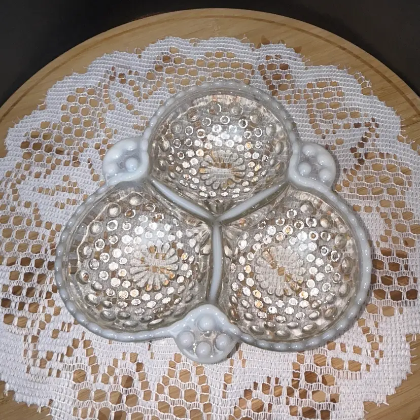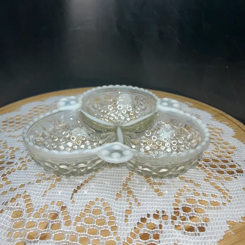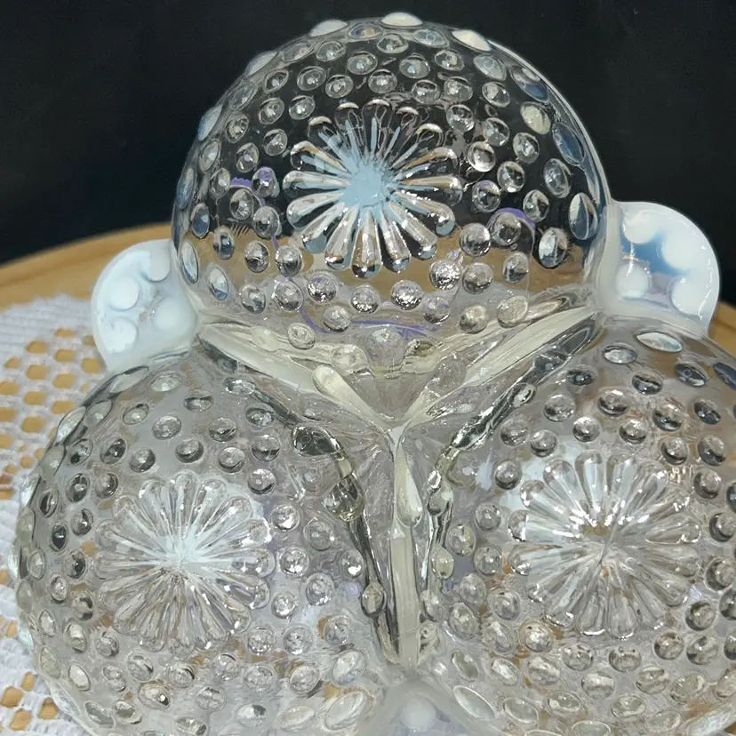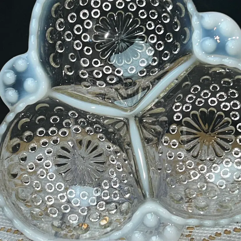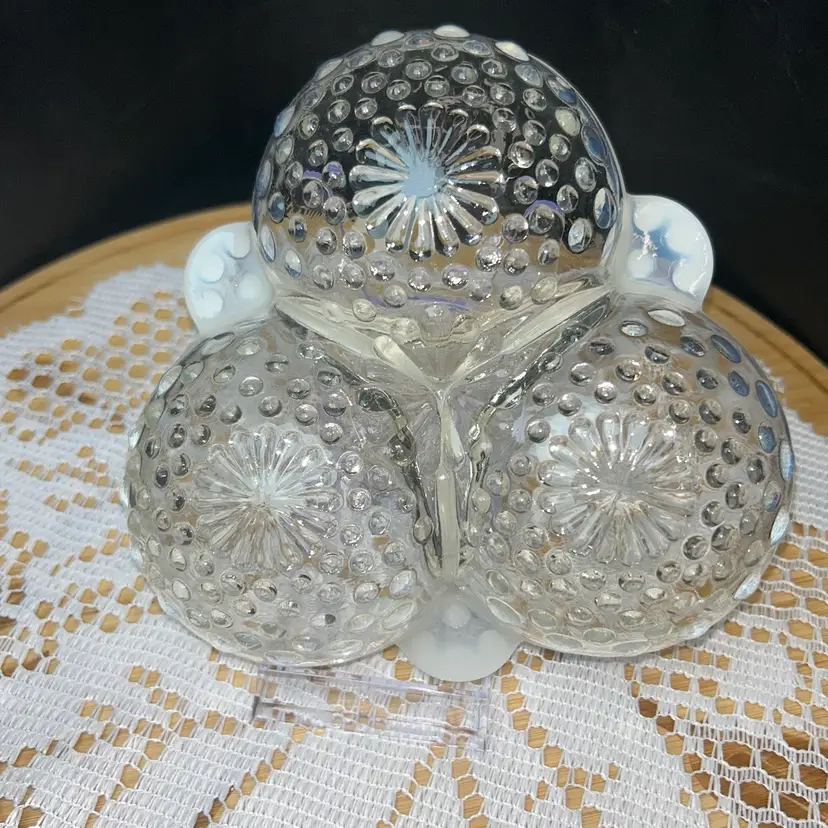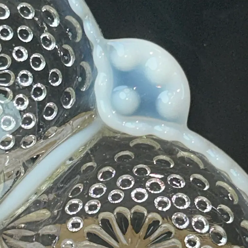 Moonstone was manufactured from 1941-1947. This dish measures 6.5” wide from the edge of each cloverleaf through the cluster of hobnails opposite each. Excellent condition. No issues.