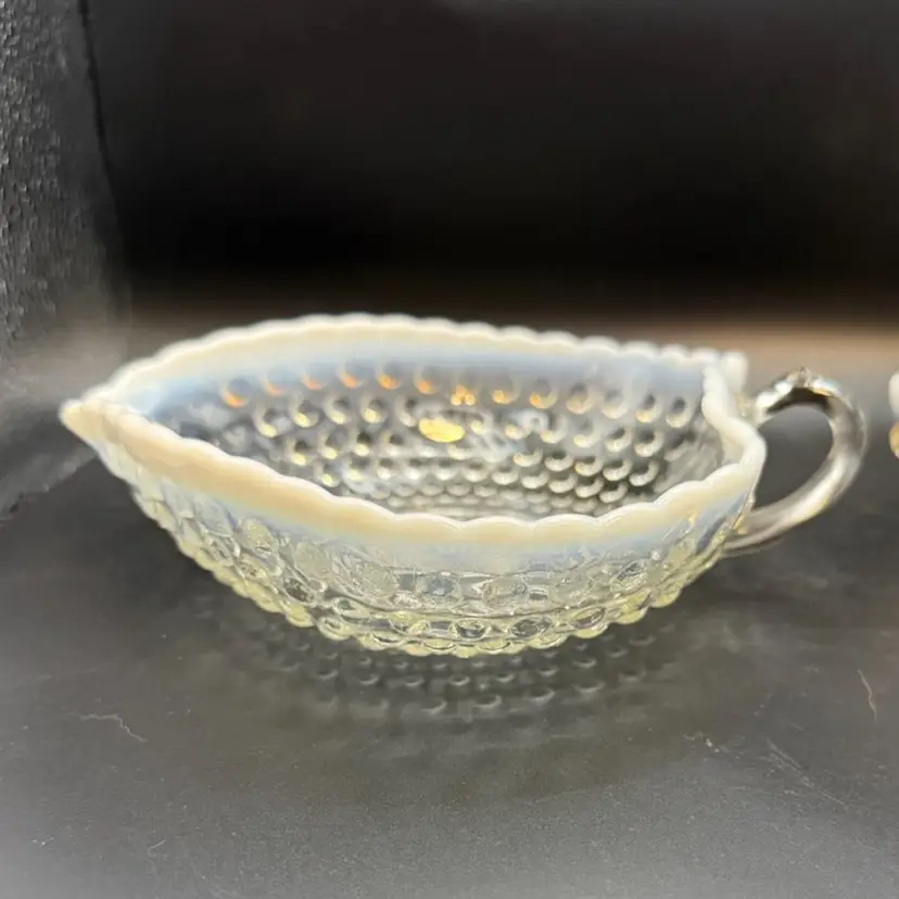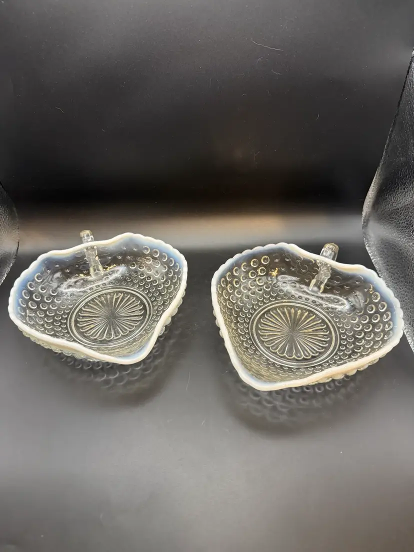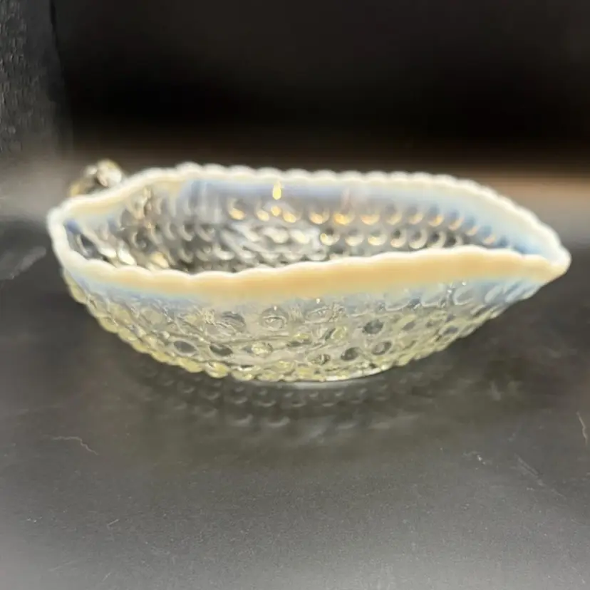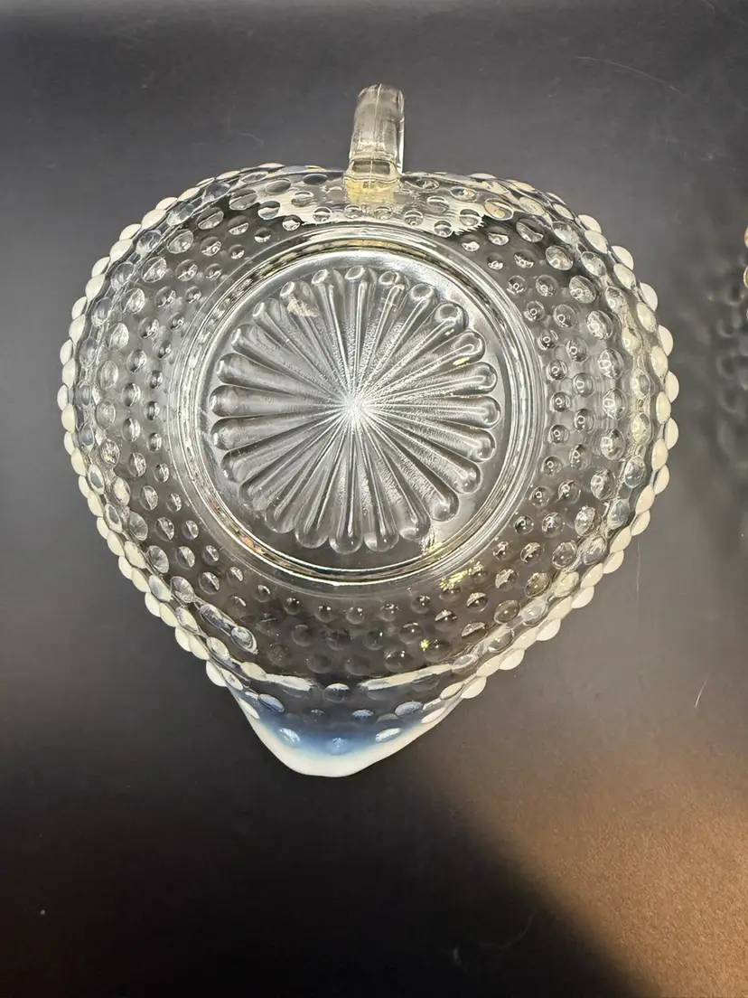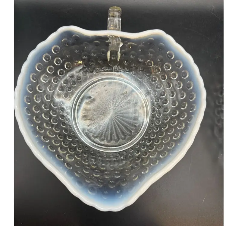 It features the "Moonstone" hobnail pattern in clear opalescent glass, transitioning to an opaque white rim. Manufacturer and Era: Produced by Anchor Hocking Glass Co. from 1942-1946. Design: The dish is heart-shaped with a single handle and a scalloped rim.