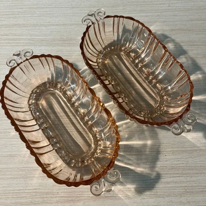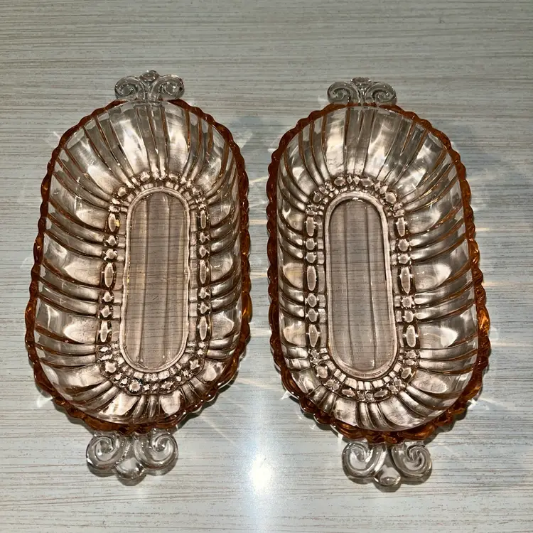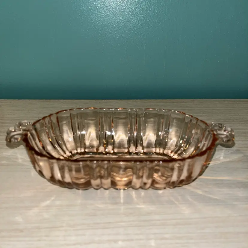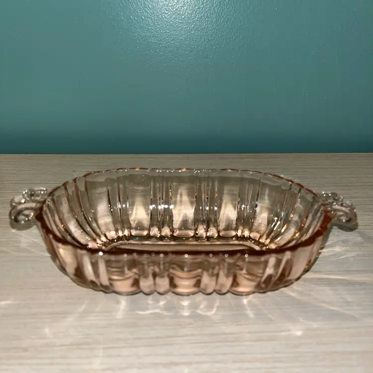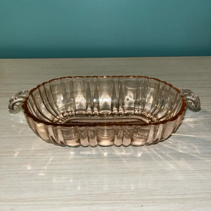 Set of 2 vintage Anchor Hocking Pink Depression Glass (Old Cafe pattern) ribbed, oval relish or candy dishes with handles on either end. Approximately 7" long, 3.5" wide and 1.5" deep. Pre-owned and in used condition. Expect normal wear such as scuffs or scratches. See photos and ask any questions prior to purchase.