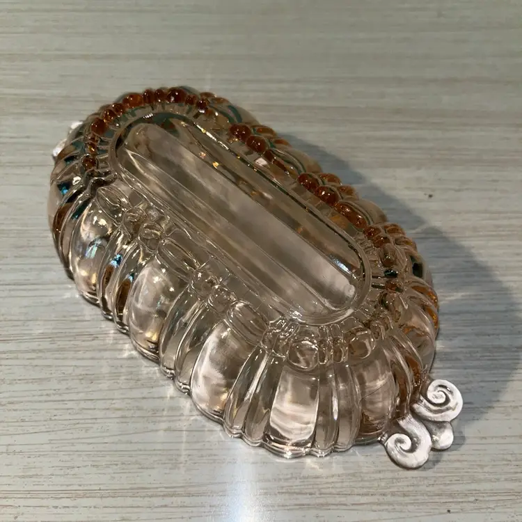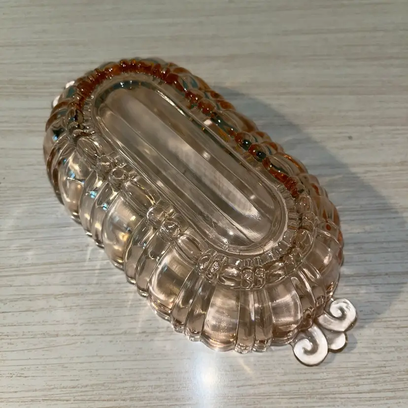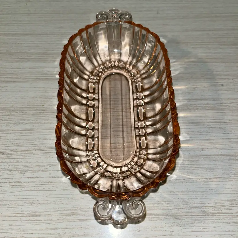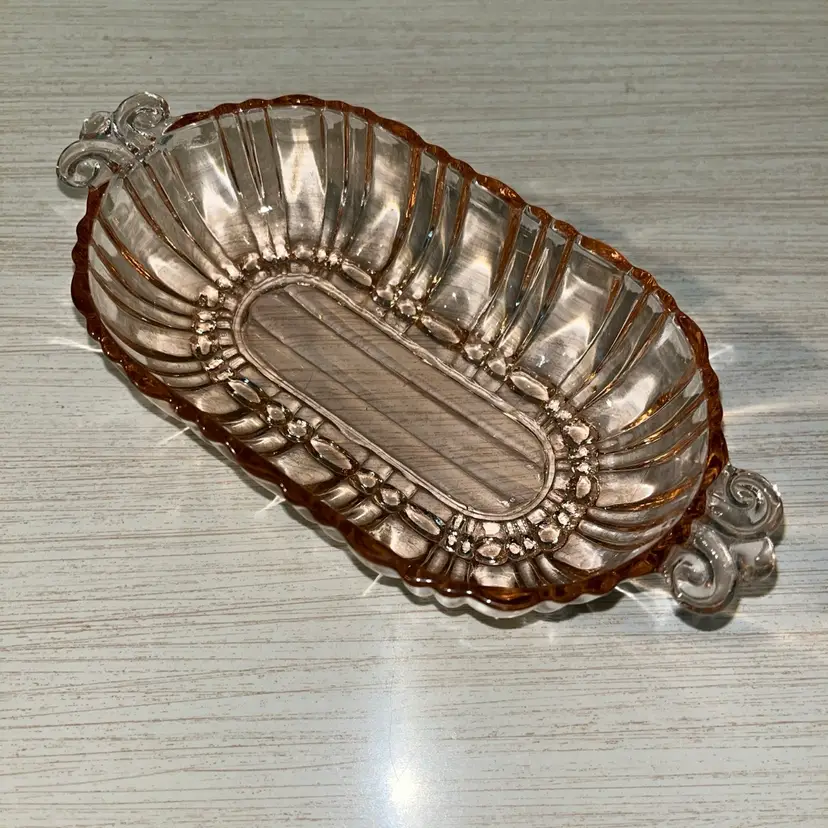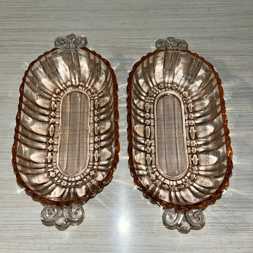 Set of 2 vintage Anchor Hocking Pink Depression Glass (Old Cafe pattern) ribbed, oval relish or candy dishes with handles on either end. Approximately 7" long, 3.5" wide and 1.5" deep. Pre-owned and in used condition. Expect normal wear such as scuffs or scratches. See photos and ask any questions prior to purchase.