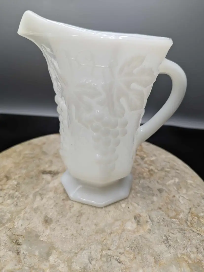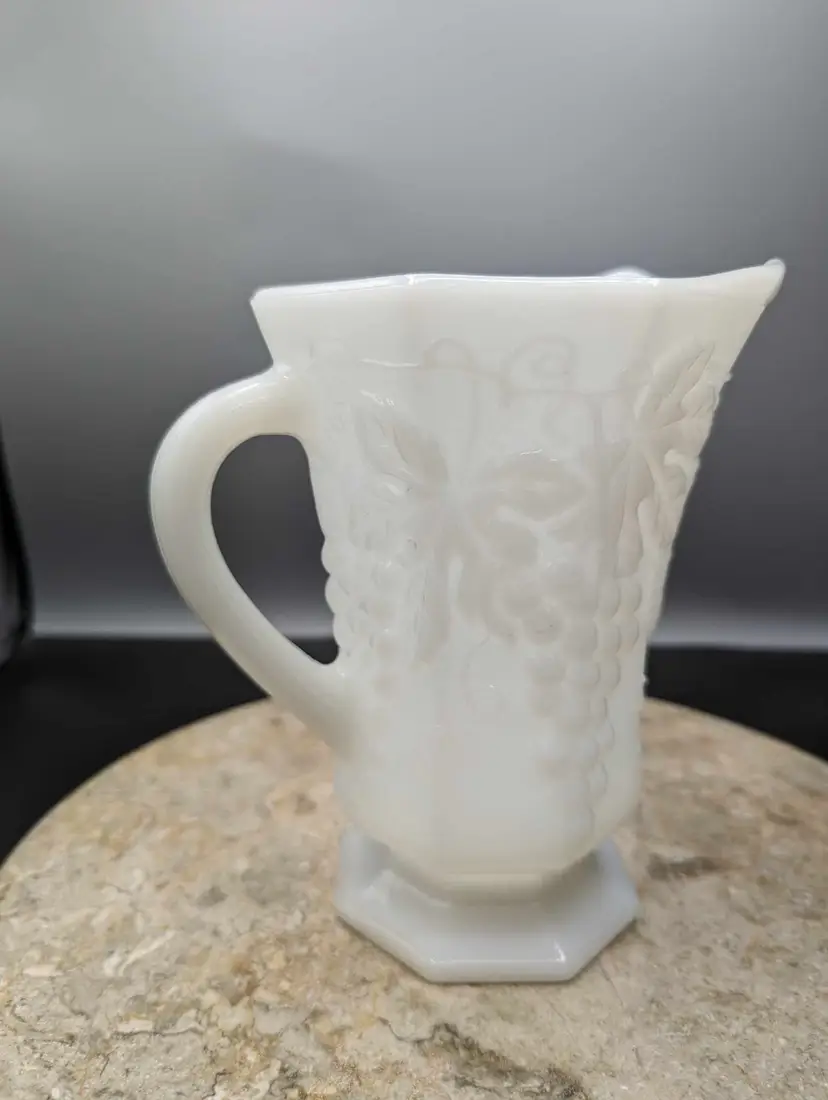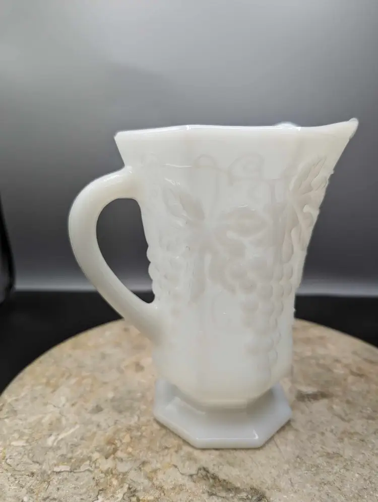 This vintage Anchor Hocking pitcher is a beautiful addition to any collection. The white milk glass and grapes & leaves design make it a unique and eye-catching piece. Measuring 7” X 7” x 4”, it is the perfect size for serving drinks or as a decorative piece. The production style is milk glass, and it was made in the United States. This pitcher is a vintage item, adding to its charm and character. It is perfect for those who appreciate vintage items or for those who want to add a touch of elegance to their home.