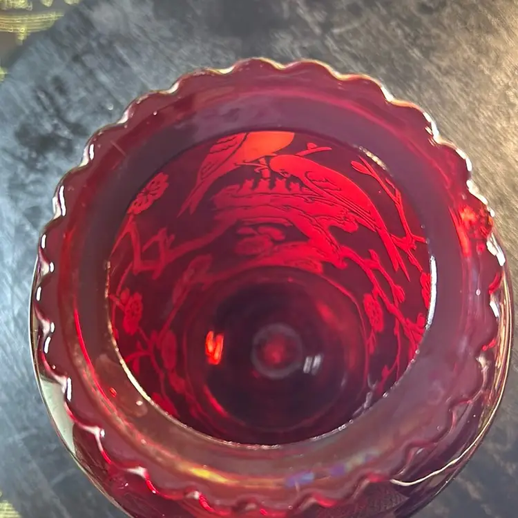 This item is a vintage anchor hocking royal ruby red glass vase featuring a design of birds among flowers or on branches. It is 9 inches tall and 4 inches wide. There are no chips or cracks.