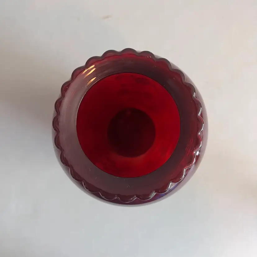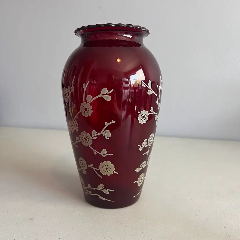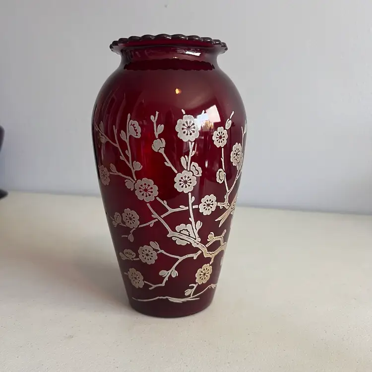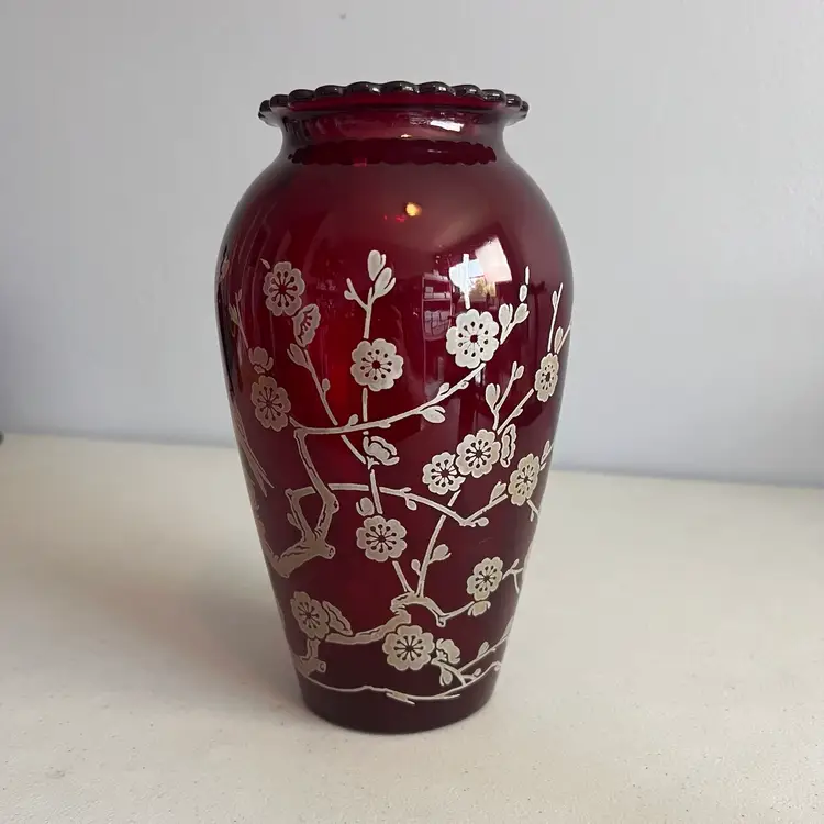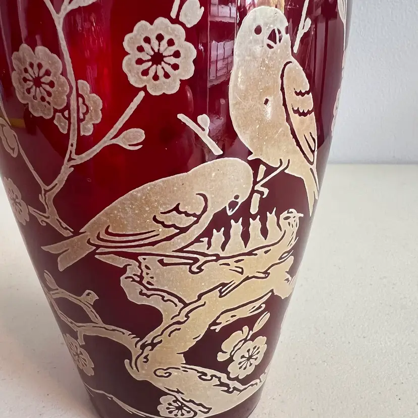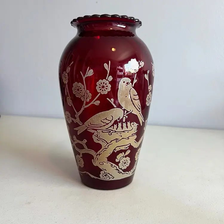 Here We Have a Vintage Anchor Hocking Ruby Red 9" Vase with Birds on Branch Design