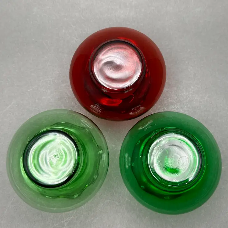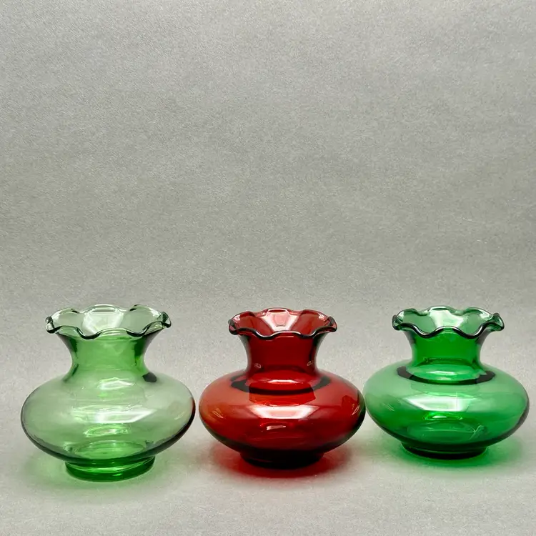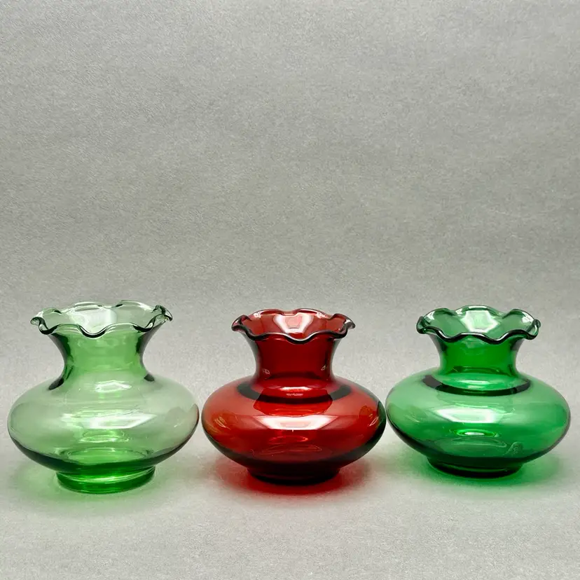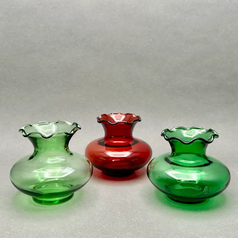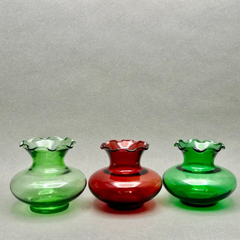 Vintage trio of MCM Anchor Hocking red and green glass vases. They are squat vases with ruffled rim.