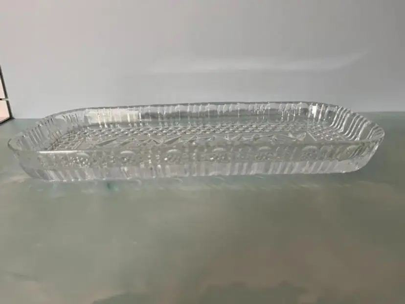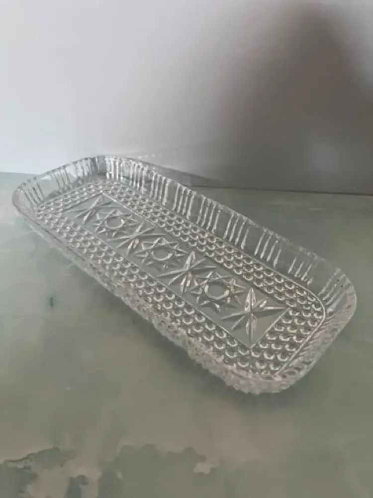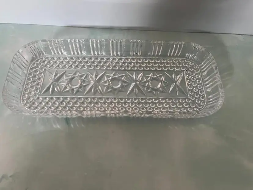 This beautiful pressed glass relish tray is a perfect size for serving guests or for decor. This dish weighs 1.5 pounds is 9 inches long nearly 4 inches wide and 1 inch deep.