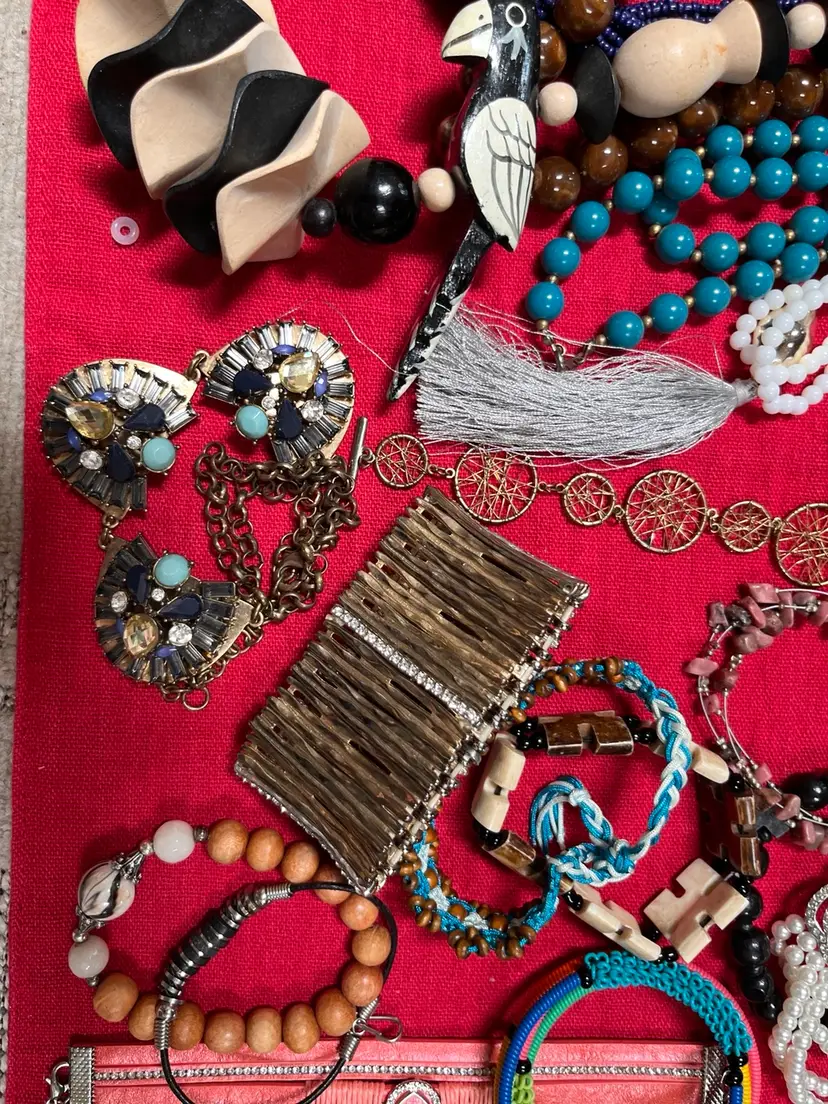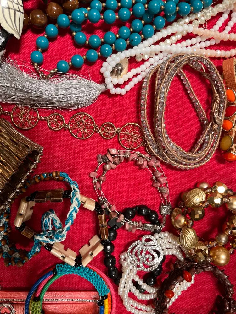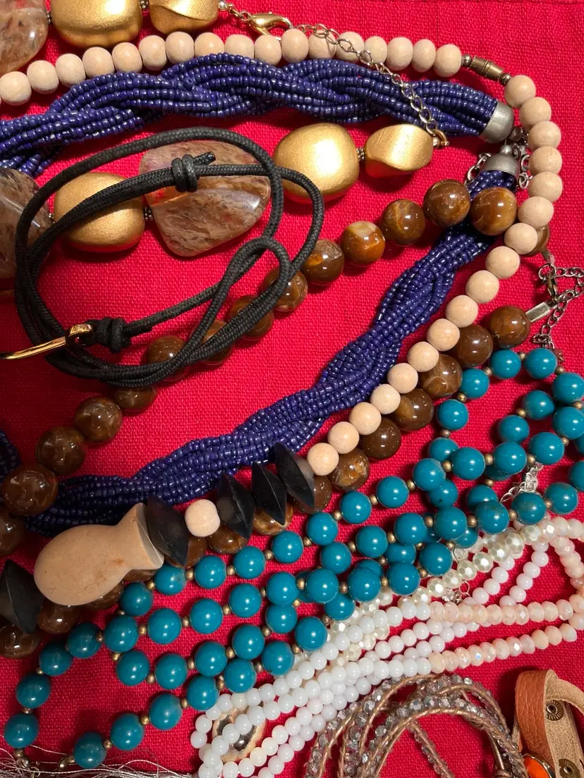 Various pieces from several decades. A few are signed. 9 Necklaces 13 bracelets Acrylic beads, stone, natural items and wood are present..