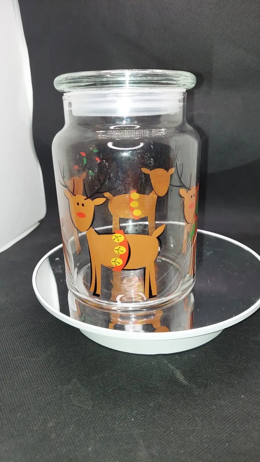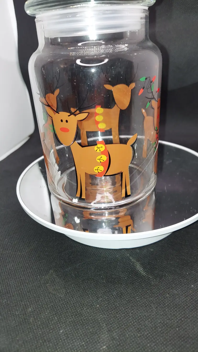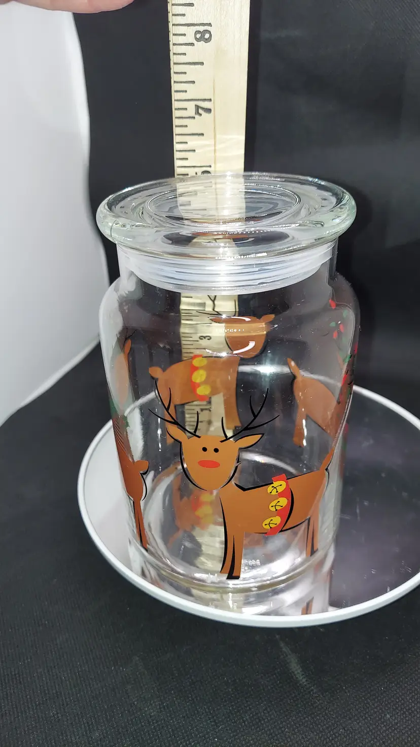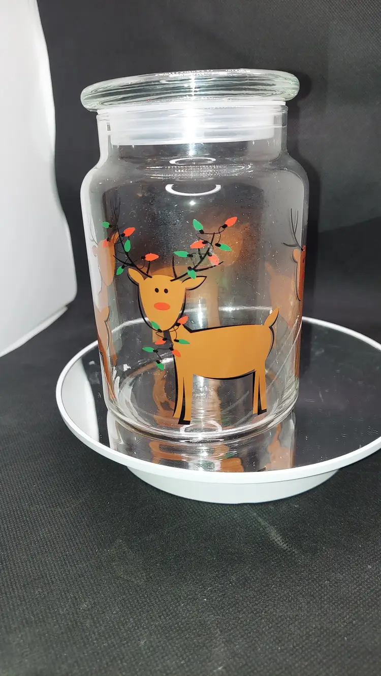 The glass container is a Hard To Find Libbey glass jar with a Christmas Reindeer Design. This specific style is often associated with the "Prancing Reindeer" holiday collection by Libbey Glass Company. The jar features a whimsical, colorful illustration of several reindeers. The Reindeer have decorative elements like Sleigh Bells, Christmas Lights and Holly Berry. Jar measures 6 inches tall and 4 inches wide and in LIKE NEW condition!! This item is cross-posted on other apps so if you love it grab it now! Also please see our other items for sale as we love to bundle to save on shipping! All of our packages are packed with love and care so rest assured it will arrive safely. Please send serious offers as we usually accept ones that are lower than competitive priced!