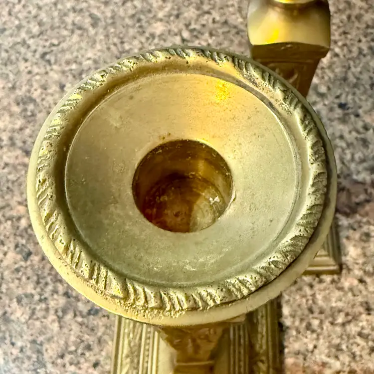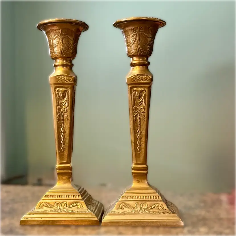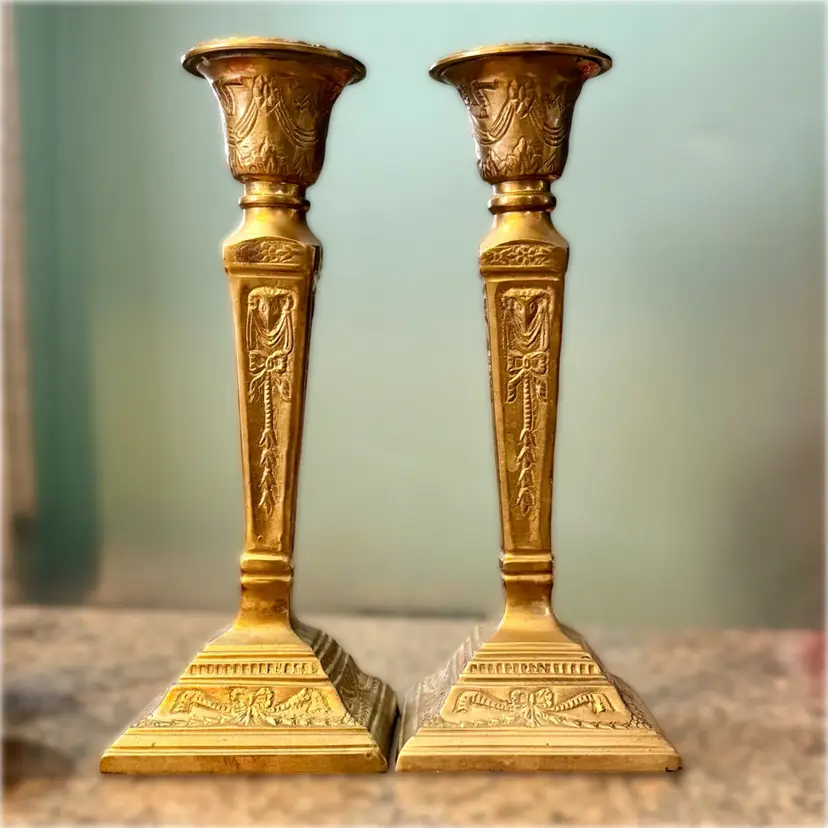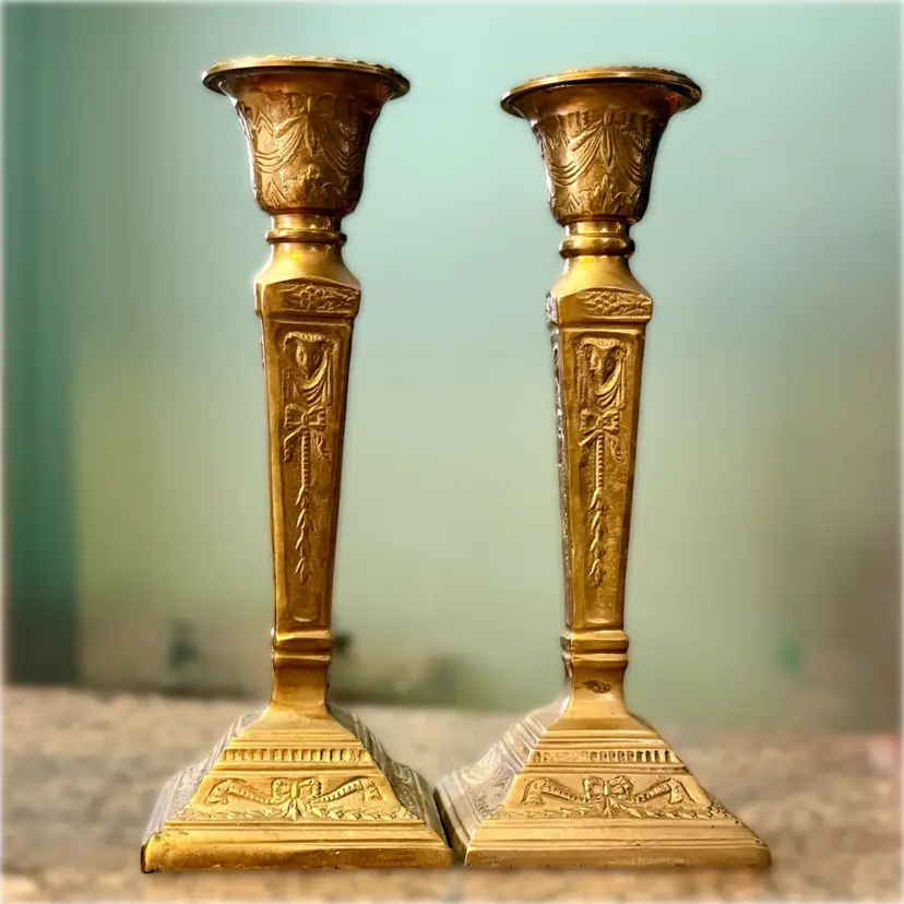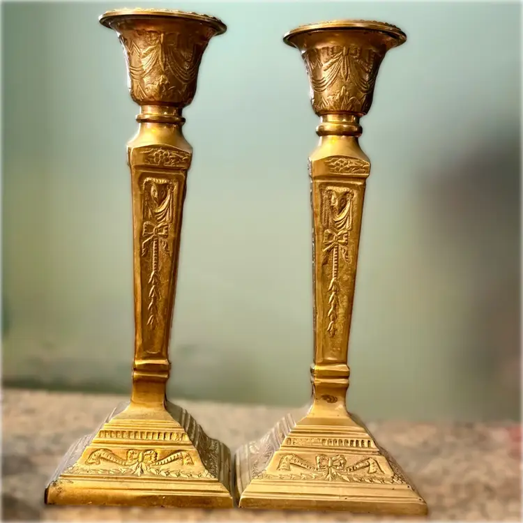 Approx 9.75” tall x 3-7/8” w at base x 2.75” across at top of taper; intact “Made in India” stickers (but Andrea Sadek sticker is not present); good vintage condition — both candlesticks have patina and slight wear due to age/use, but no issues.