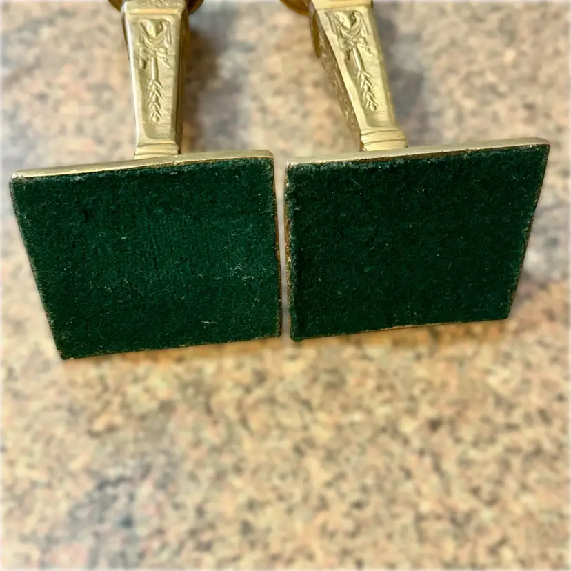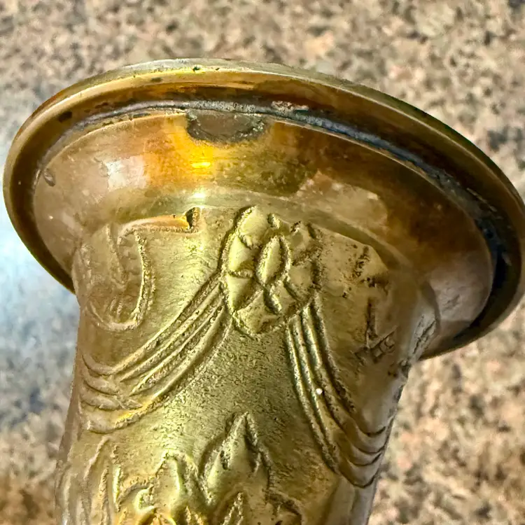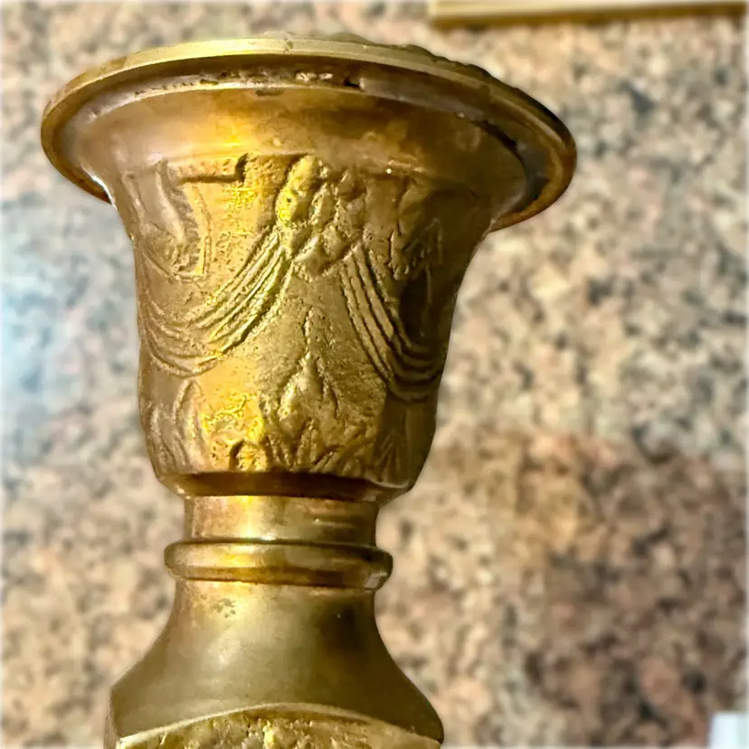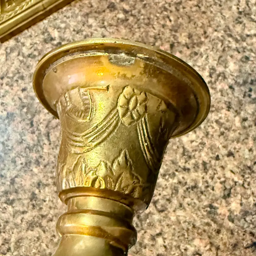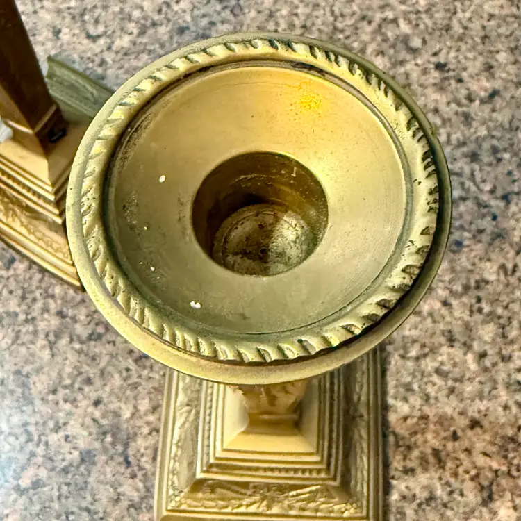Approx 9.75” tall x 3-7/8” w at base x 2.75” across at top of taper; intact “Made in India” stickers (but Andrea Sadek sticker is not present); good vintage condition — both candlesticks have patina and slight wear due to age/use, but no issues.