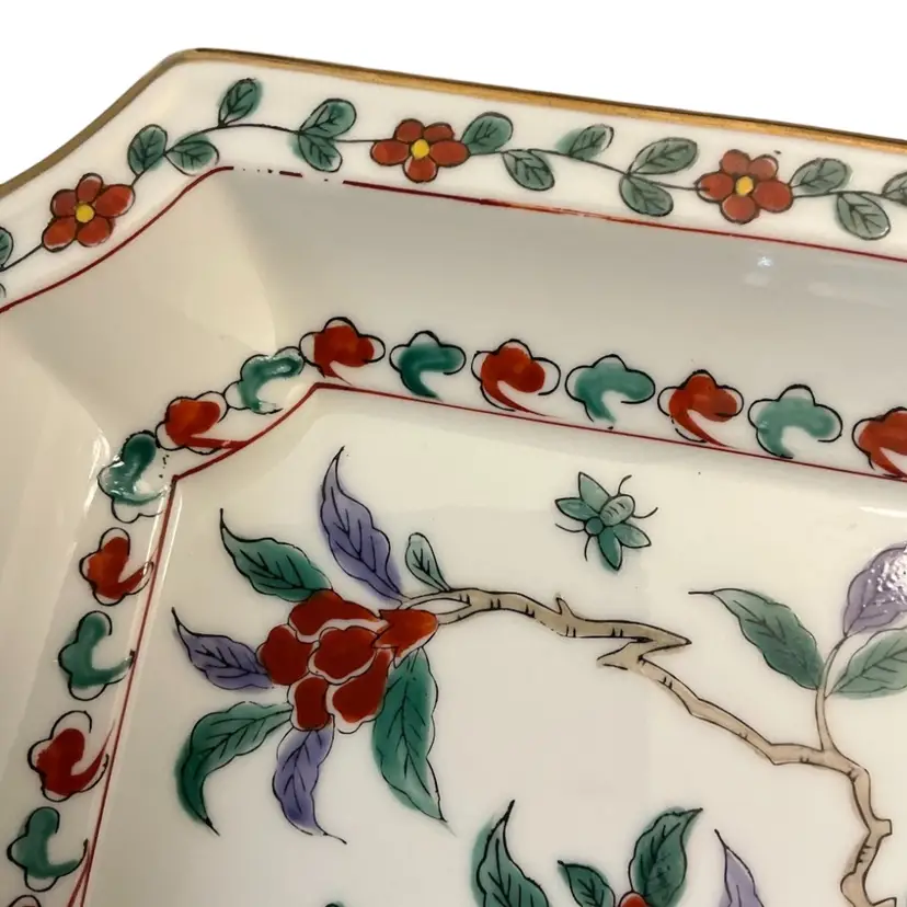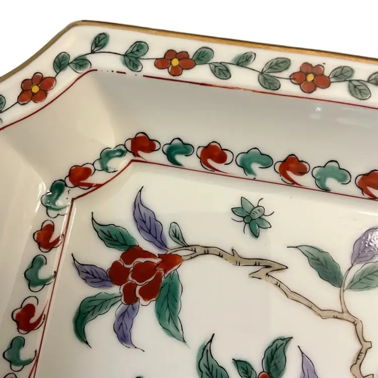 Read-Beautiful Imari style porcelain plate hand painted depicting flowers and a bee. Numbered 7938 on the back. Some paint wear on upper left corner.