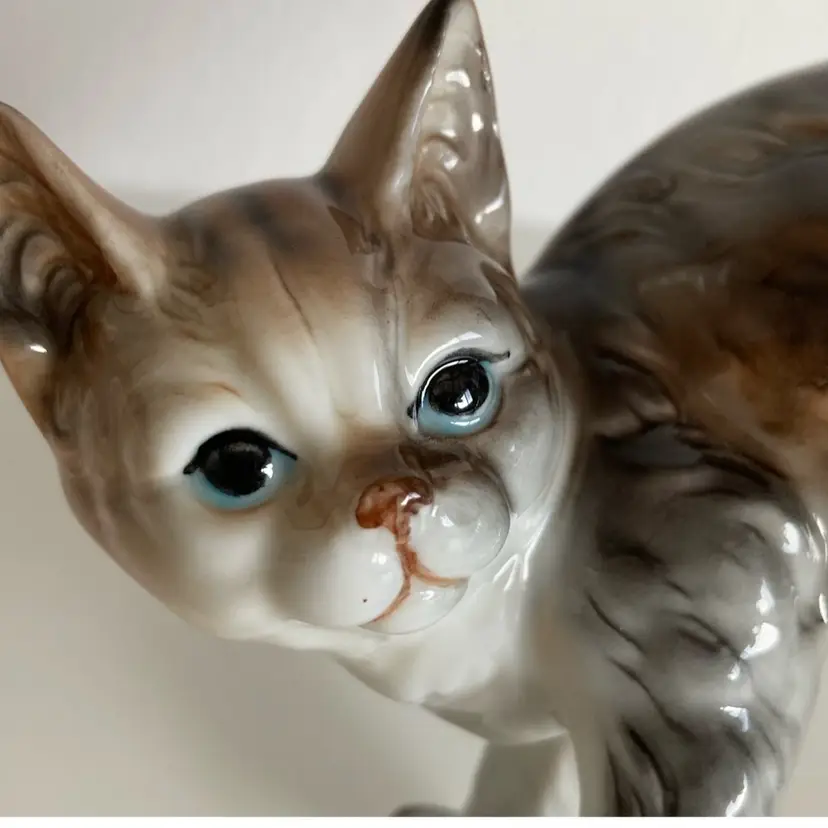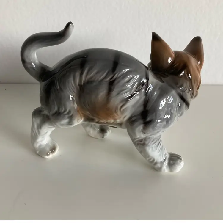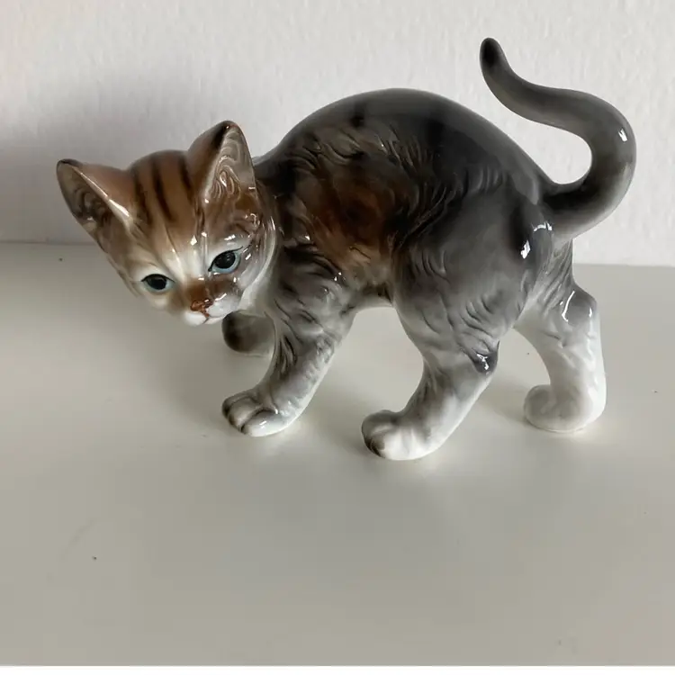 Vintage Andrea by Sadek porcelain Tabby kitten. She measures 5” x 2 1/2” x 4” tall. In good condition with original tag.