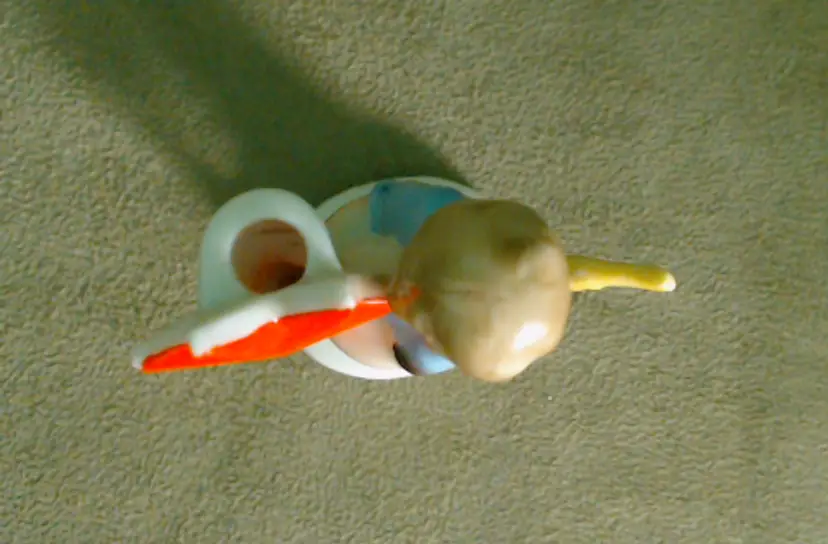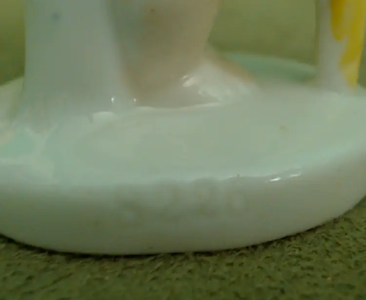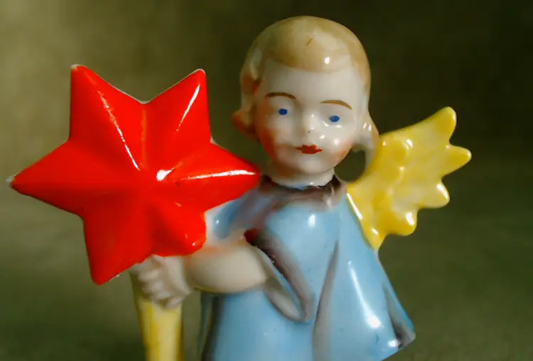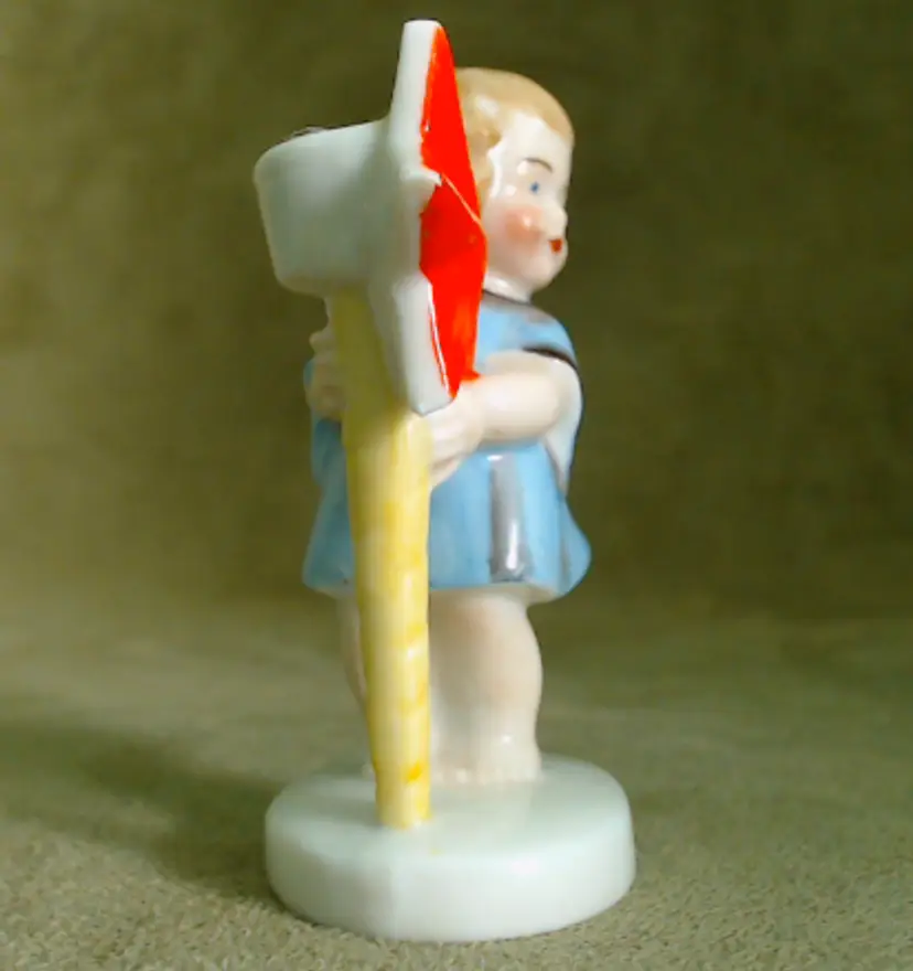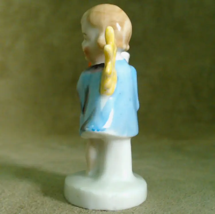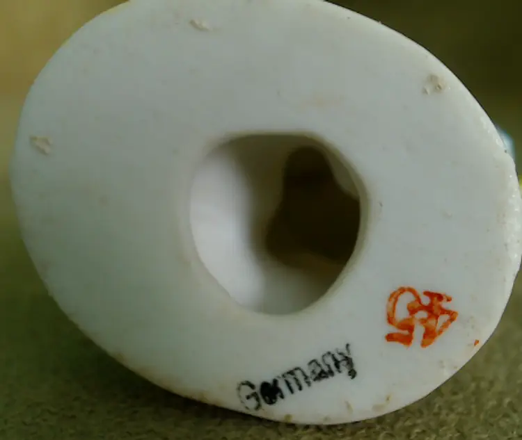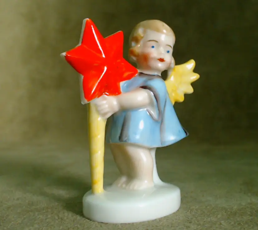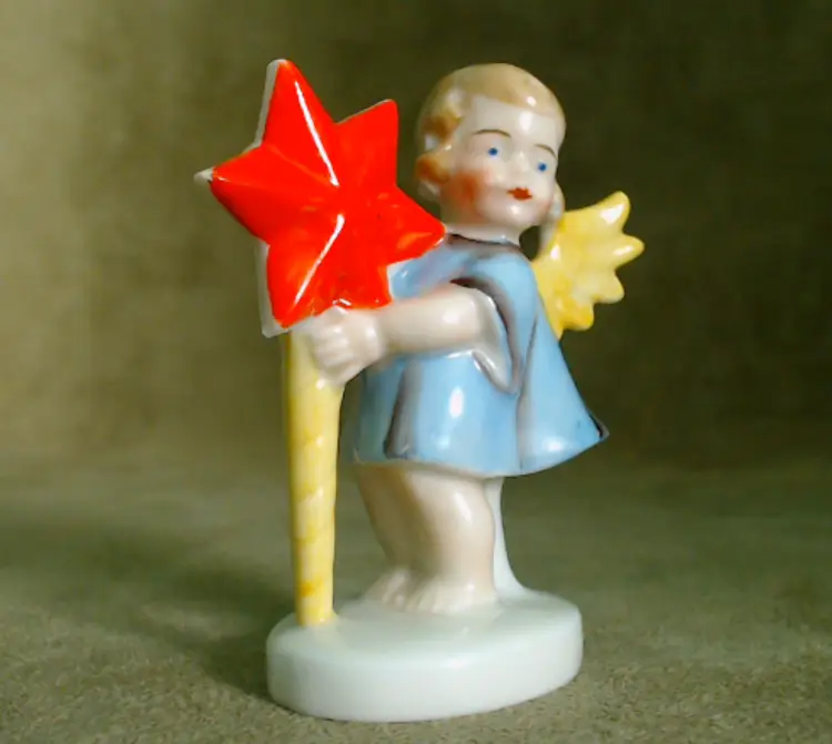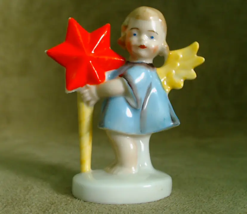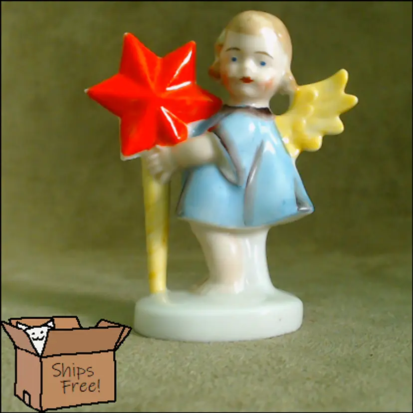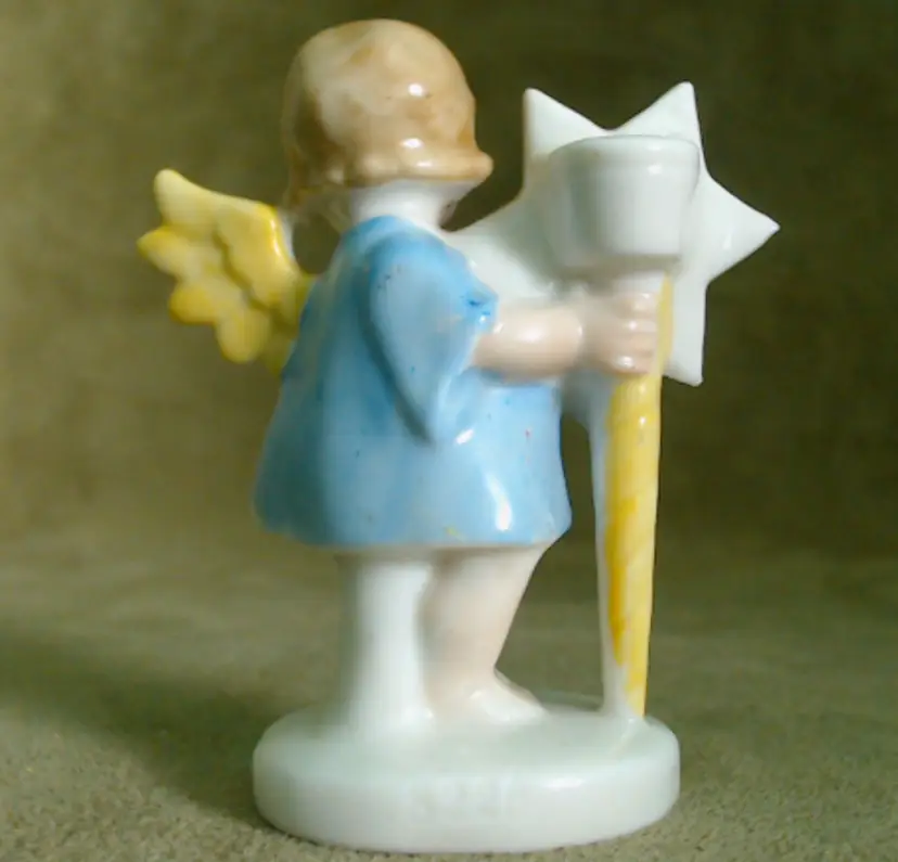 This is a vintage candle holder, shaped like a darling little angel! Made in Germany, during the late 1920s or early 1930s, she's been hand painted, and they sure went bold with her star. Her shooting star holds a single small candle, making her a perfect birthday companion! Condition: She is in Excellent shape! There are no chips or cracks, and her colors are nice and vibrant. In addition to being marked Germany underneath, she has also been impressed with the number 8226. Size: She measures 1½" across, is about 1" wide, and stands about 2¾" tall.