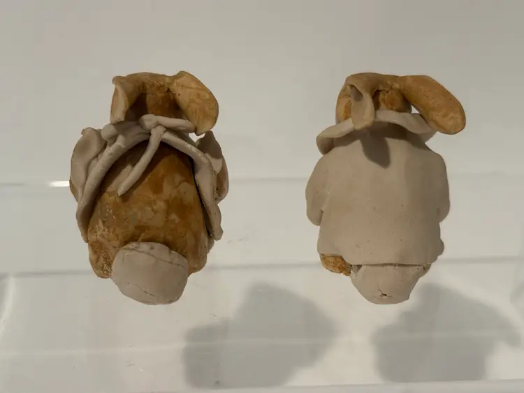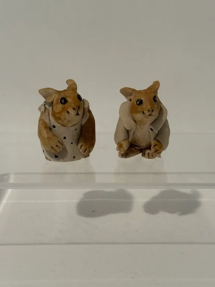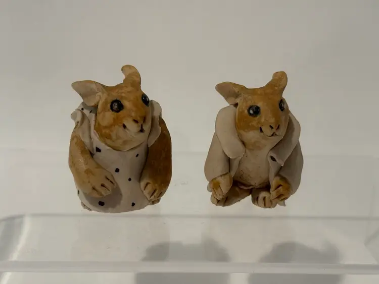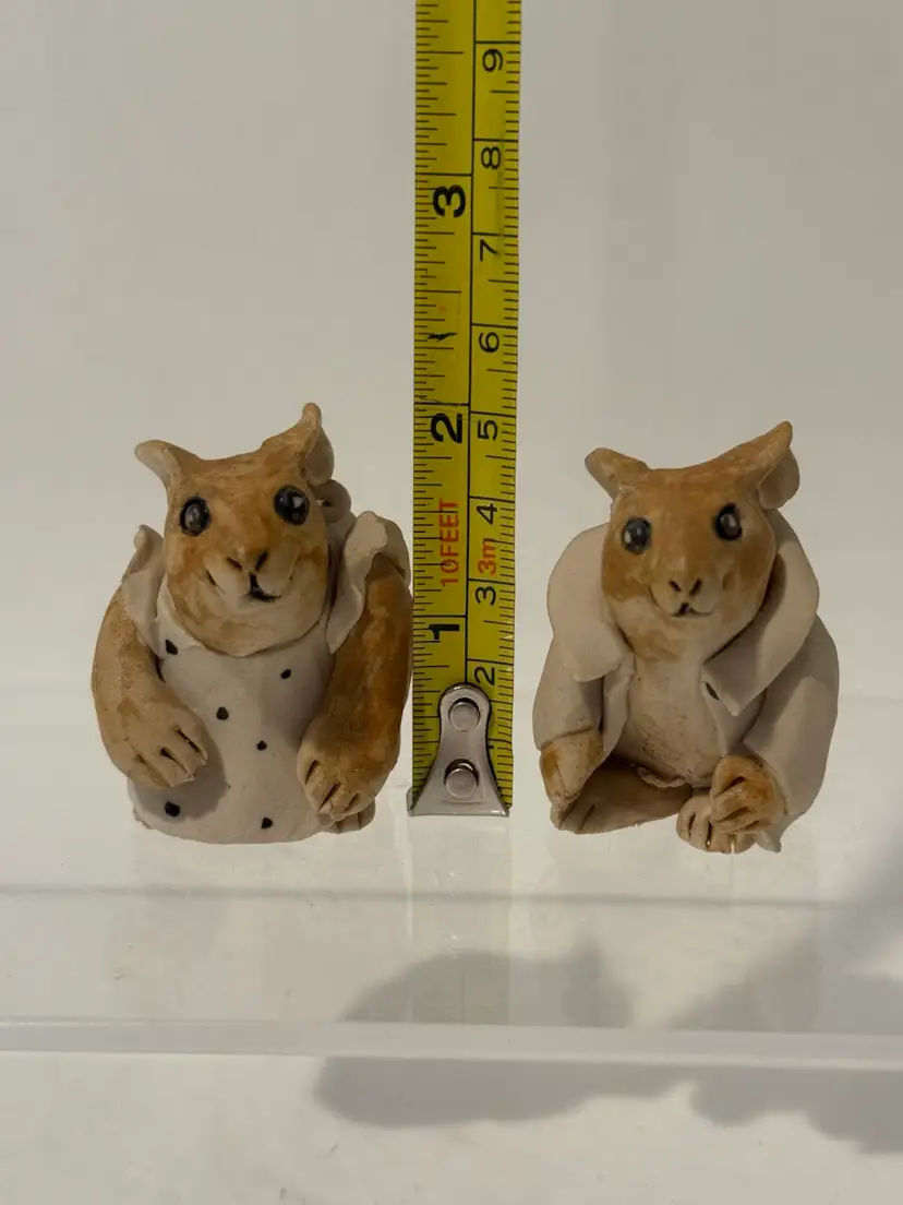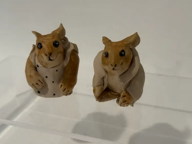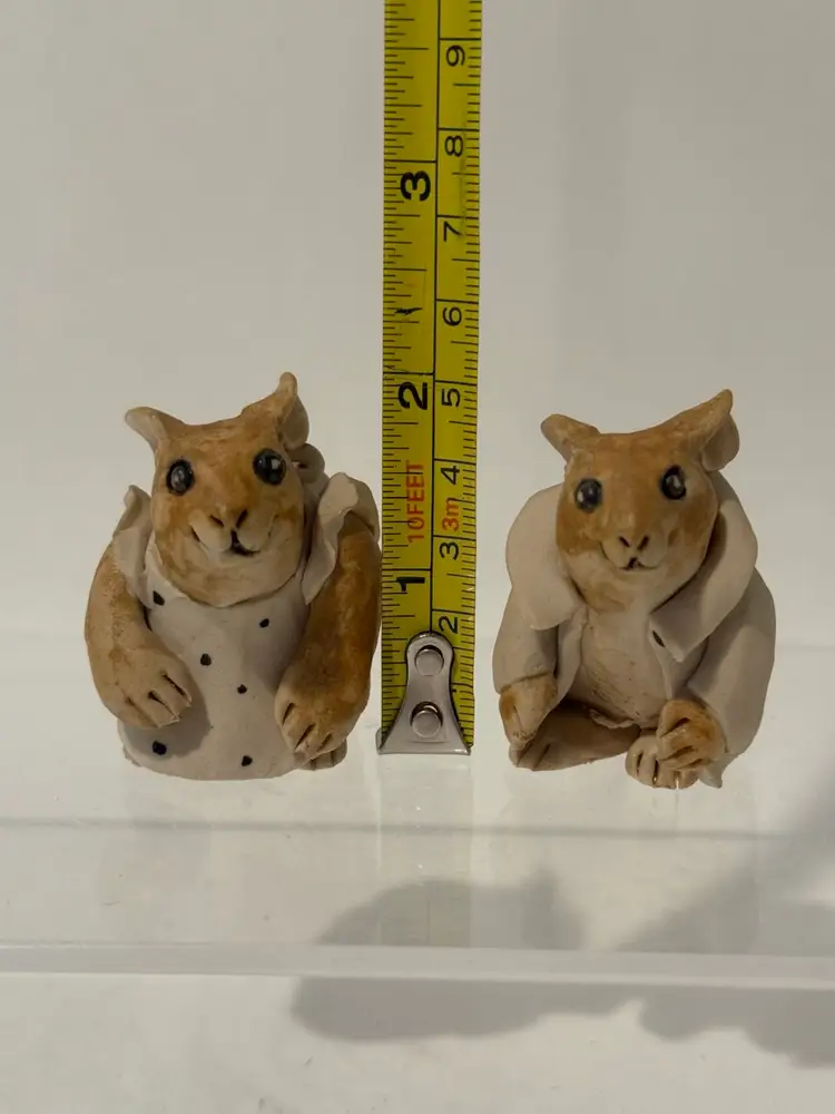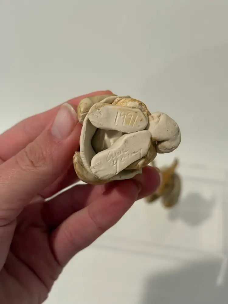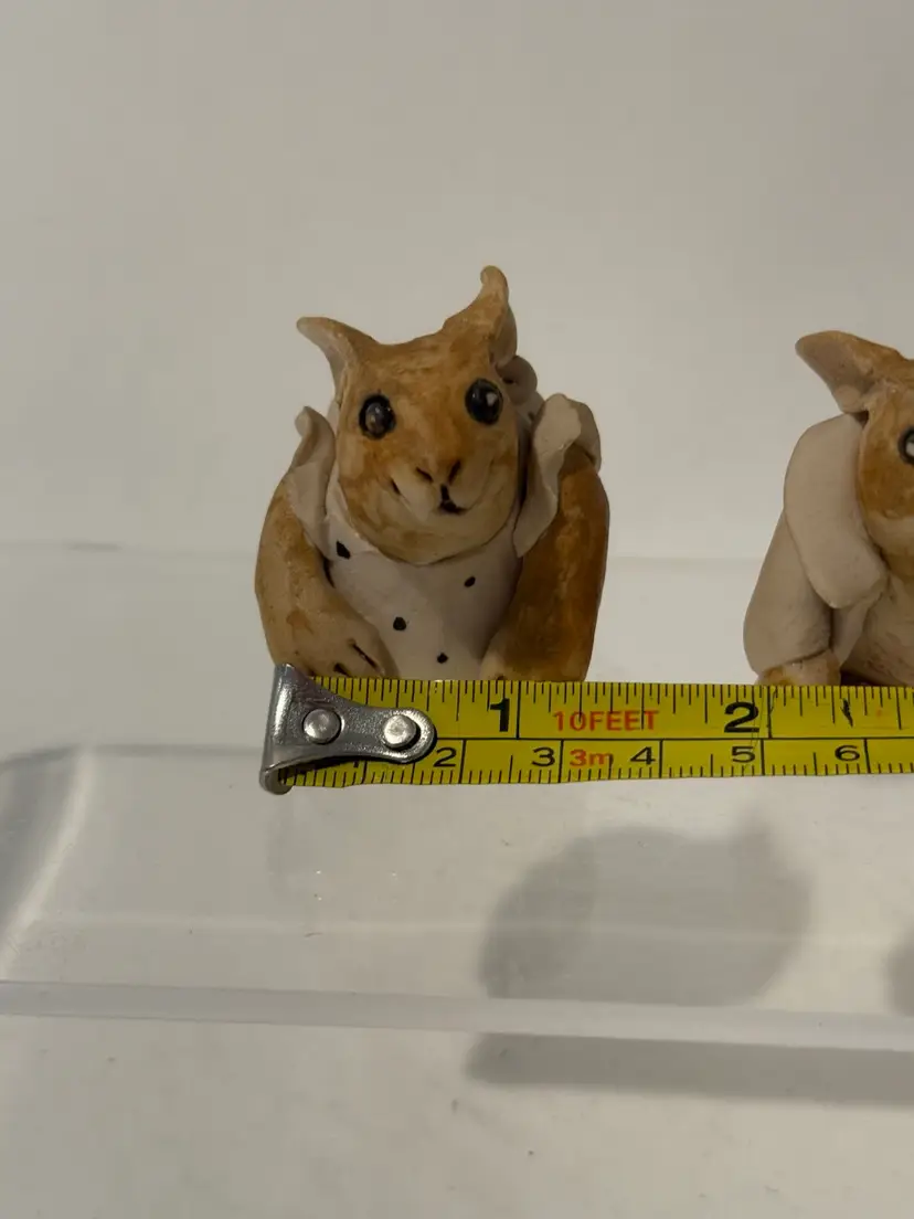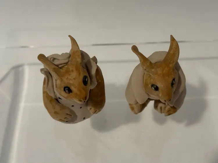 This vintage set of 2 Ann Young bunny rabbit clay figurines from 1991 features a charming couple of rabbits, perfect for collectors or animal lovers. Handcrafted from clay, these beige figurines exude a timeless appeal with their detailed design and artistry.