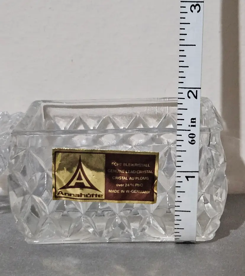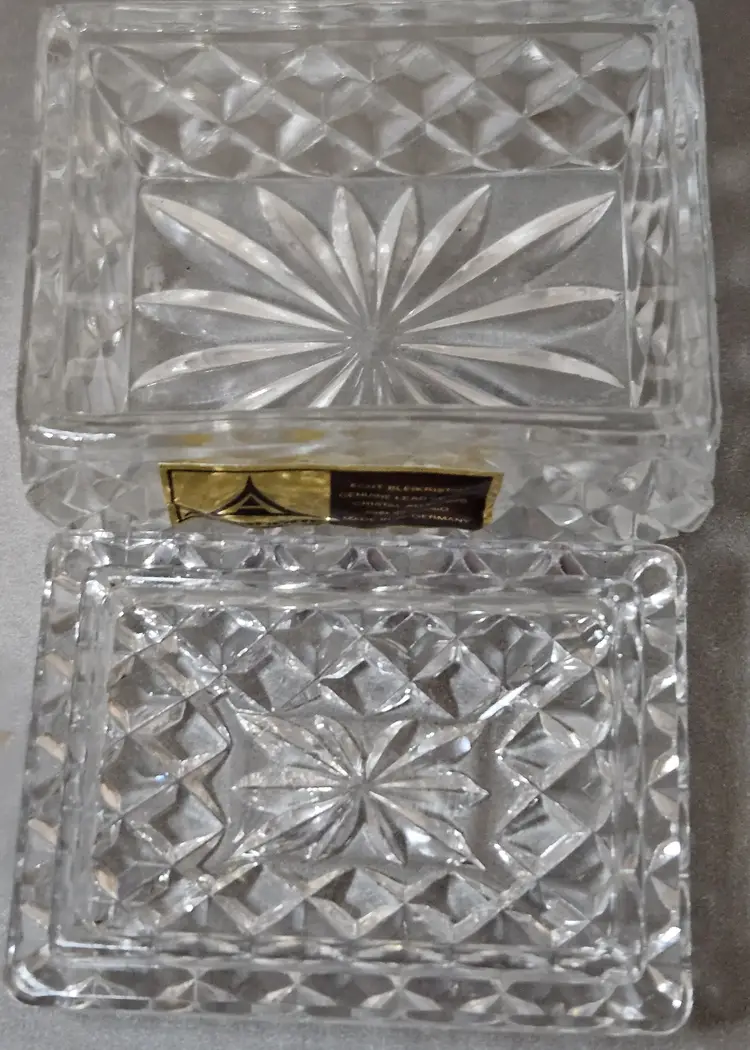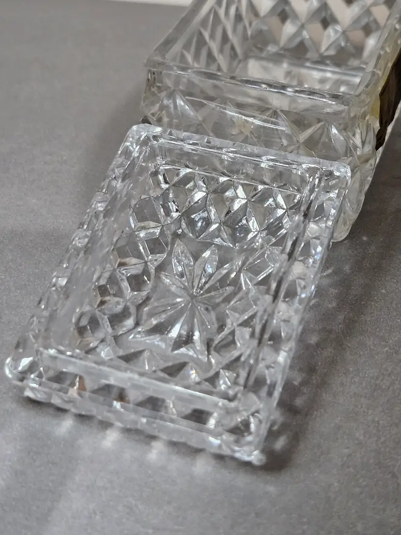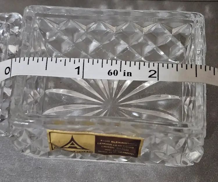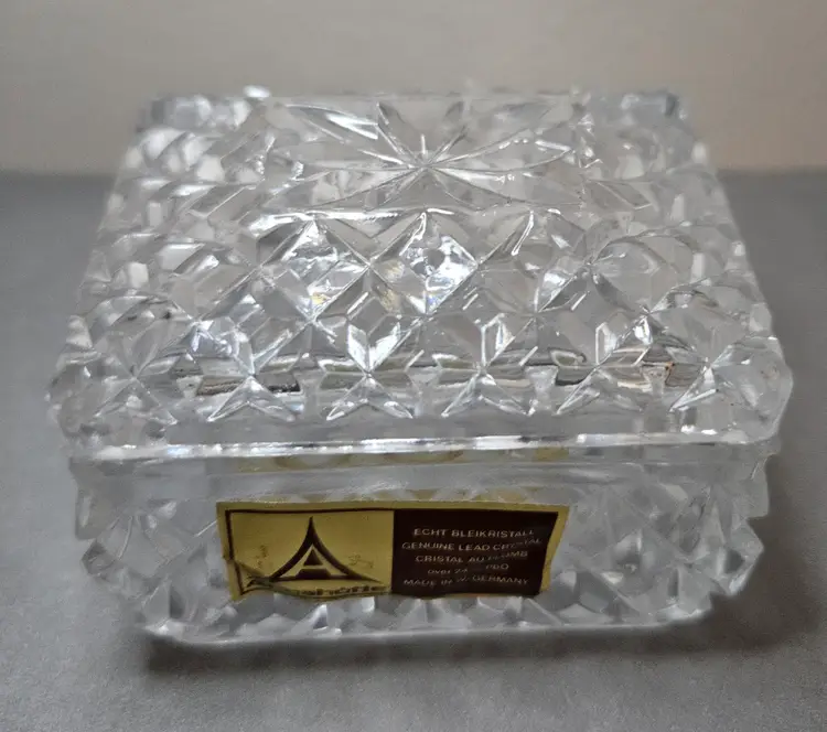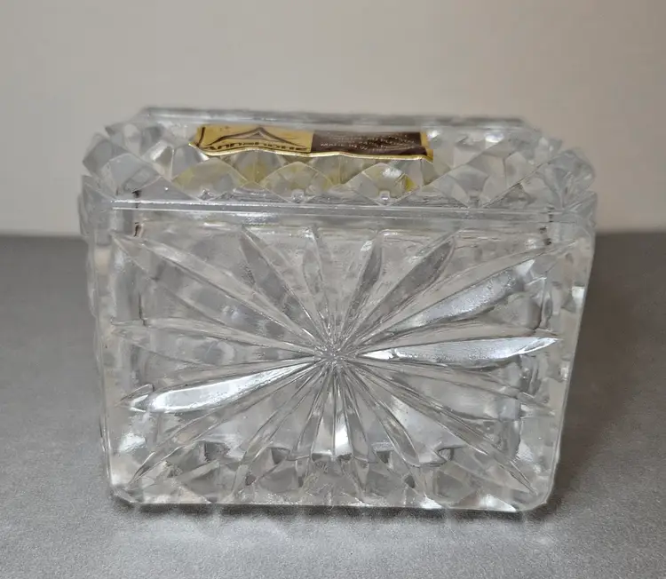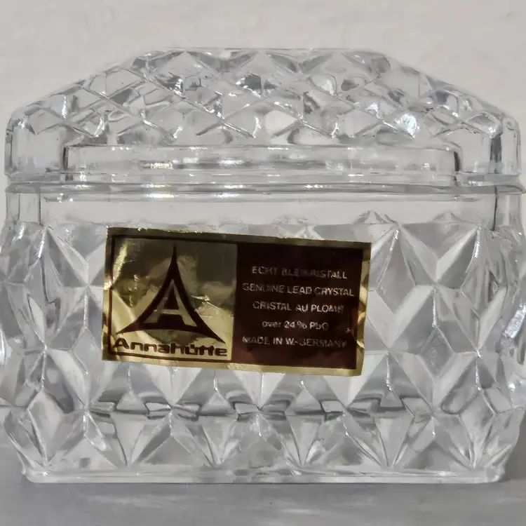 Beautiful vintage genuine lead crystal trinket box. No chips or cracks noted. Measures approx 2"H (with lid) x 2"W x 2.5"L.