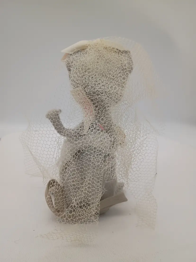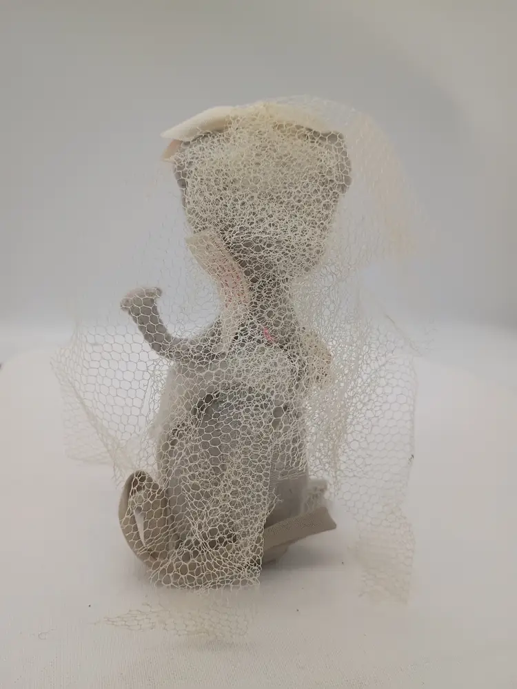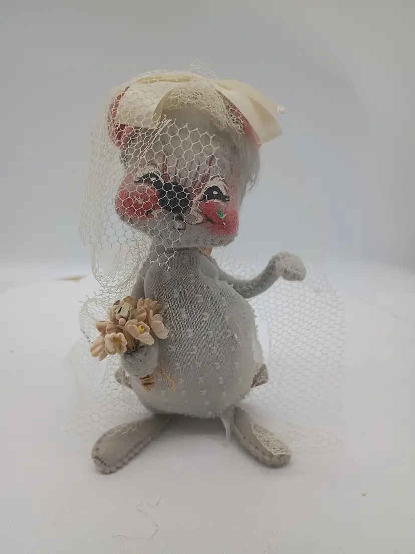 Vintage Annalee Grey Mouse Bride Doll with Bouquet 1971. This is the 6 inches tall variety. This is preowned in VG condition for age. No rips tears , holes, fraying fading odors or stains. All accessories present. No hang tag but has body tag . Ships USPS