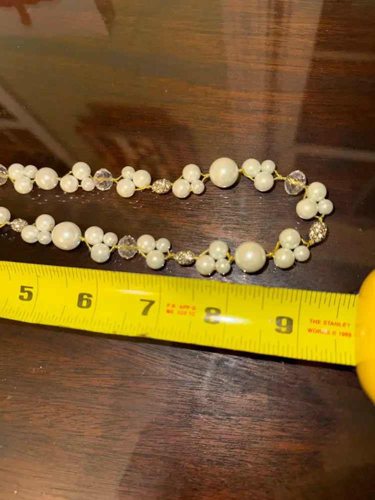 This vintage Anne Klein necklace features faux pearls and rhinestones set in a collar style design. The main stone is a round white imitation pearl, complemented by metal balls adorned with rhinestones. This signed piece of fashion jewelry measures 20 inches in length, making it a versatile and stylish accessory for any outfit.