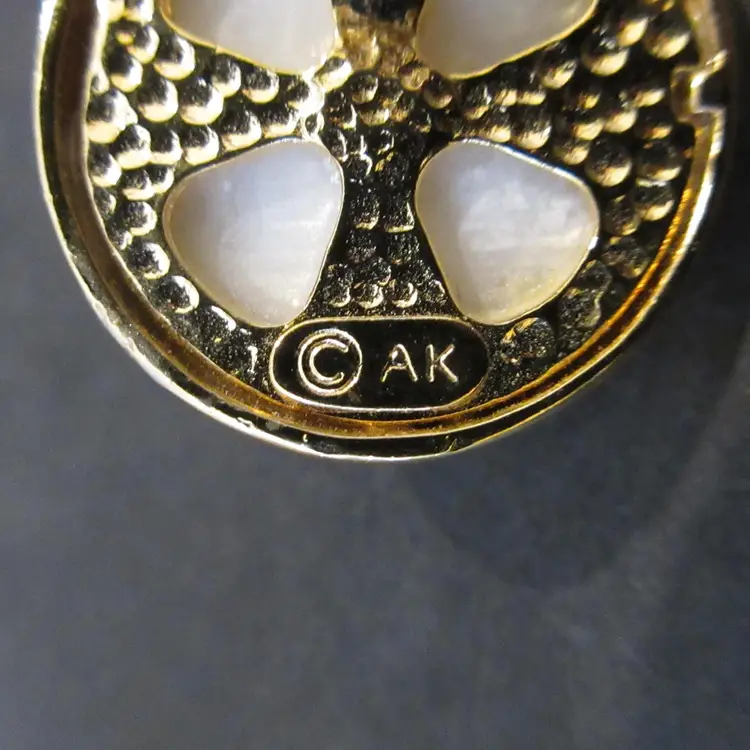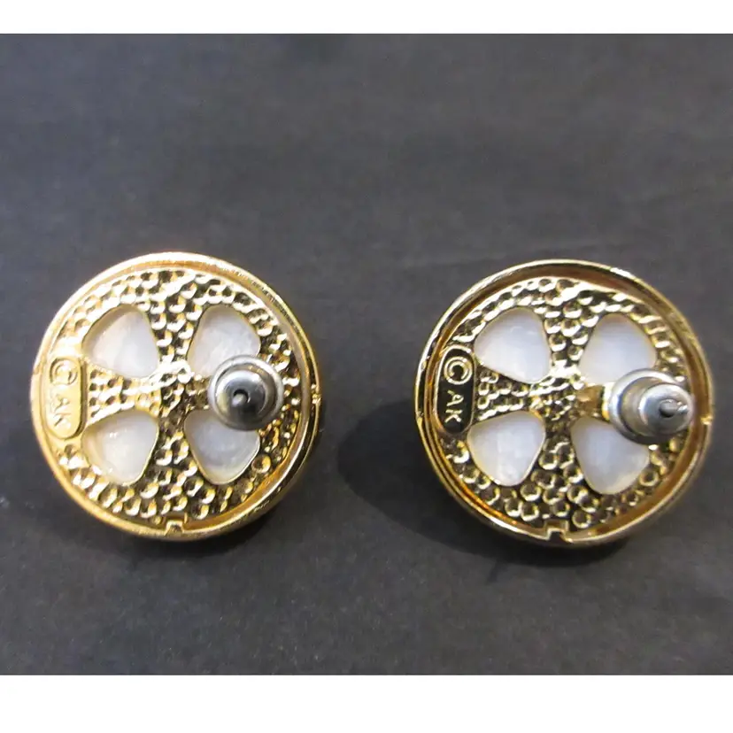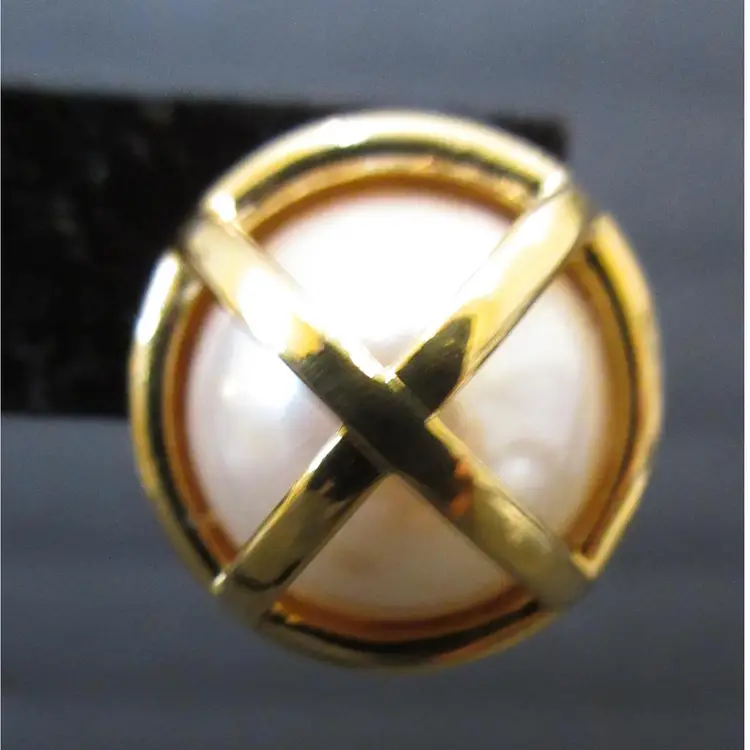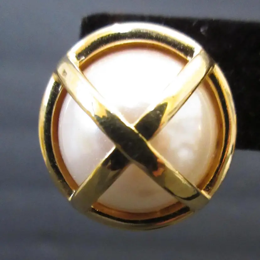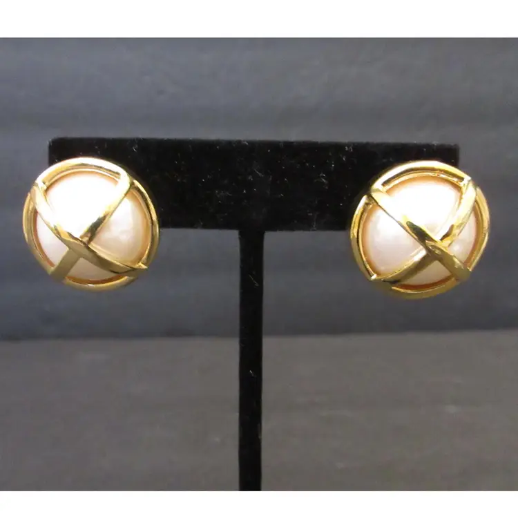 This is a BEAUTIFUL vintage pair of earrings from Anne Klein from the 1990s. The earrings are made of gold tone metal caging large faux pearls in a gold cross pattern. The earrings are 3/4 inches in diameter and have a post back with a silver tone butterfly closure.