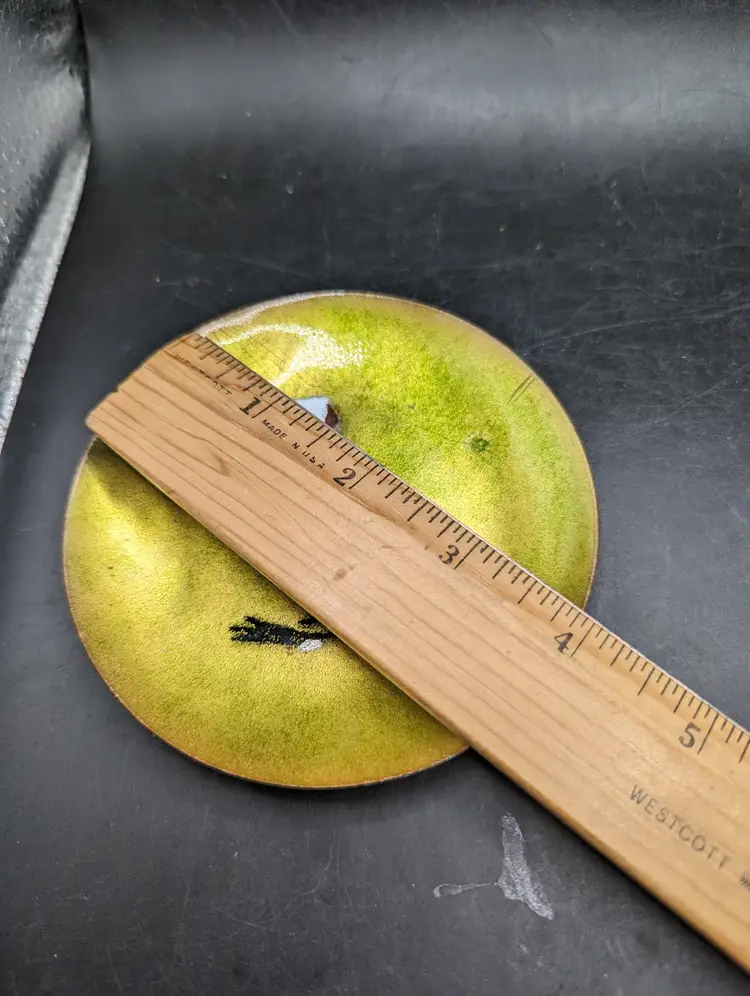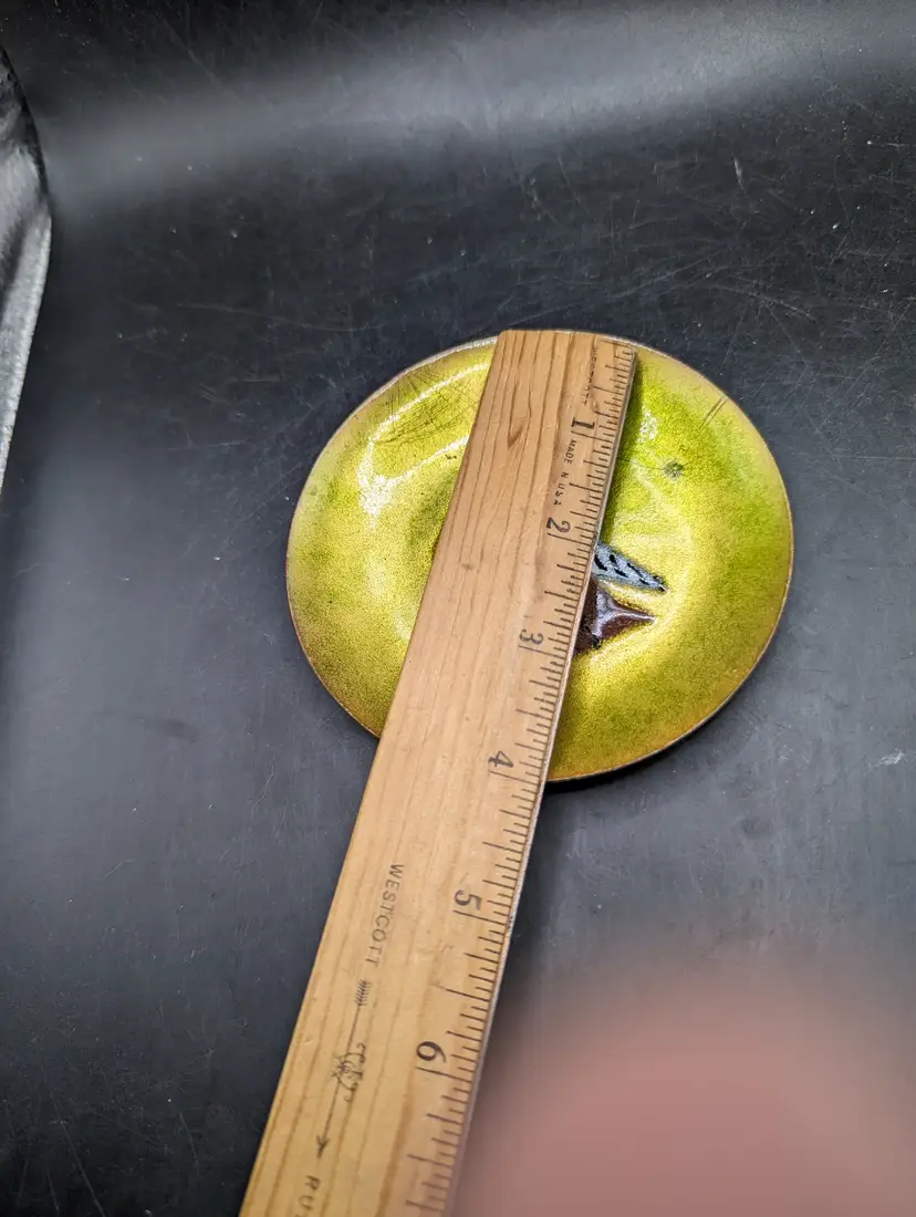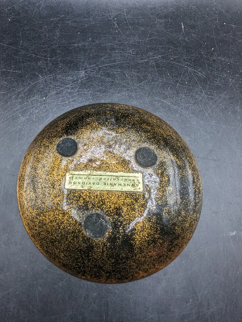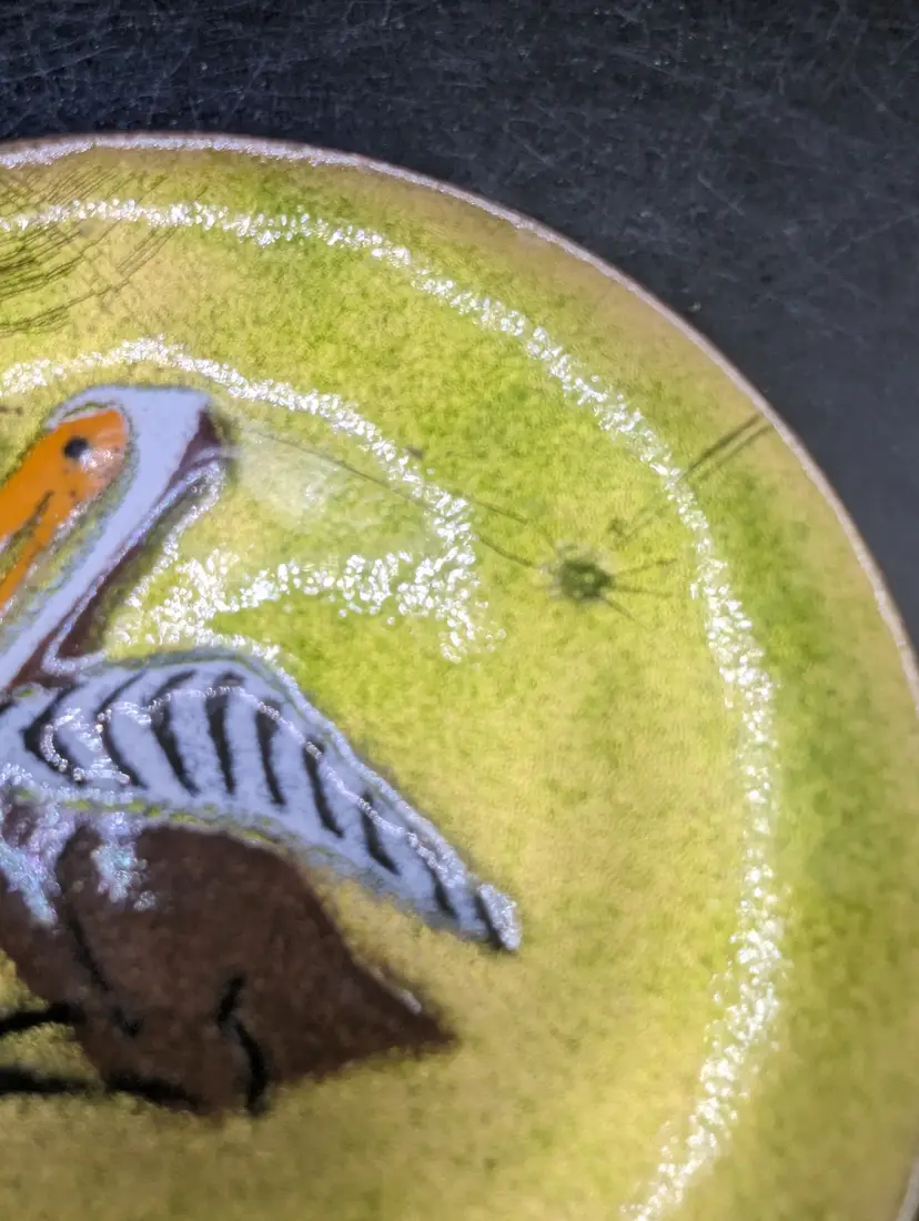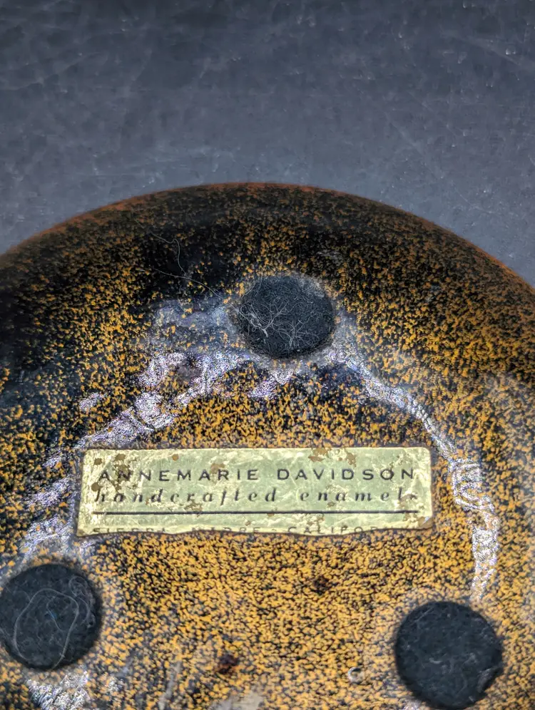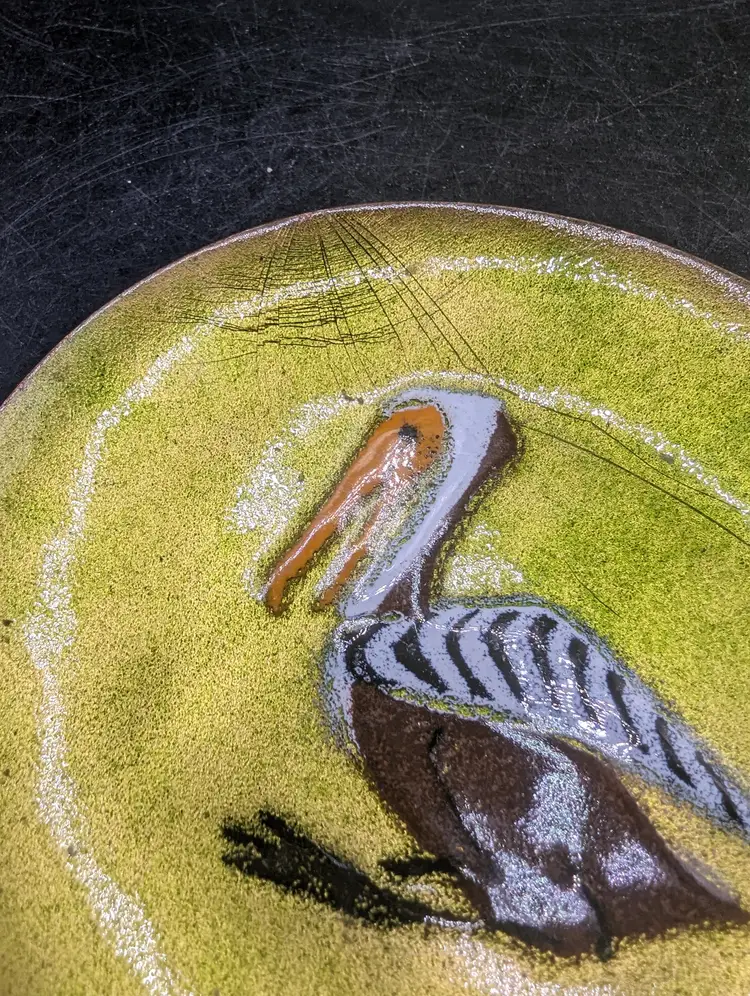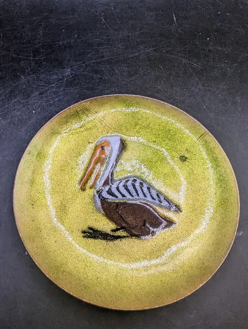 This is a lovely Vintage Annemarie Davidson Hand Crafted Enamel on Copper Bowl with Pelican. There is a flaw as seen in last two pictures. Please see all pictures for condition and measurements.