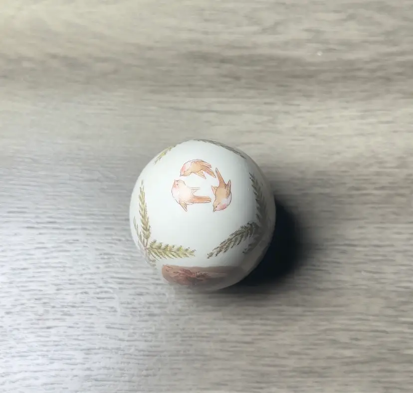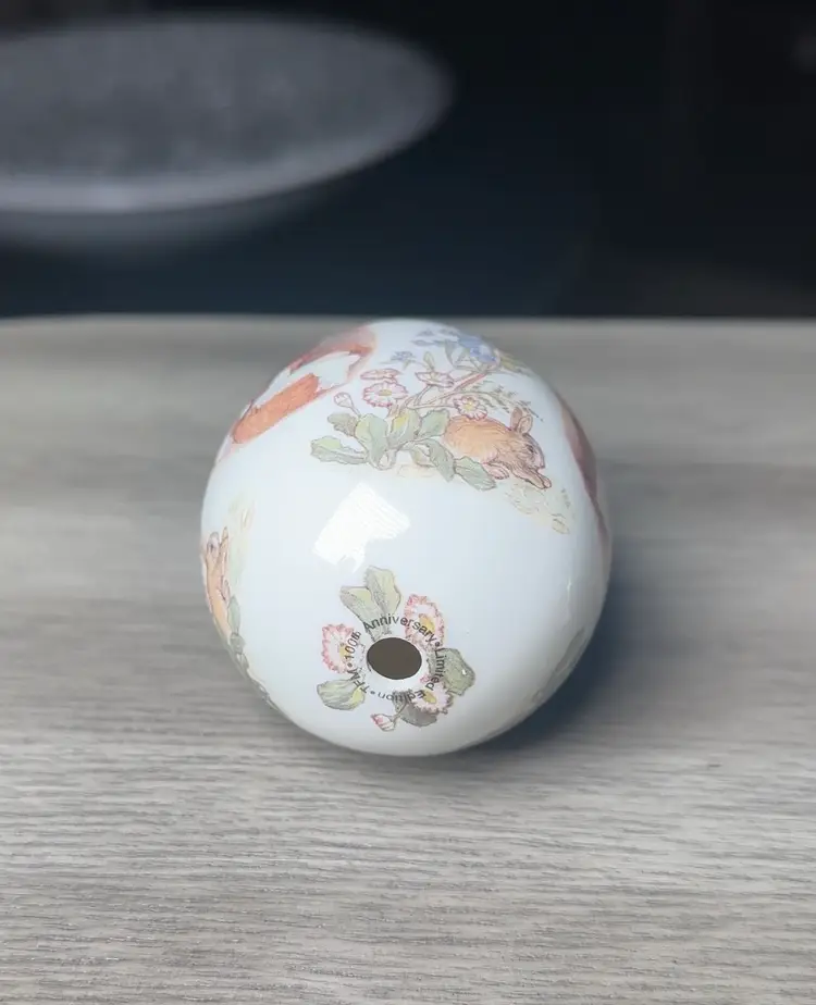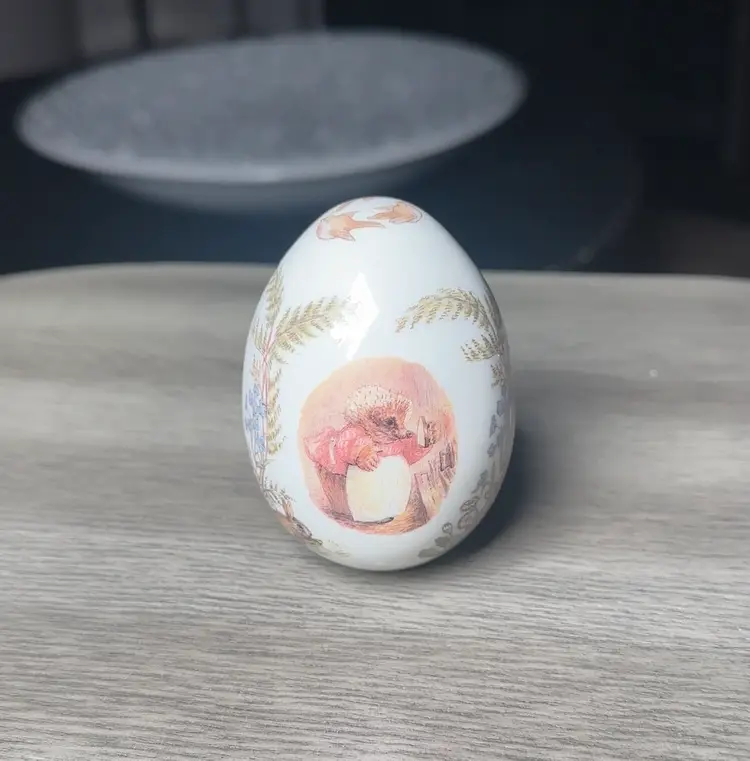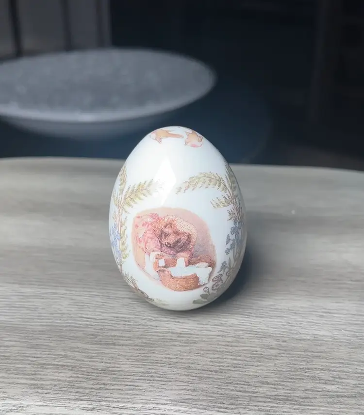 This vintage anniversary limited edition porcelain egg is a unique collector's item. Handmade with a glossy finish, this egg features intricate details of rabbits and a porcupine, making it a charming addition to any room. 3.5” x 2.5.