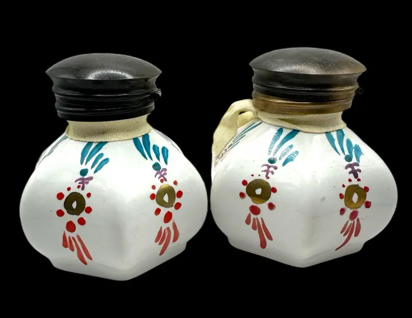 Handpainted. These measure 3.3” tall. The metal is quite tarnished, I have not attempted to clean them.